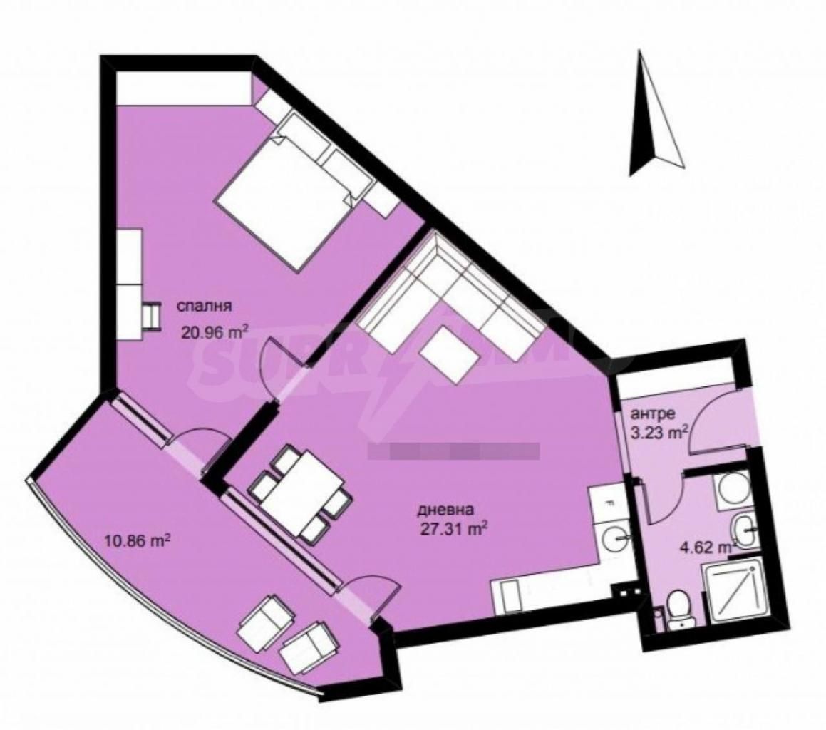 Квартира расположена на 1 этаже и имеет площадь 85 м2, на которой расположены: гостиная зона с кухней с бассейном, спальня, совмещенная ванная комната и прихожая.