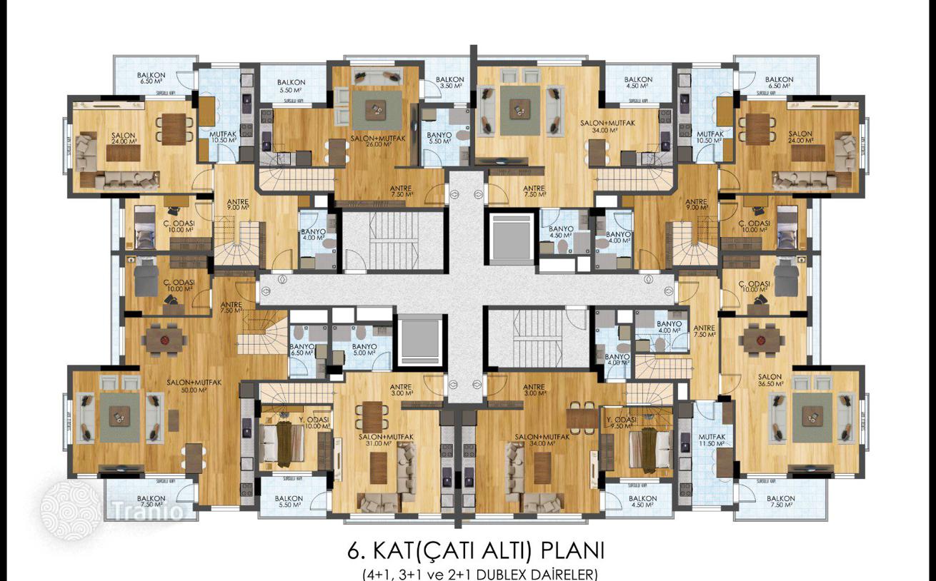 Площадь застройки 7.000 м². Будет построен 8-этажный жилой дом по 6 квартир на этаже различной планировки 2+1, 3+1, 4+1.