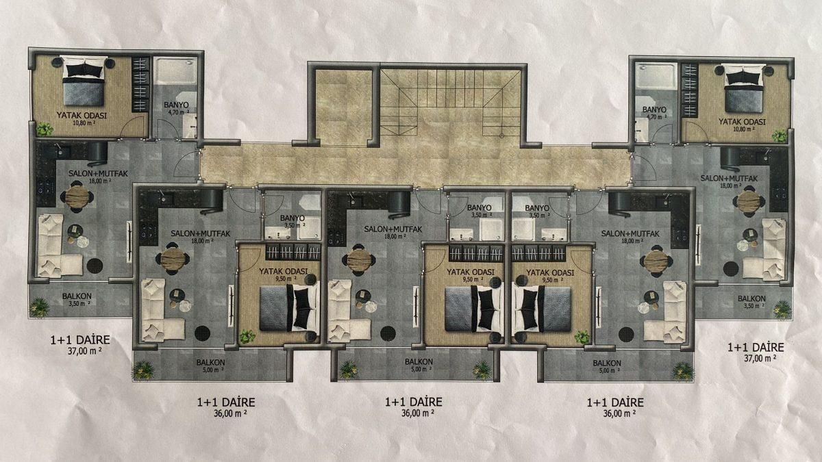 Приветствуем вас в нашем новом жилом комплексе в городе Авсаллар! Мы предлагаем вам купить однокомнатную квартиру площадью 37 кв.м. на втором этаже нового дома.
