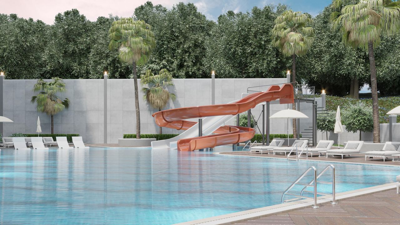 Дом оснащен всем необходимым для комфортного проживания: бассейн, детские площадки, фитнес-центр, лифт, охраняемая парковка. Расстояние до моря составляет всего 1800 метров, а до центра города – 1000 метров.
