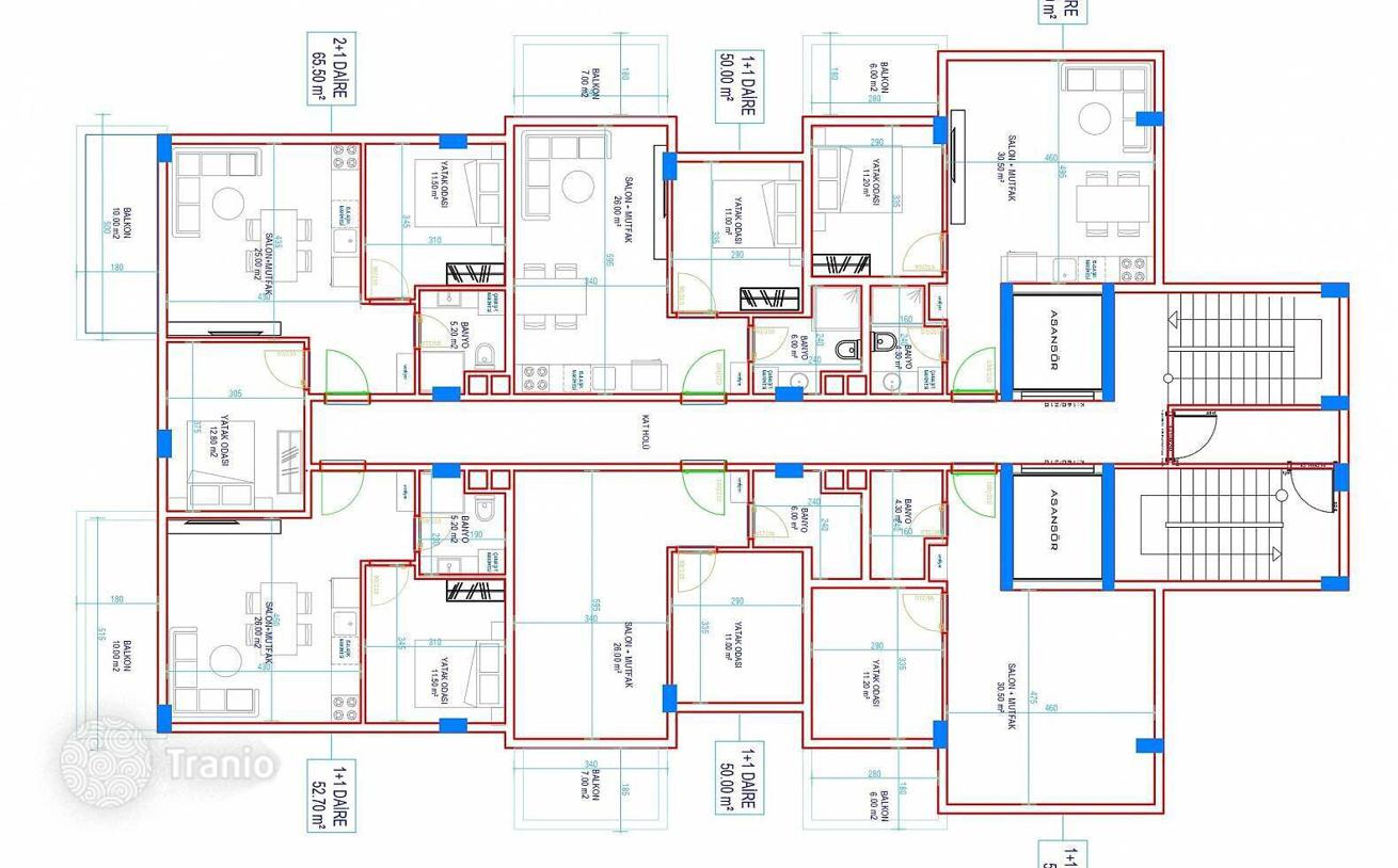 В проекте представлены варианты квартир 1+1, 2+1 и дуплексы 3+1. Квартиры оснащены окнами ПВХ с двойными стеклопакетами, гардеробной, видеодомофоном, центральной спутниковой системой, водонагревателем, гидрофором, стальной входной дверью.