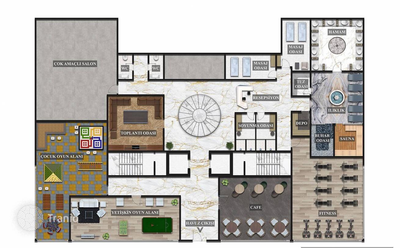 Недвижимость в Алании находится в комплексе, на территории которого есть бассейны с подогревом, аквапарк, услуги консьержа, турецкая баня, сауна, римская парная, спа и массаж, игровая комната, детская площадка, конференц-зал, ванные комнаты, тренажерный зал, кафе, ресторан, площадка для барбекю, парк, беседка, места для принятия солнечных ванн, автостоянка, генератор, спутниковая антенна, wifi-интернет и консьерж.