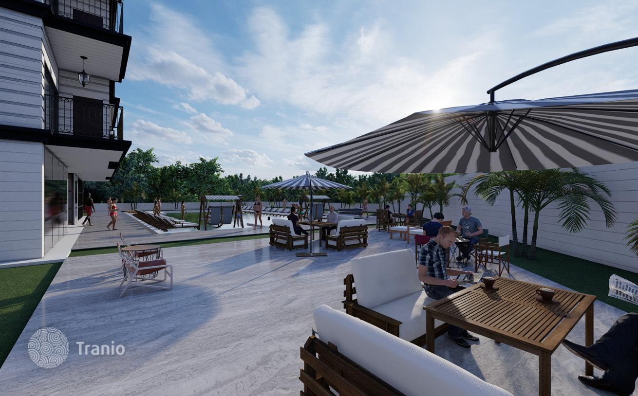 Общая площадь апартаментов 55 м². Квартира находиться на 2 этаже, 9-ти этажного дома. В квартире одна спальная комната, гостиная с кухней американского типа, 1 санузел с душевой кабиной, 1 балкон.