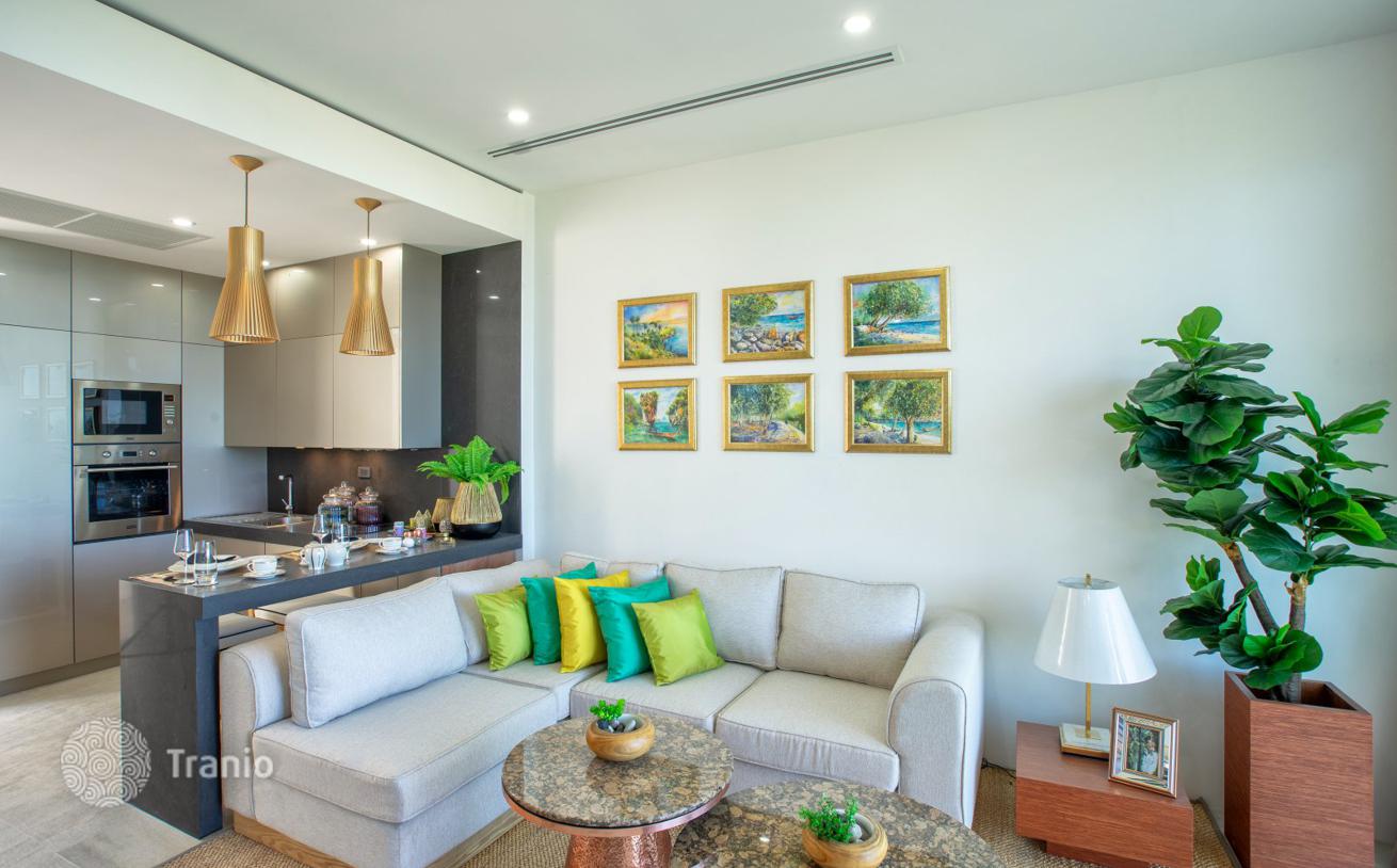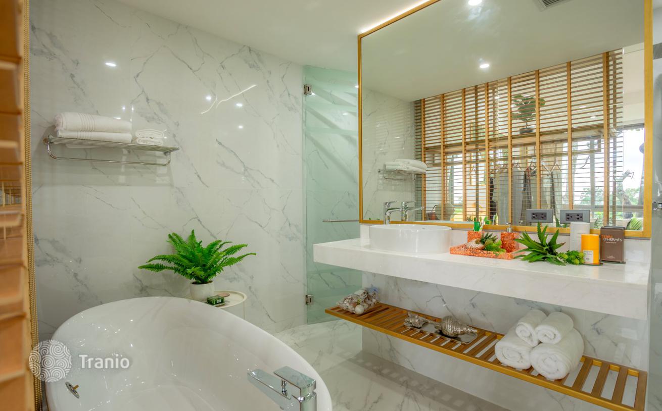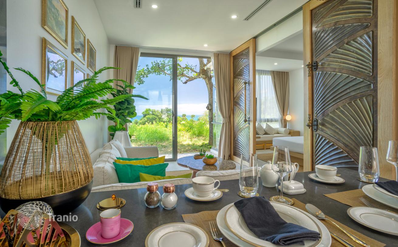 Просторная квартира 88. 5 м² с двумя спальнями и двумя ванными комнатами. Из окон открывается замечательный вид на сад с тропической зеленью. Особенностью квартиры является высота потолка — 3.2 м, что значительно выше общепринятых стандартов. Квартира полностью меблирована и оборудована техникой. Гостиная совмещена с кухонной зоной и столовой. На балкон, который скорее назовешь трассой, можно попасть из гостиной и второй спальни. Площадь мастер-спальни позволяет выделить и оборудовать место для отдыха у панорамного окна. В ванной комнате, прилегающей к мастер-спальне, помимо душевой зоны, установлена ванная. Квартира располагается на 1-м этаже, угловая, т. ч. наличие соседей предполагается только с одной стороны и соединение проходит со стеной ванной комнаты. Данная квартира расположится в бутик-комплексе состоящем из 3-х зданий всего по два этажа каждый. В зоне резиденции находится 51 юнит, только с одной и двумя спальнями. Проживающие в резиденции смогут наслаждаться панорамным видом на море и закат у бассейна на крыше, а также пользоваться инфраструктурой отельной части комплекса: несколько бассейнов 2 спортзала СПА 2 ресторана регулярный автобус до пляжа Карон эко-парк размером 32 000 м² детский клуб и детский бассейн ресепшн 24/7 Квартиру можно использовать для личного проживания или передать в управление отельному оператору и получать пассивный доход. Репутация и опыт УК с мировым именем гарантирует стабильно растущий доход из года в год. По самым пессимистичным расчетам, можно говорить о прибыли от 7% годовых. Помимо квартир с видом на горы и сад, как описано выше, в наличии квартиры с панорамным видом на море. Стартовая цена — 13 098 000 ТНВ (378 600 $) Предложений на данный момент осталось ограниченное количество.