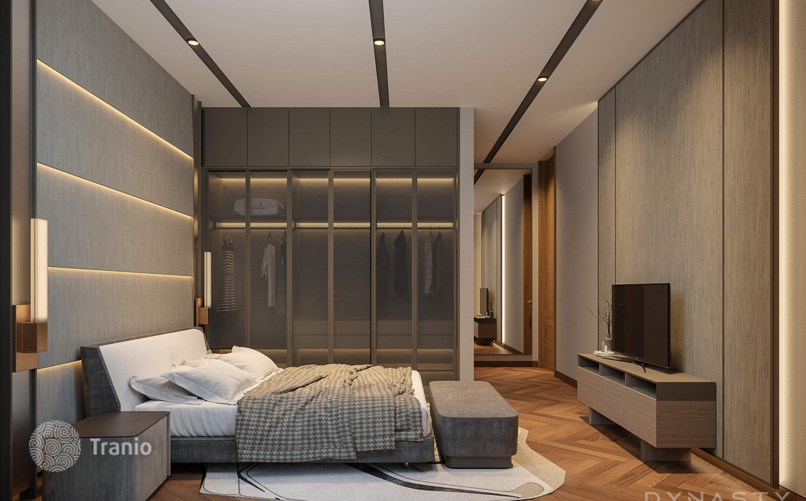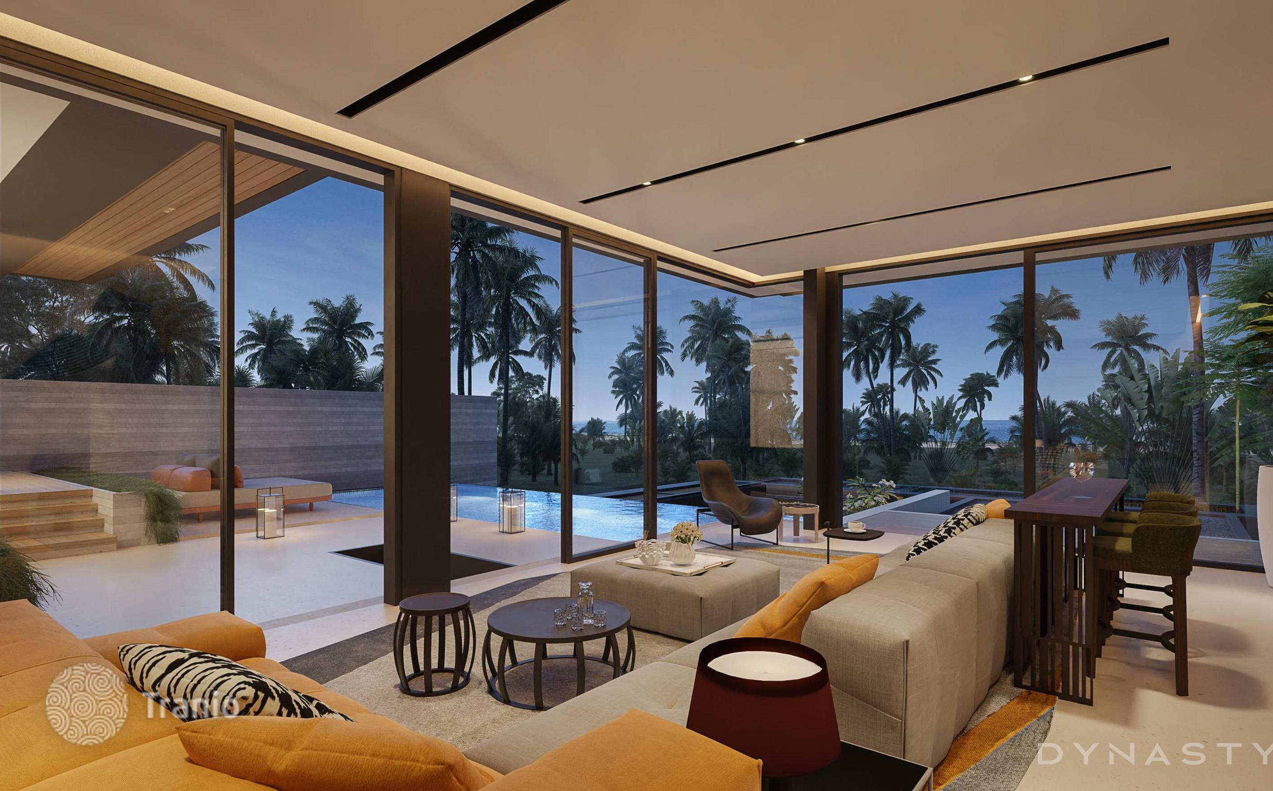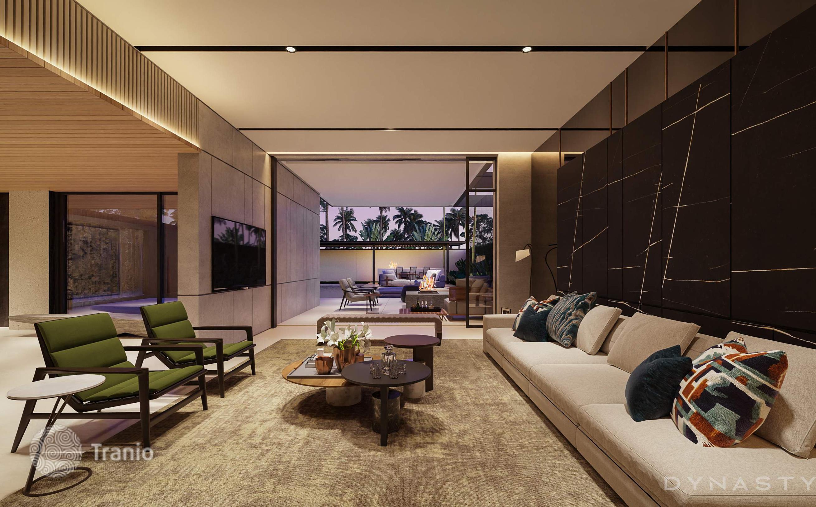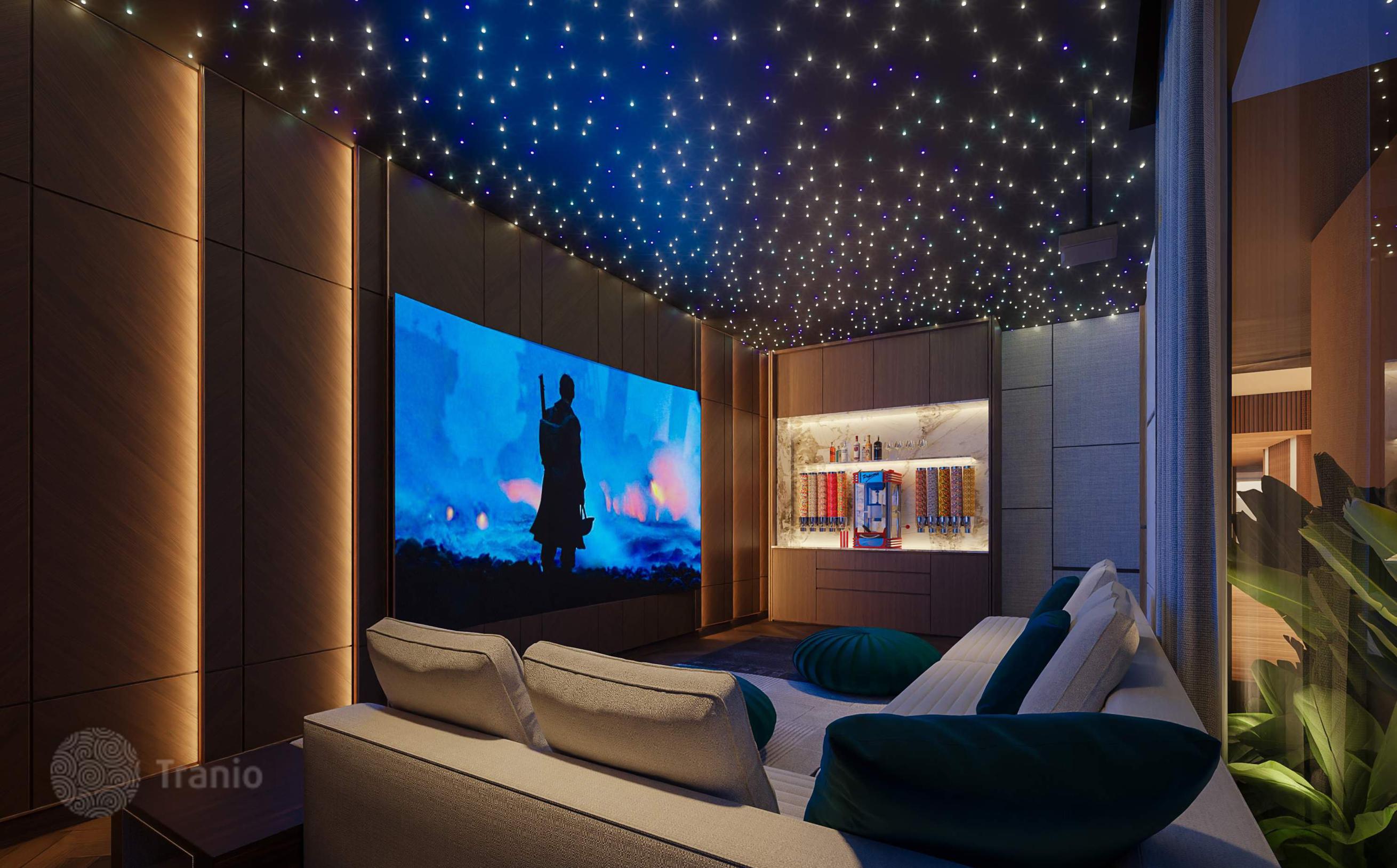 Дом включает 4 спальни, 6 ванных комнат, просторную гостиную, кинотеатр и тренажерный зал.