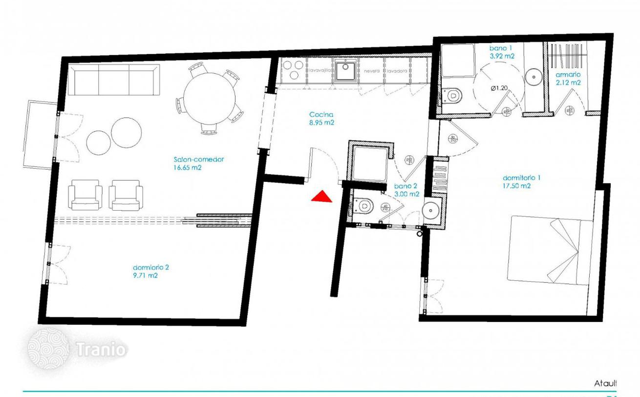 Квартира продается с мебелью. Имеет 2 спальни, 2 ванные комнаты и гостиную-столовую с отдельной кухней.