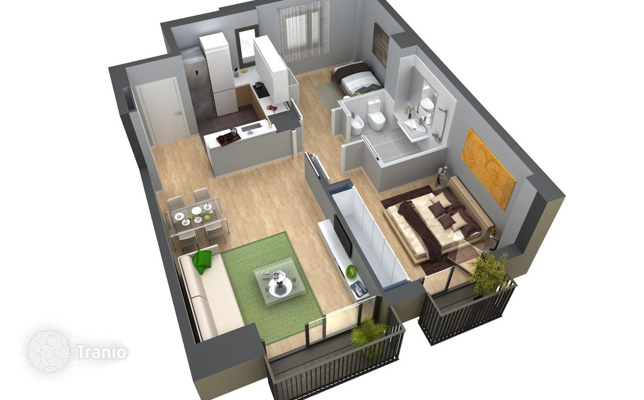 Просторная и светлая гостиная с выходом на кухню в американском стиле со столешницей, мойкой из нержавеющей стали, микроволновой печью, духовкой, стеклокерамической плитой и встроенной выдвижной вытяжкой Siemens. Гостиная с двухпанельным эркером и балконом, выходящим на юго-восток с электрическими жалюзи. Спальня, выходящая на юго-восток, со встроенными шкафами, балкон с поворотно-откидной крышей. Вторая спальня, выходящая на север, с поворотно-откидным окном, интернетом, кабелем и отоплением. Ванная комната с душем из нержавеющей стали, электрическим полотенцесушителем, туалетом и биде, мебелью для ванной (раковины и душевой поддон).