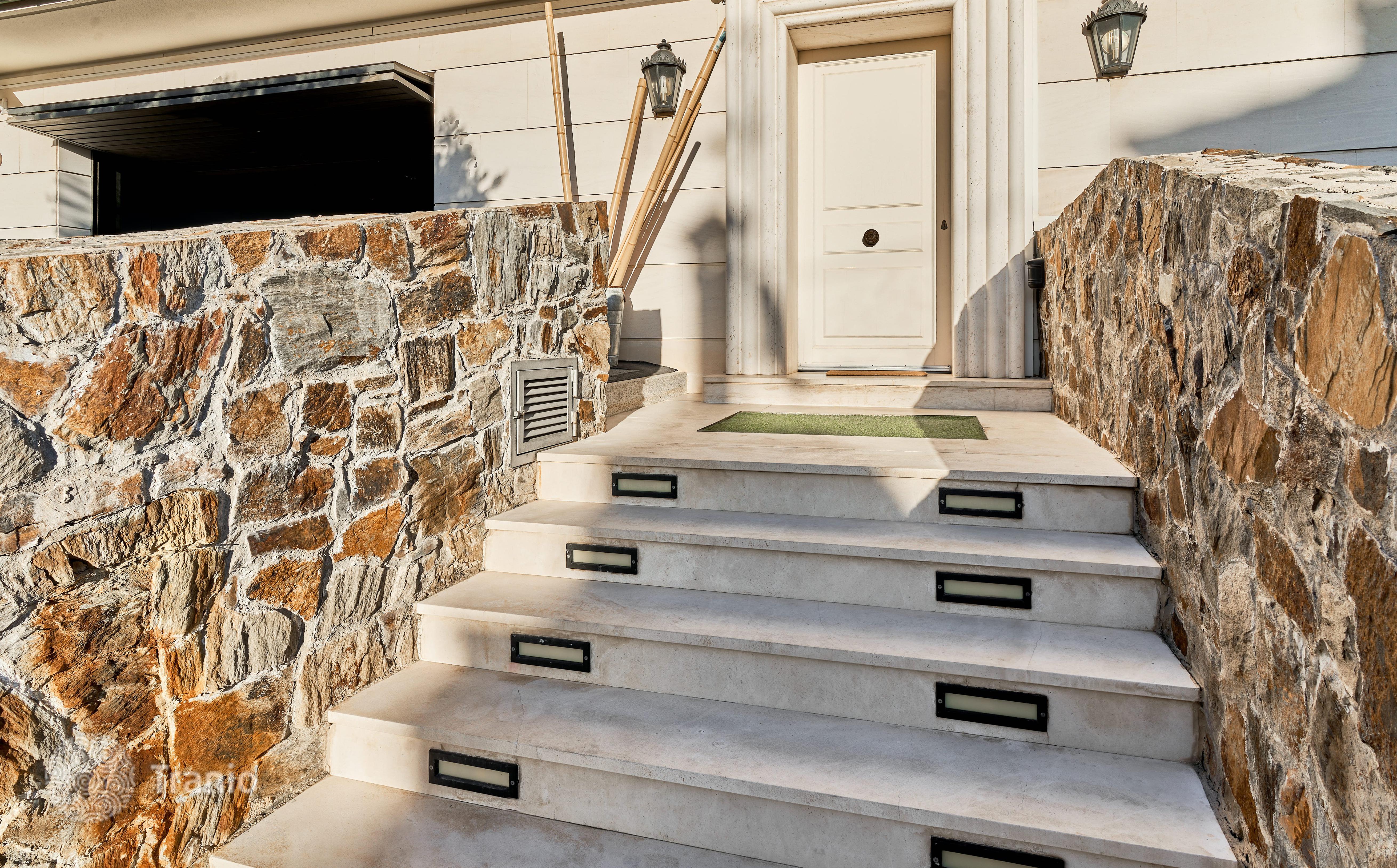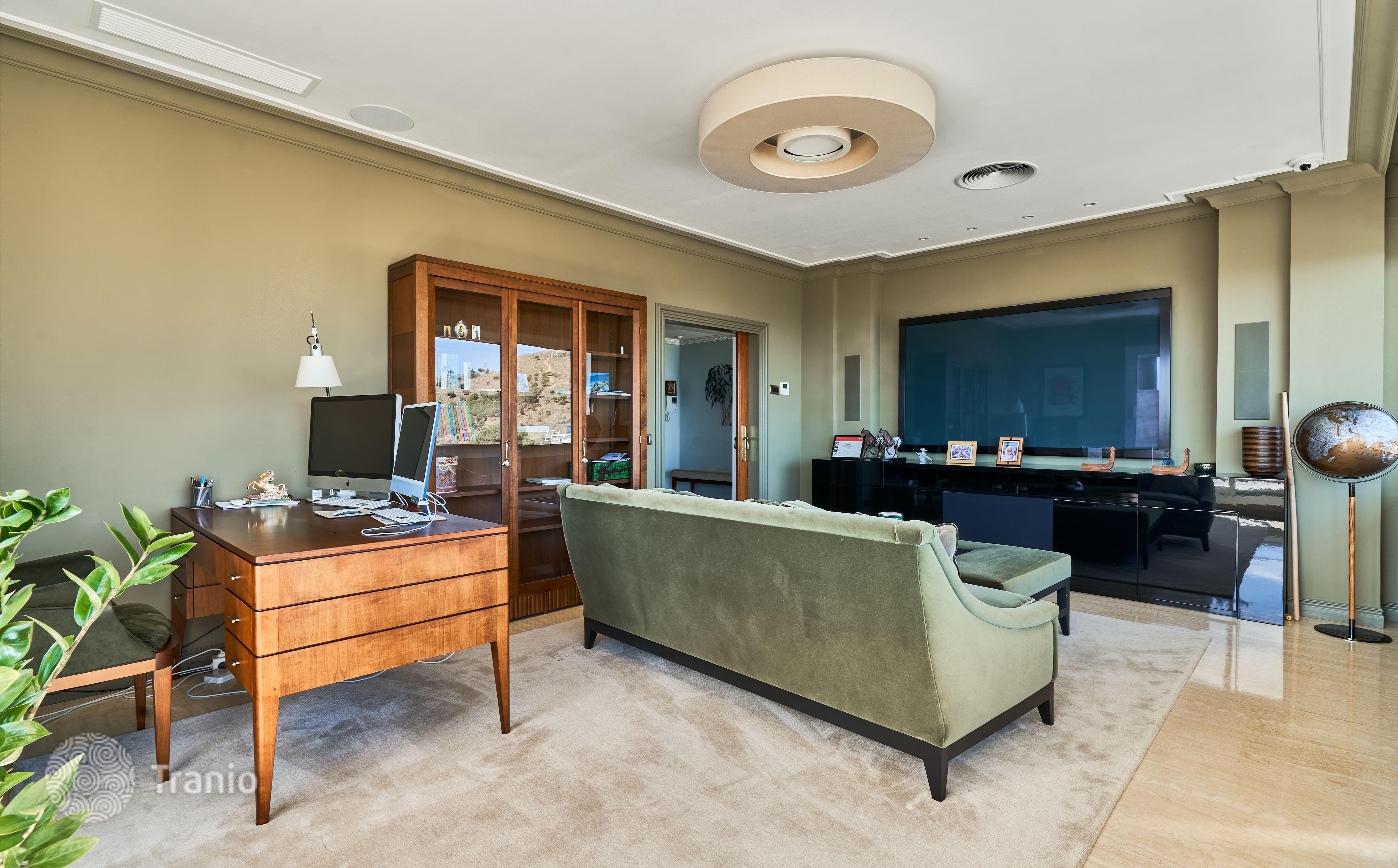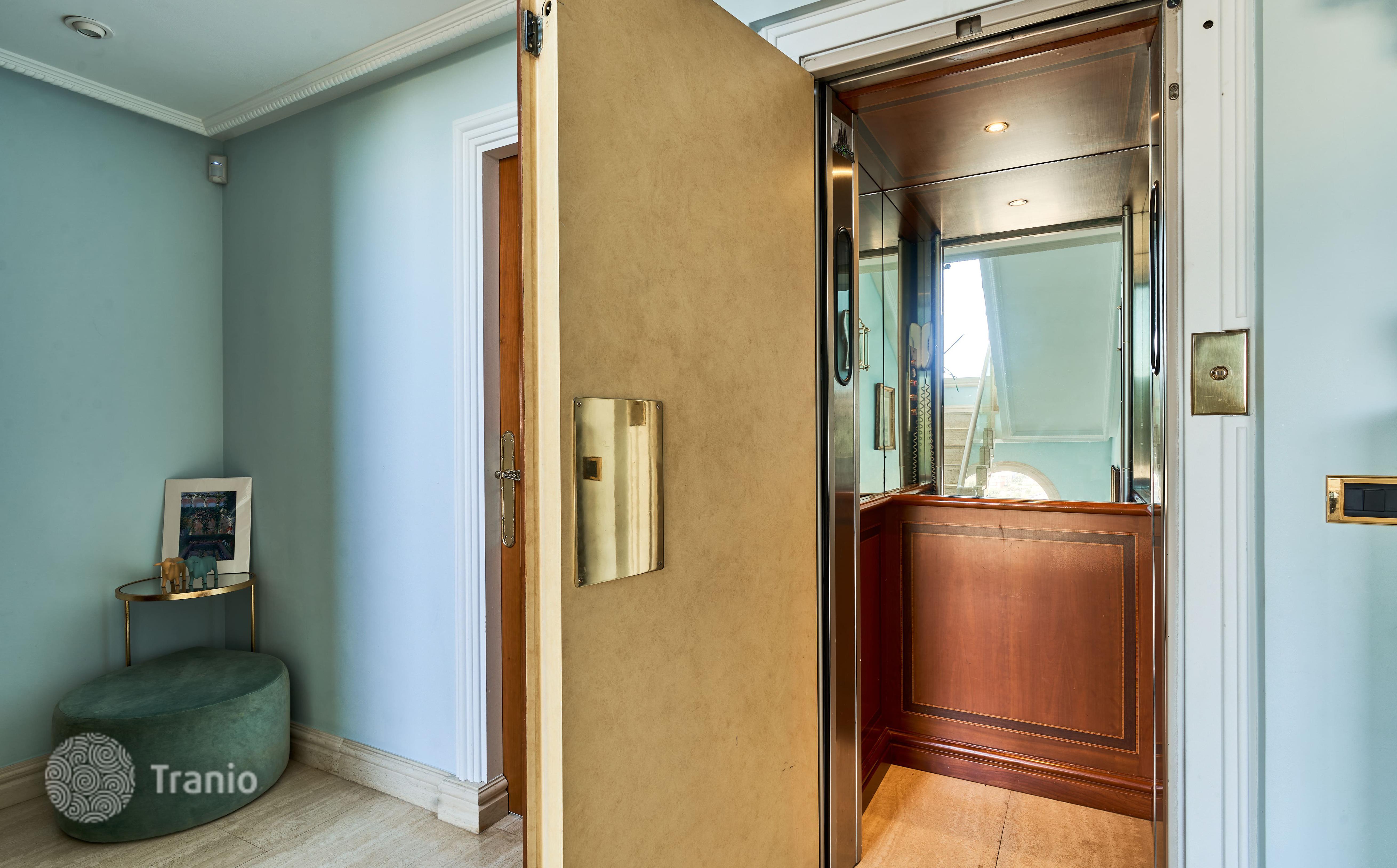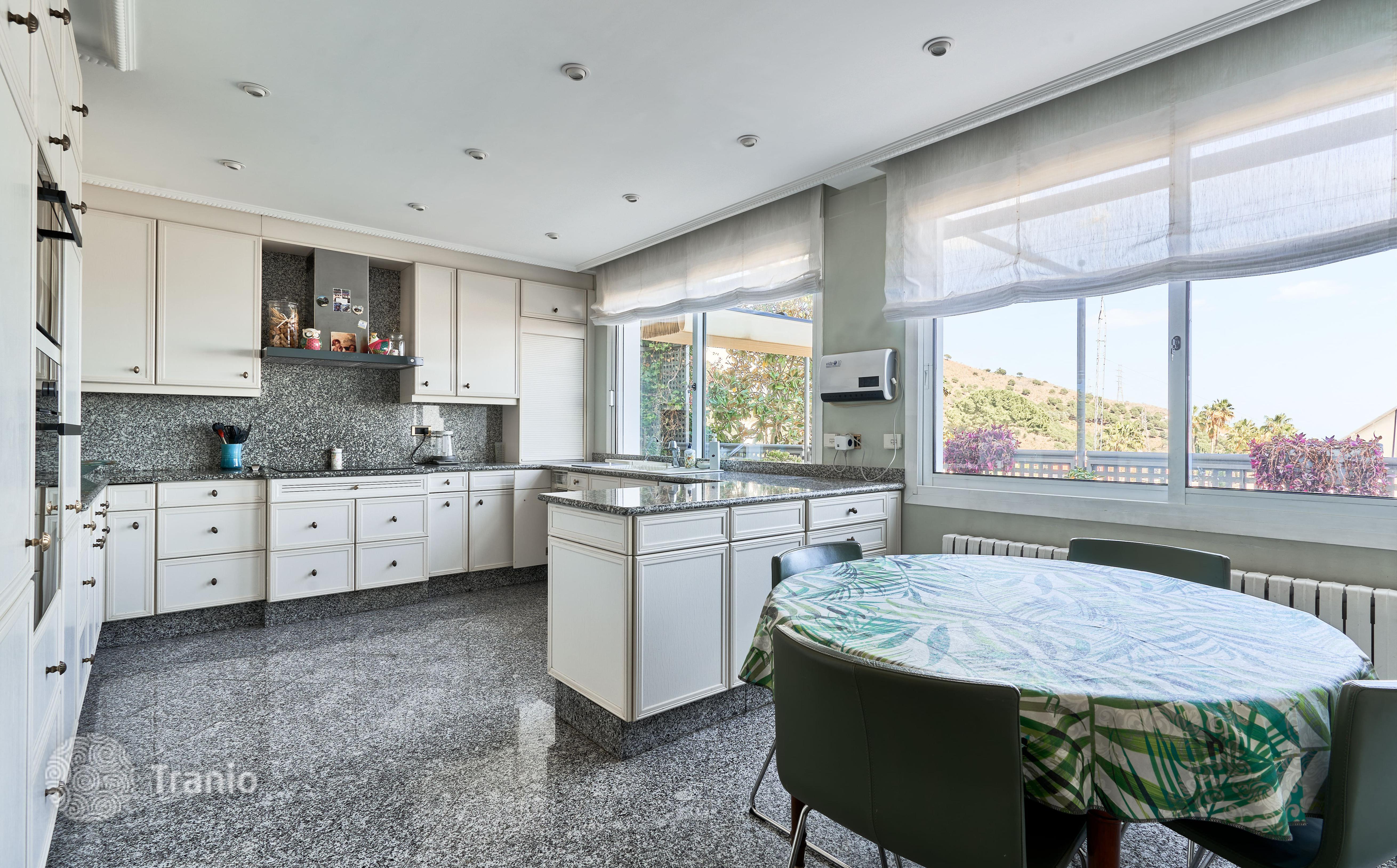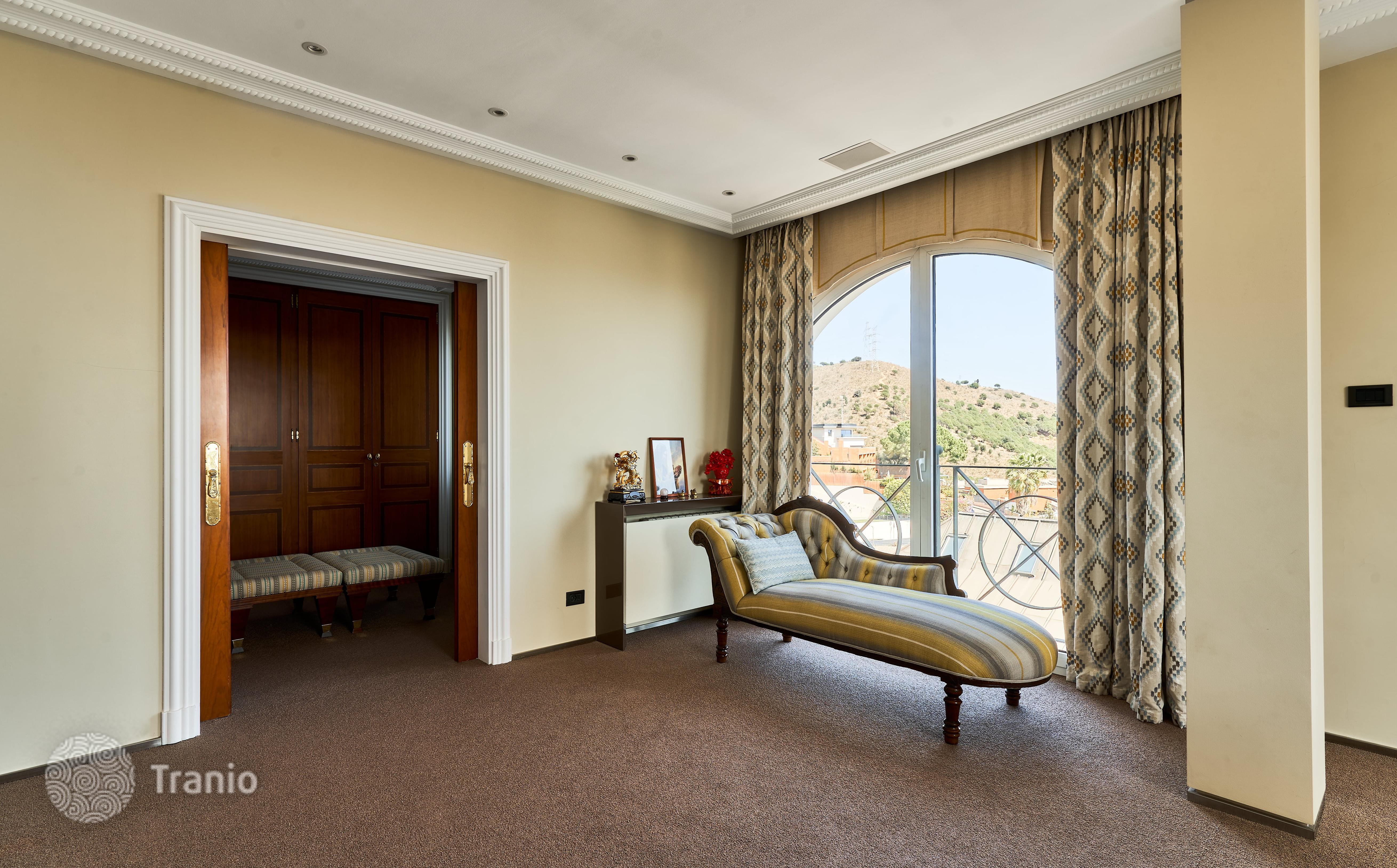 В доме 5 спальных сьютов и 8 санузлов. Гостиная с выходом на террасу с бассейном. Бассейн с соленой водой и подогревод. Домашний кинотеатр с кабинетом и террасой. Бодега. Постирочная и 4 кладовых помещения. Лифт на все этажи.