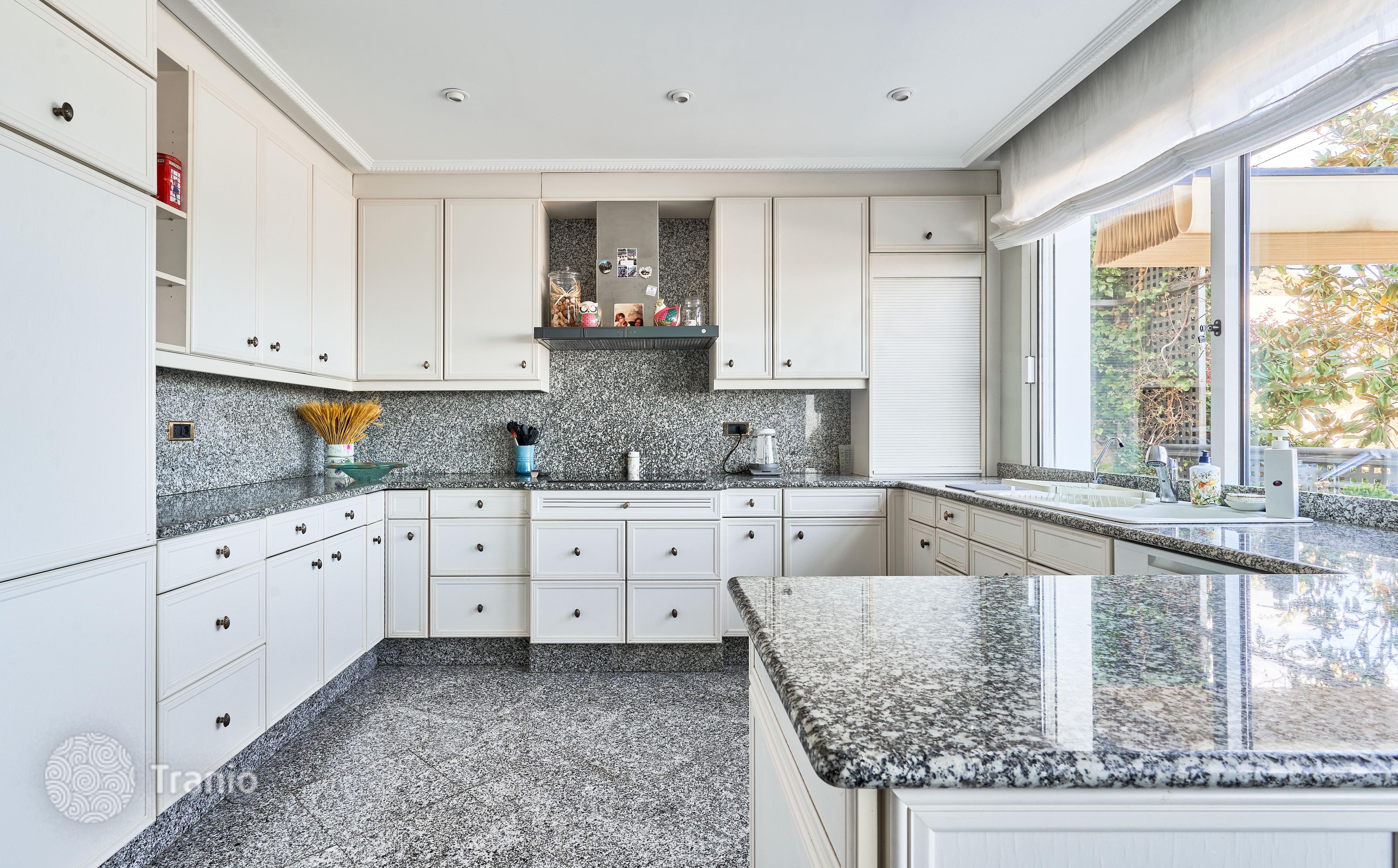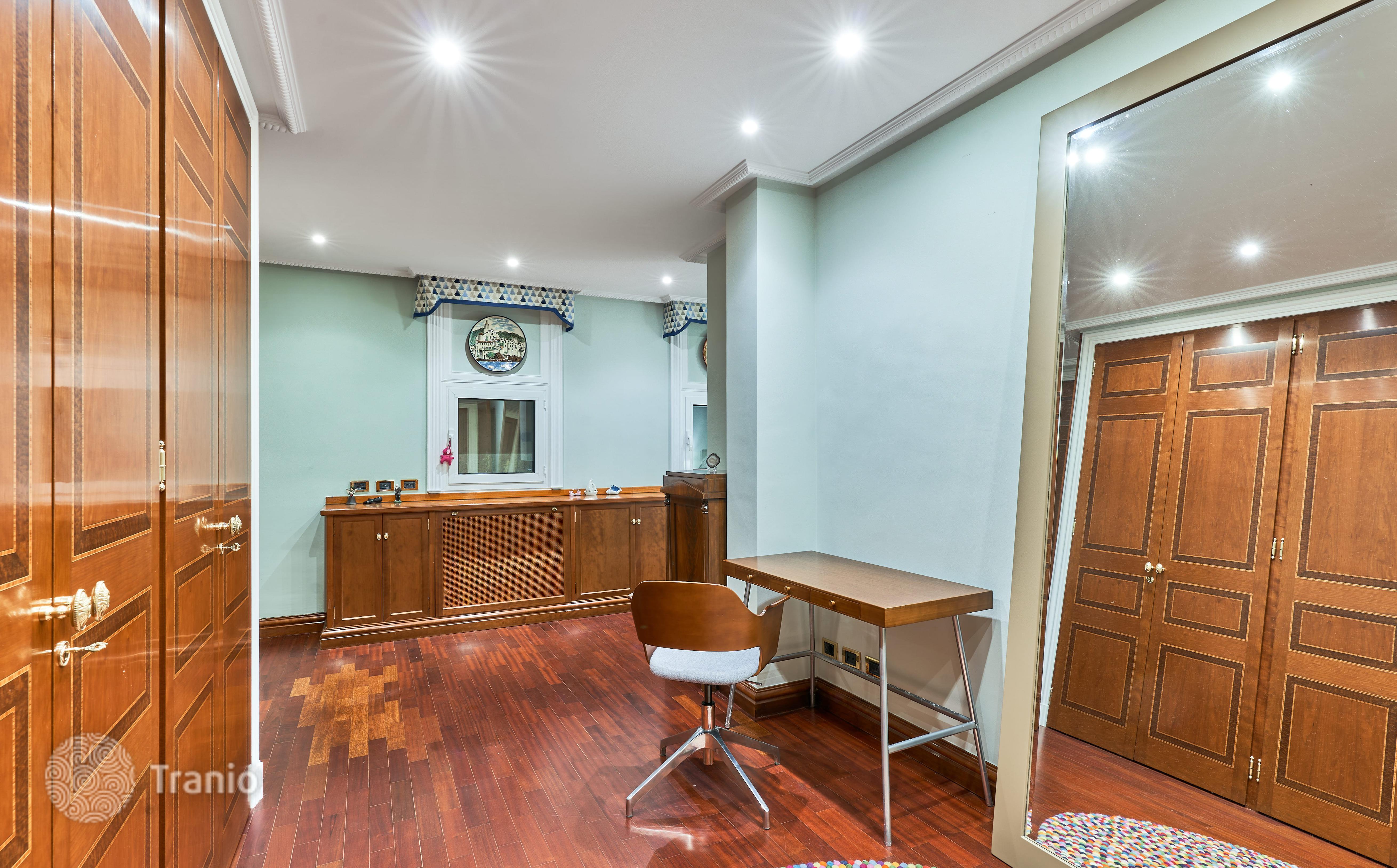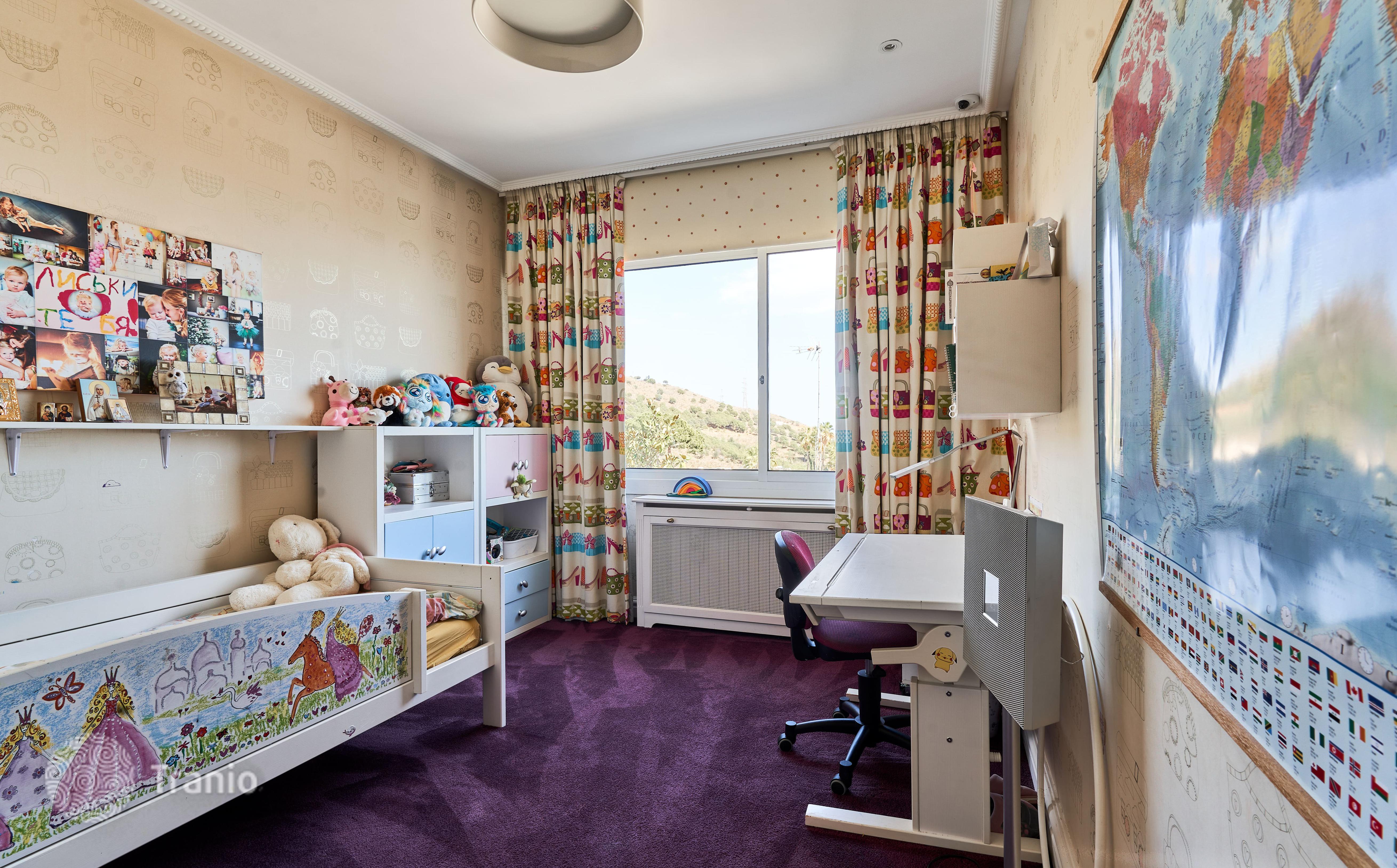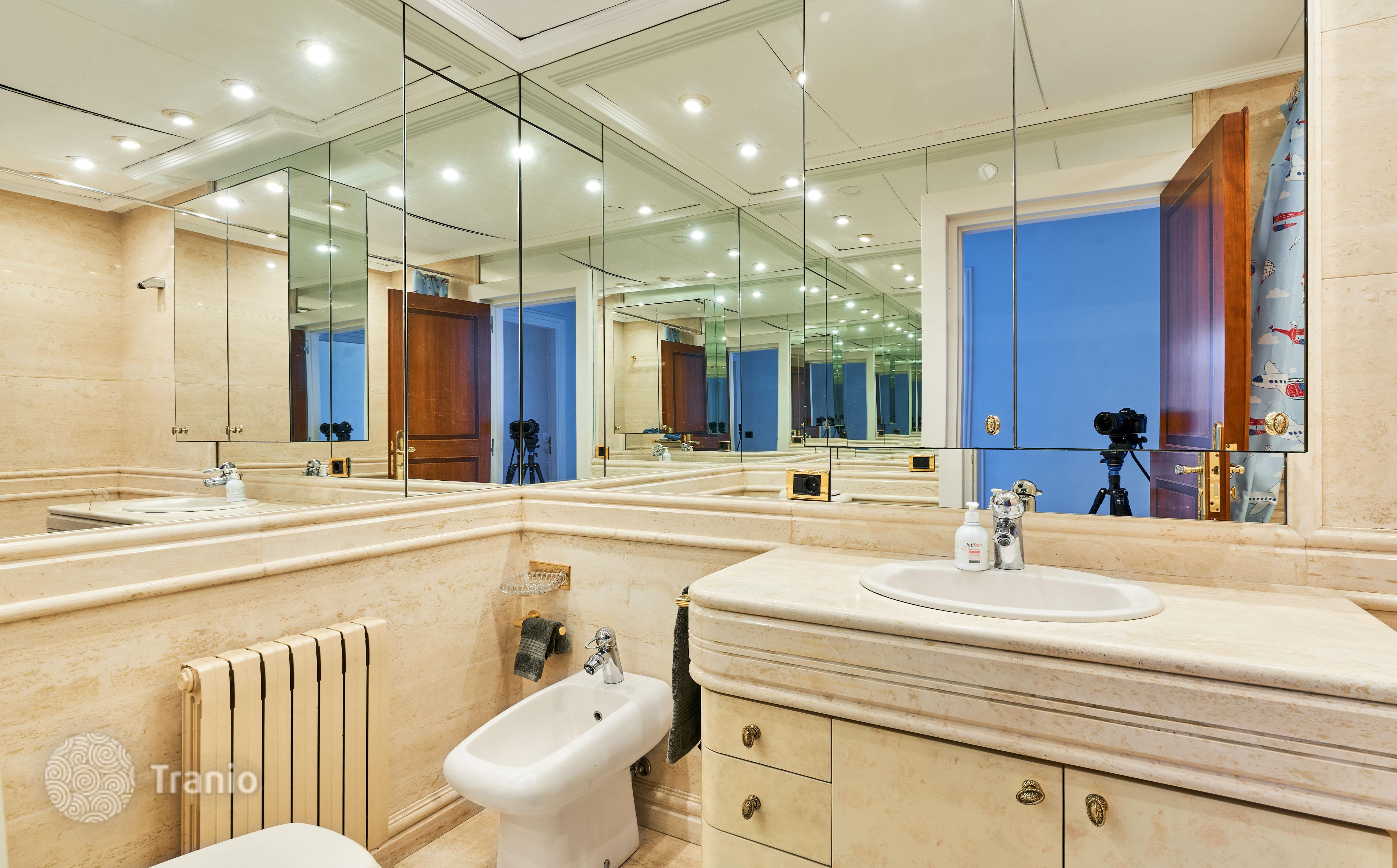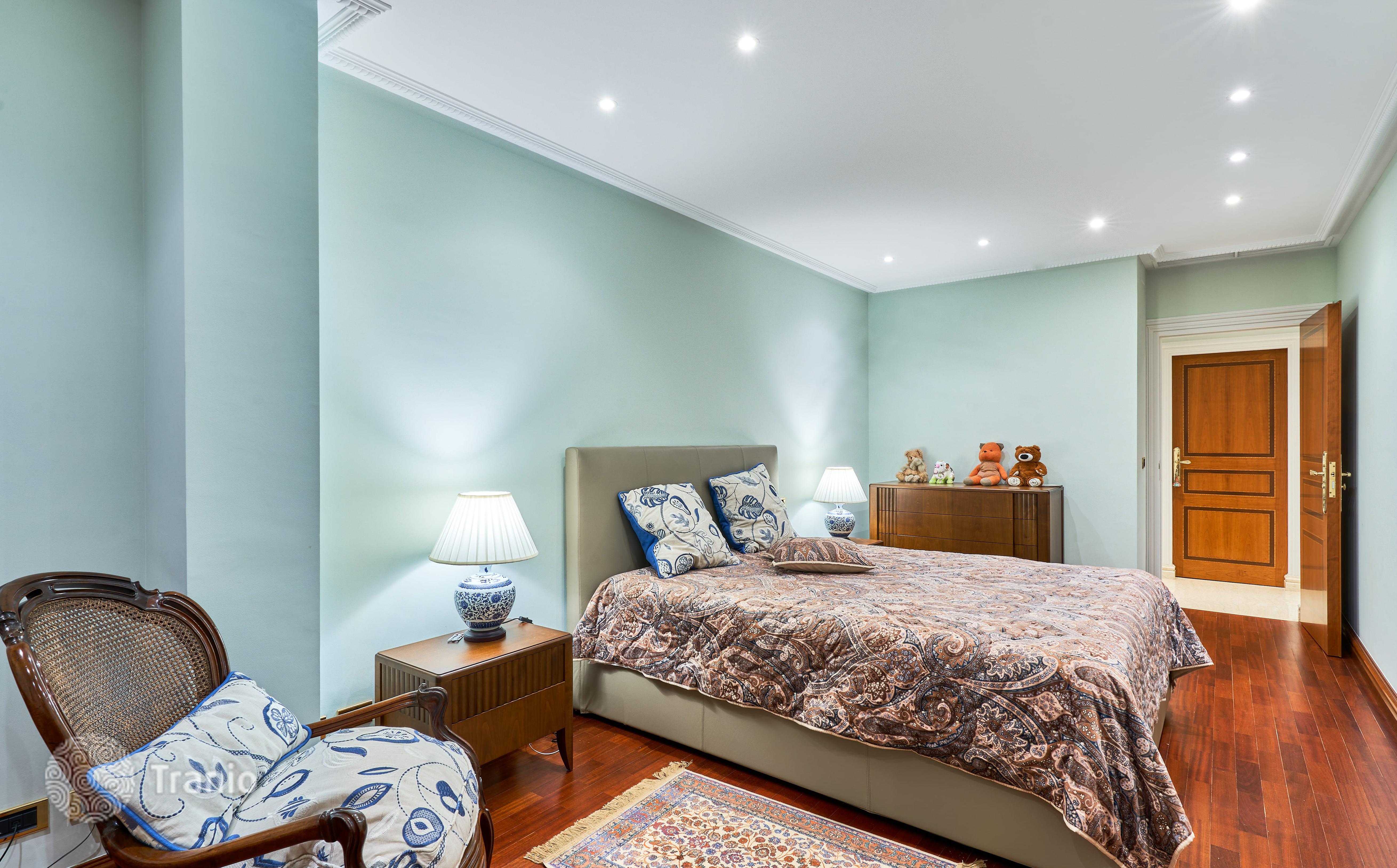 В доме 5 спальных сьютов и 8 санузлов. Гостиная с выходом на террасу с бассейном. Бассейн с соленой водой и подогревод. Домашний кинотеатр с кабинетом и террасой. Бодега. Постирочная и 4 кладовых помещения. Лифт на все этажи.