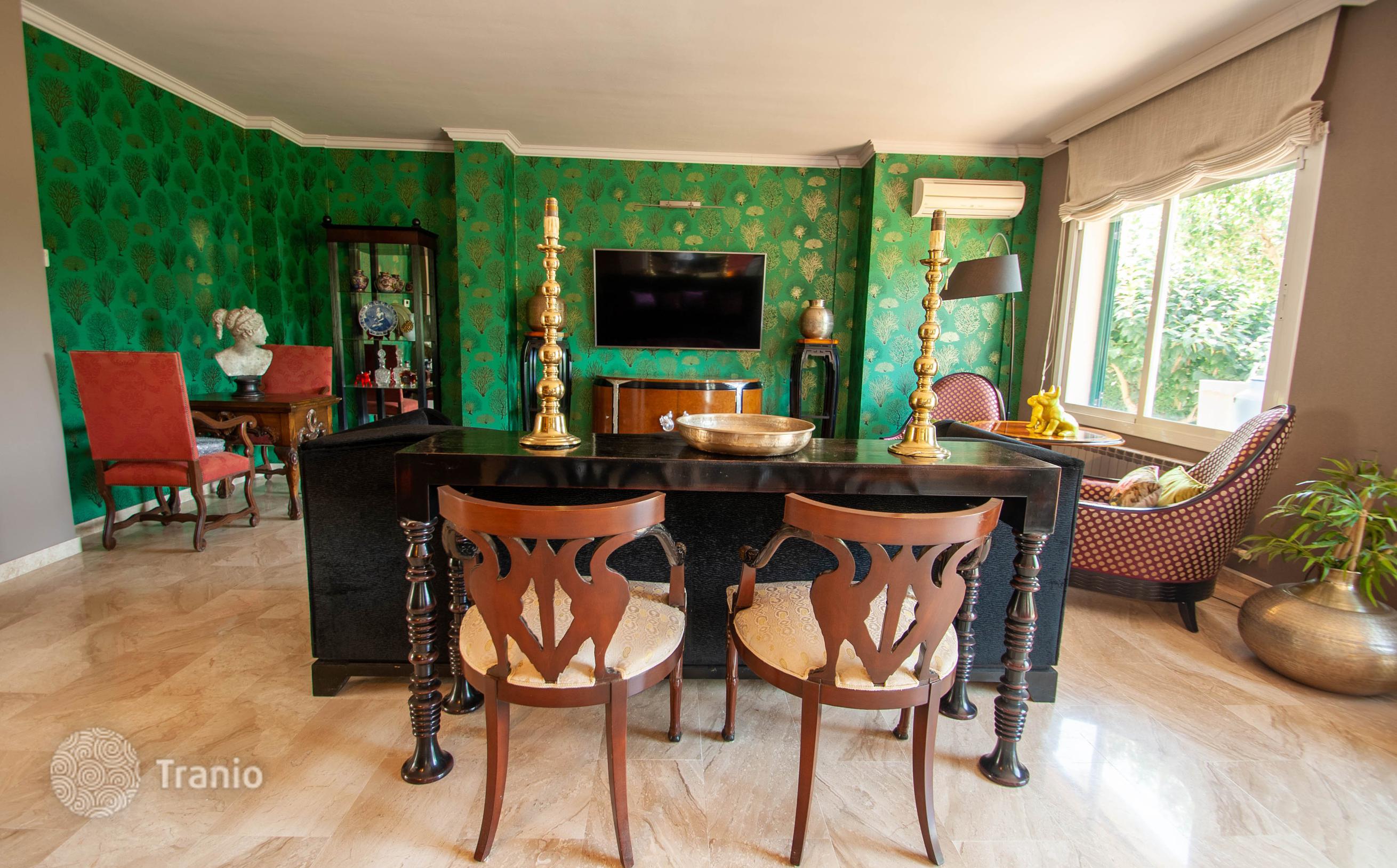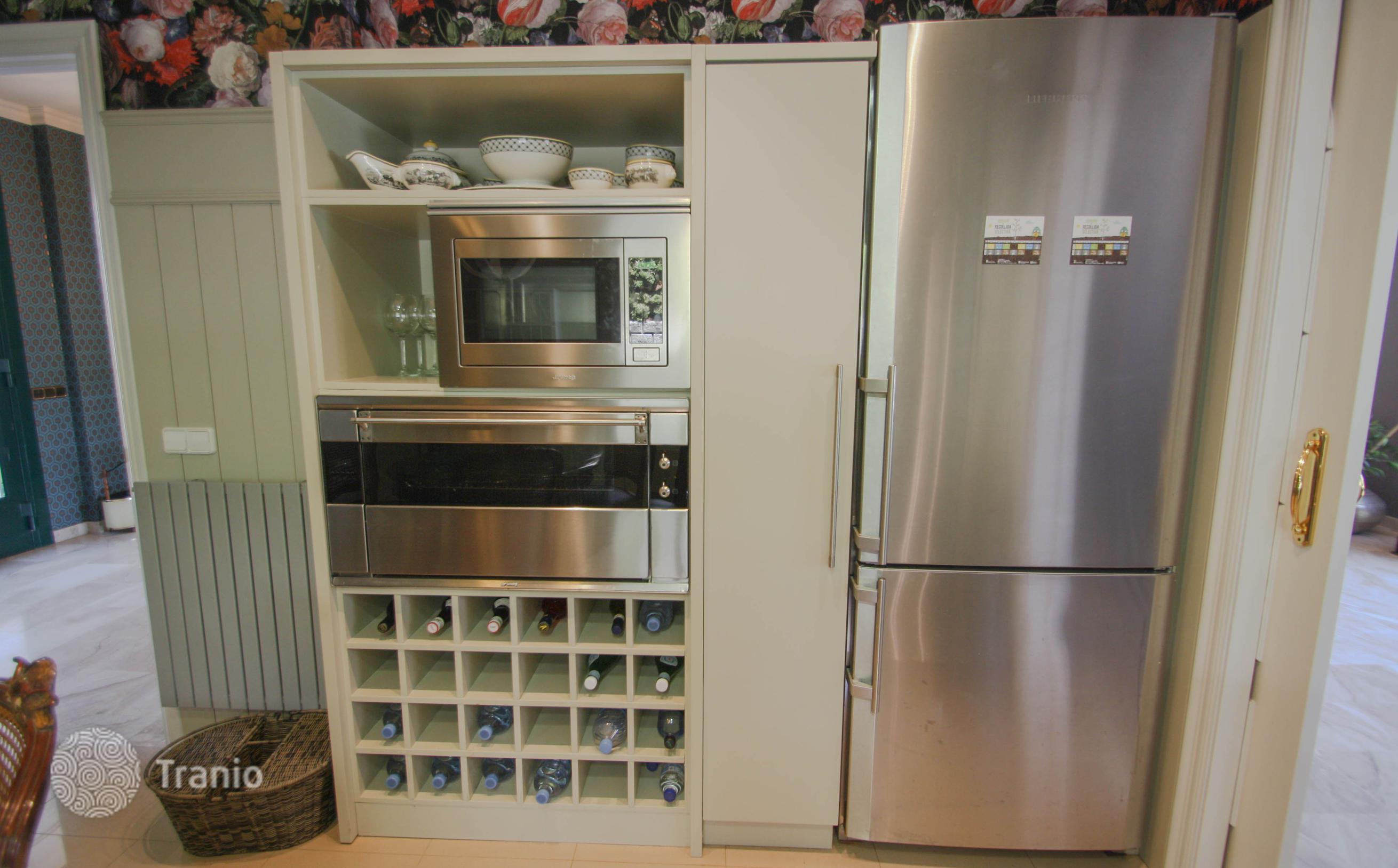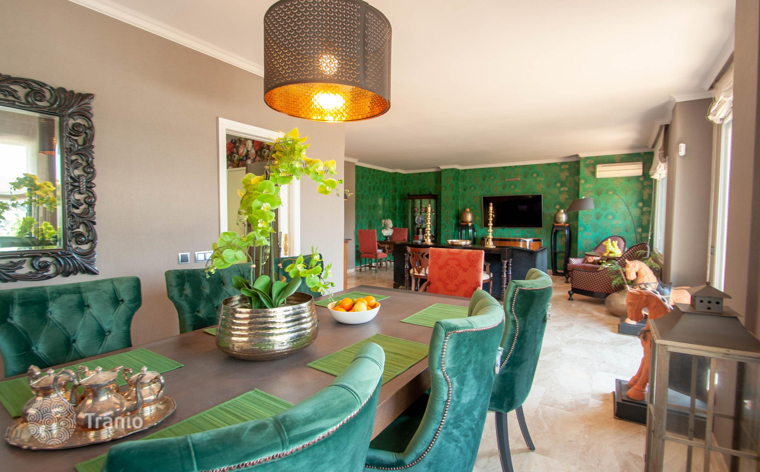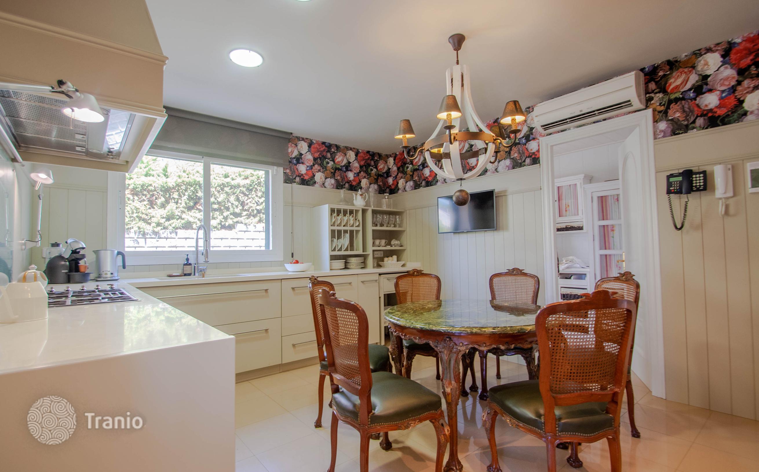 При входе на участок имеется парковочное место с навесом на 2 машины. Дом трехэтажный. На первом этаже расположена прихожая, далее салон с обеденной зоной и выходом на террасу. Рядом с обеденной зоной находится современная и светлая кухня с выходом в постирочную зону. Так же на первом этаже находится 1 спальня сьют и гостевой туалет.