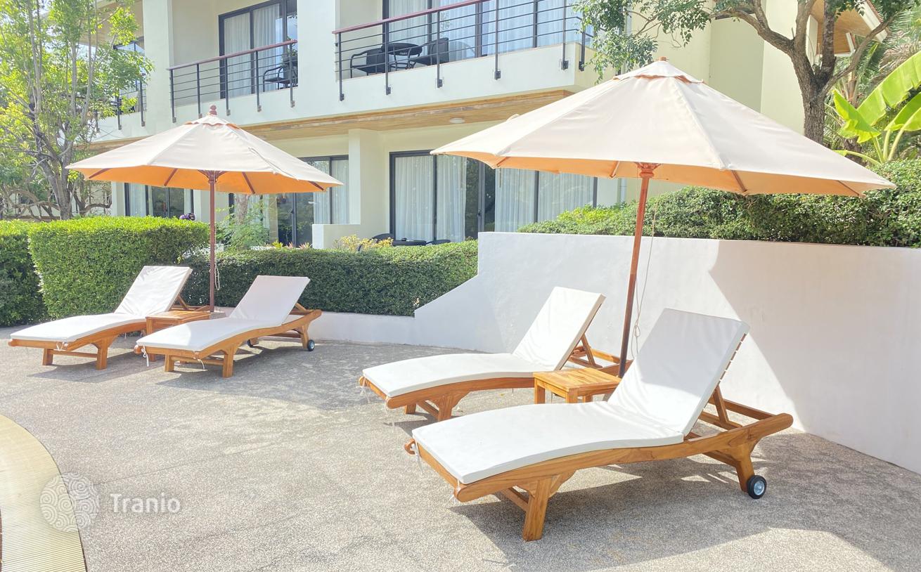 На территории комплекса есть2 бассейна, красивый сад, уличный гриль ВВQ, парковка. Управляющая компания предоставляет уборку и смену белья 1 раз в неделю.