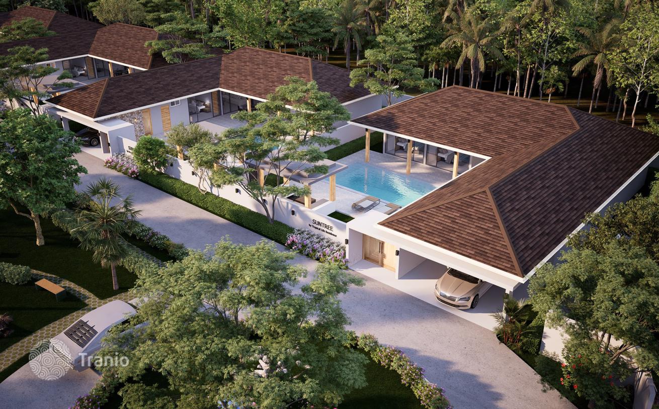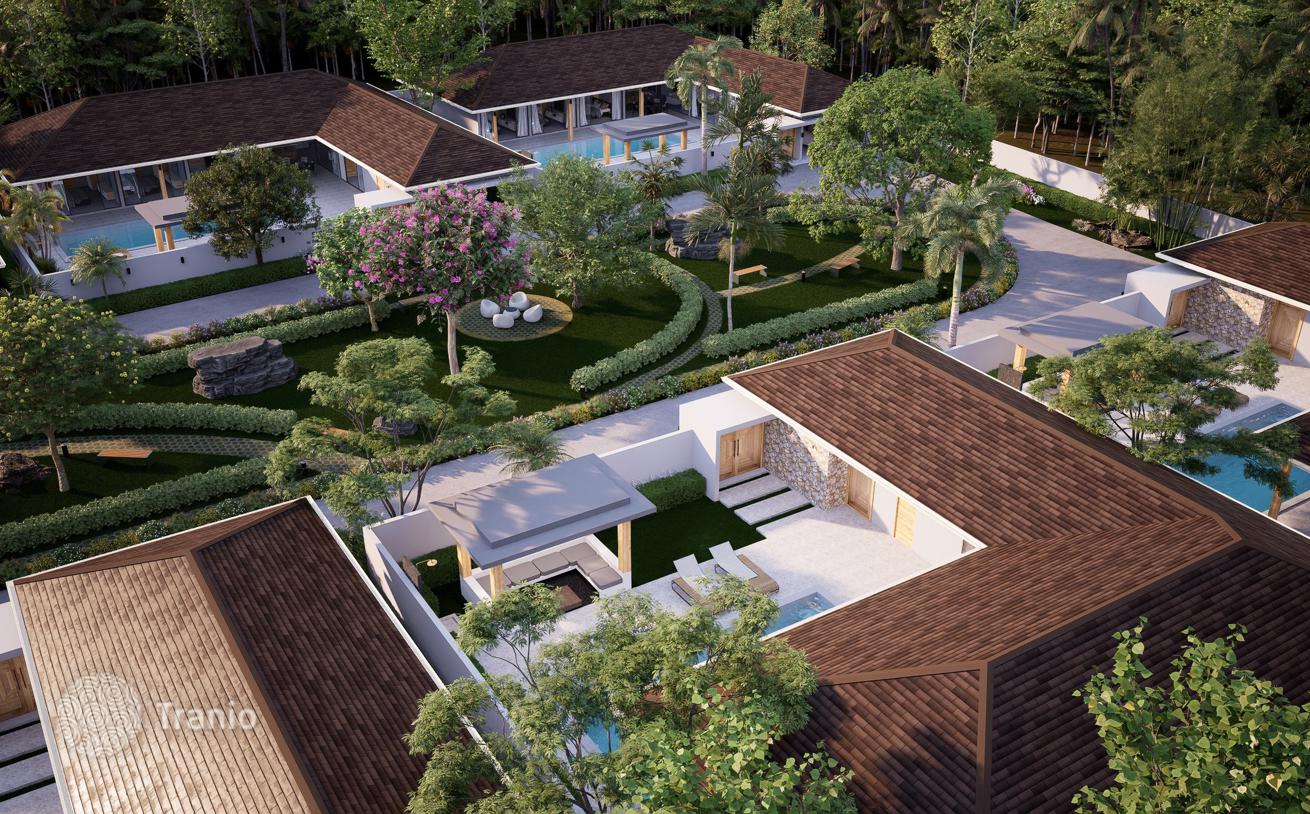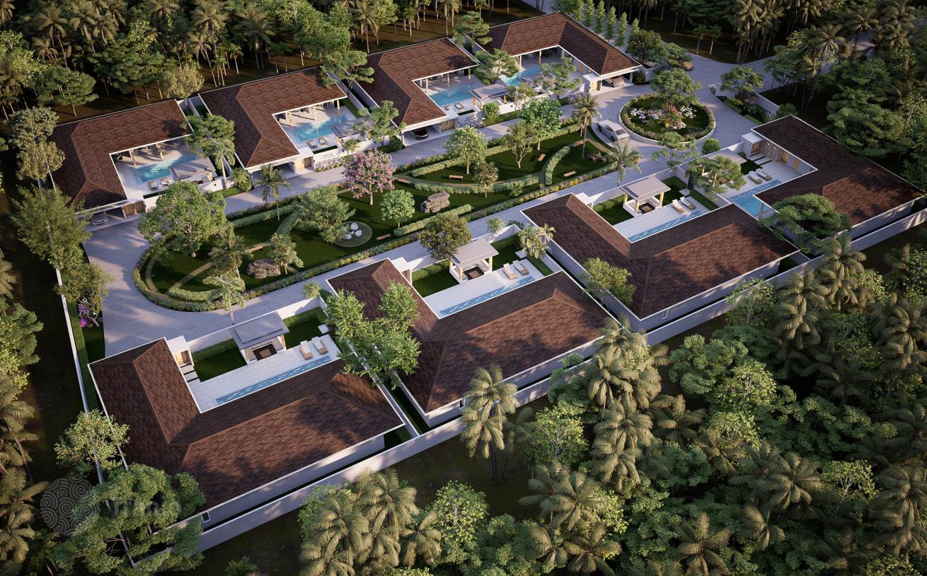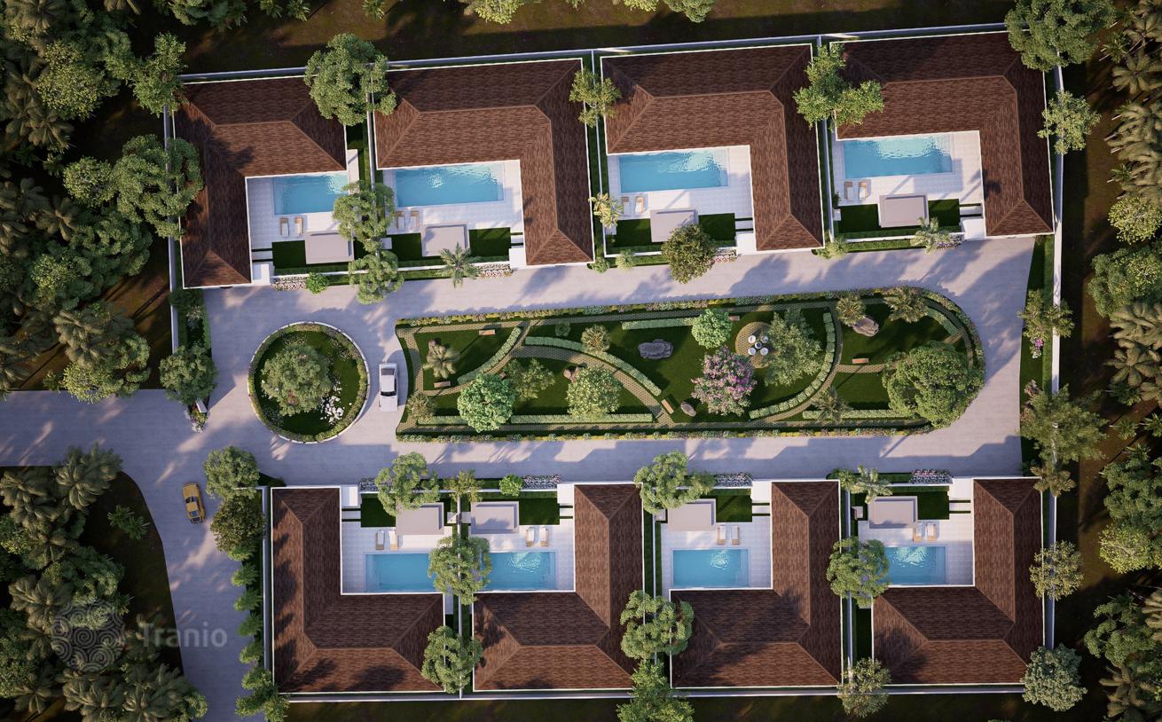 Современный жилой комплекс будет состоять из общей зелёной зоны в центре и 8 домов, каждый с личным бассейном, беседкой, душем на открытом воздухе, парковкой.