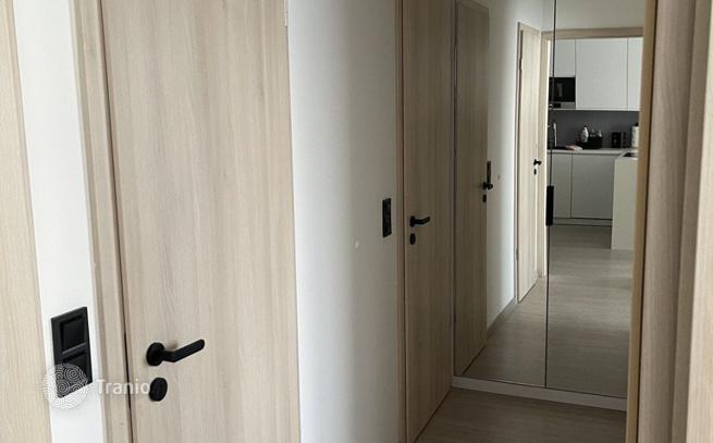 Открытая с гостиной кухня, 2 спальни, раздельный санузел, 3 балкона общей площадью 15 м². 2 парковочных места в подземном гараже и кладовая 4 м².