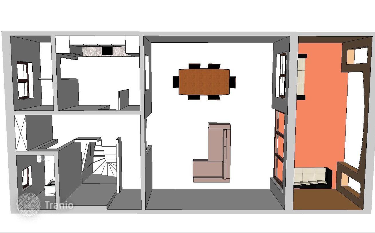 Нижний этаж — гостиная со столовой, отдельная кухня, туалет, терраса.