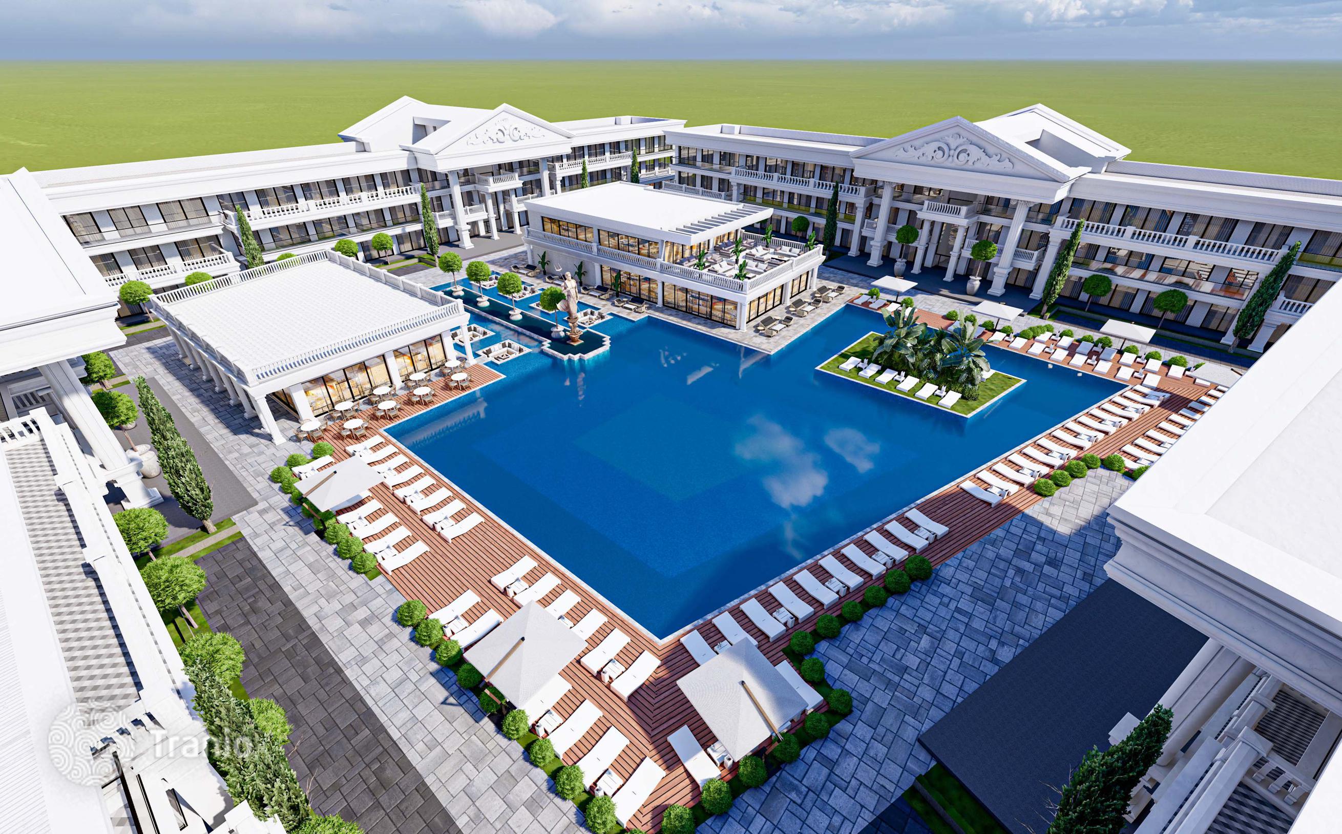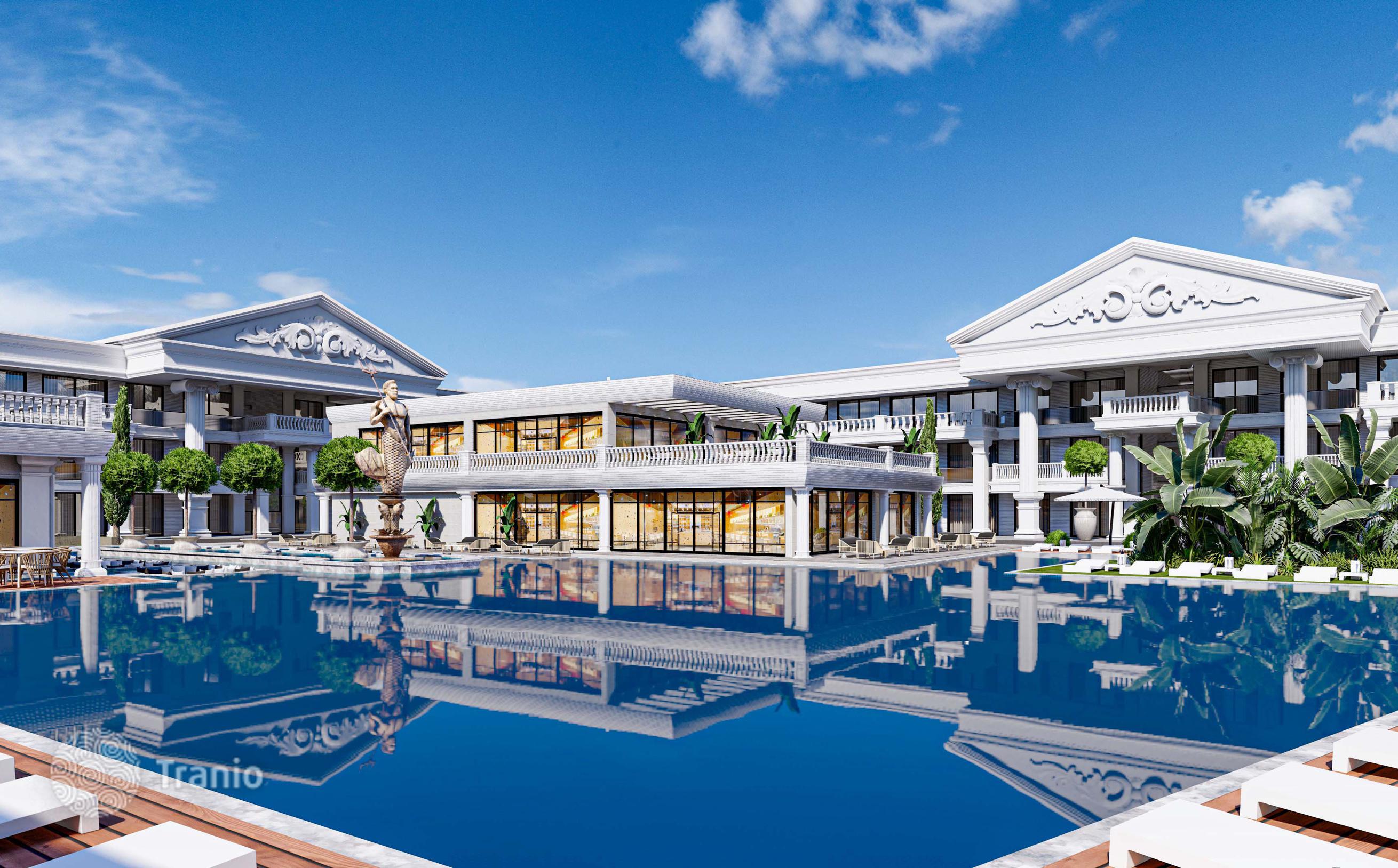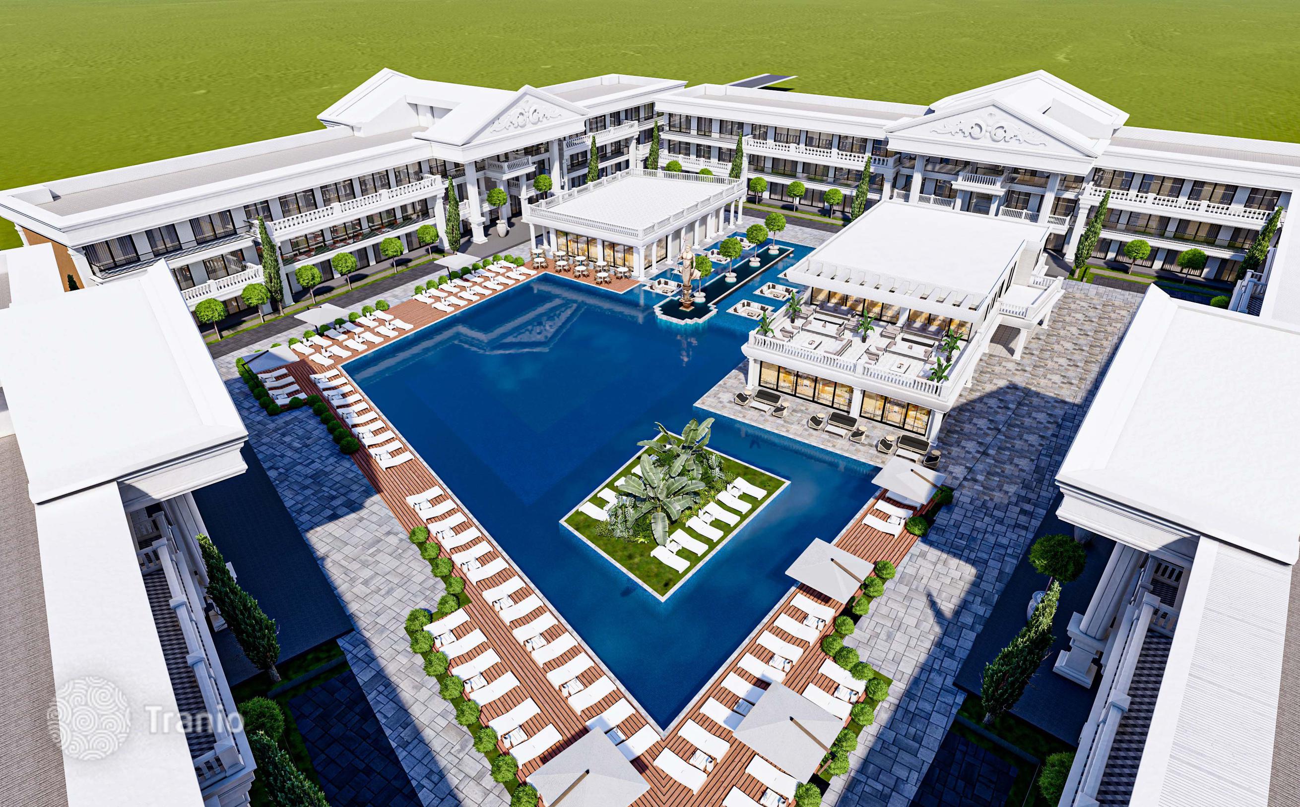 Комплекс состоит из 4 блоков и предлагает 140 квартир различной планировки — от студий до 2-комнатных квартир. Вы также можете воспользоваться услугами 2 ресторанов, фитнес-центра, SPA-центра, сауны, массажных комнат и крытого бассейна.