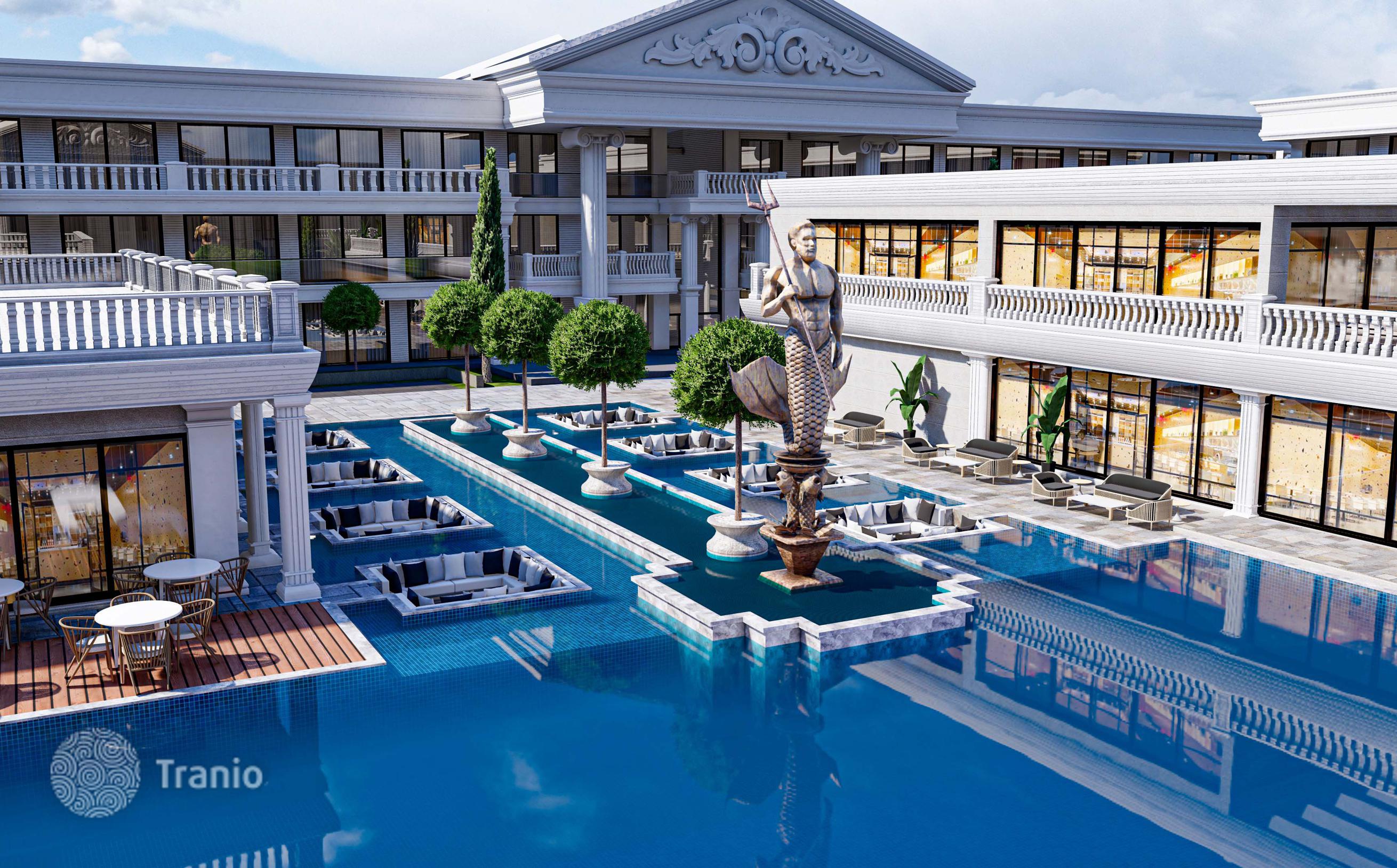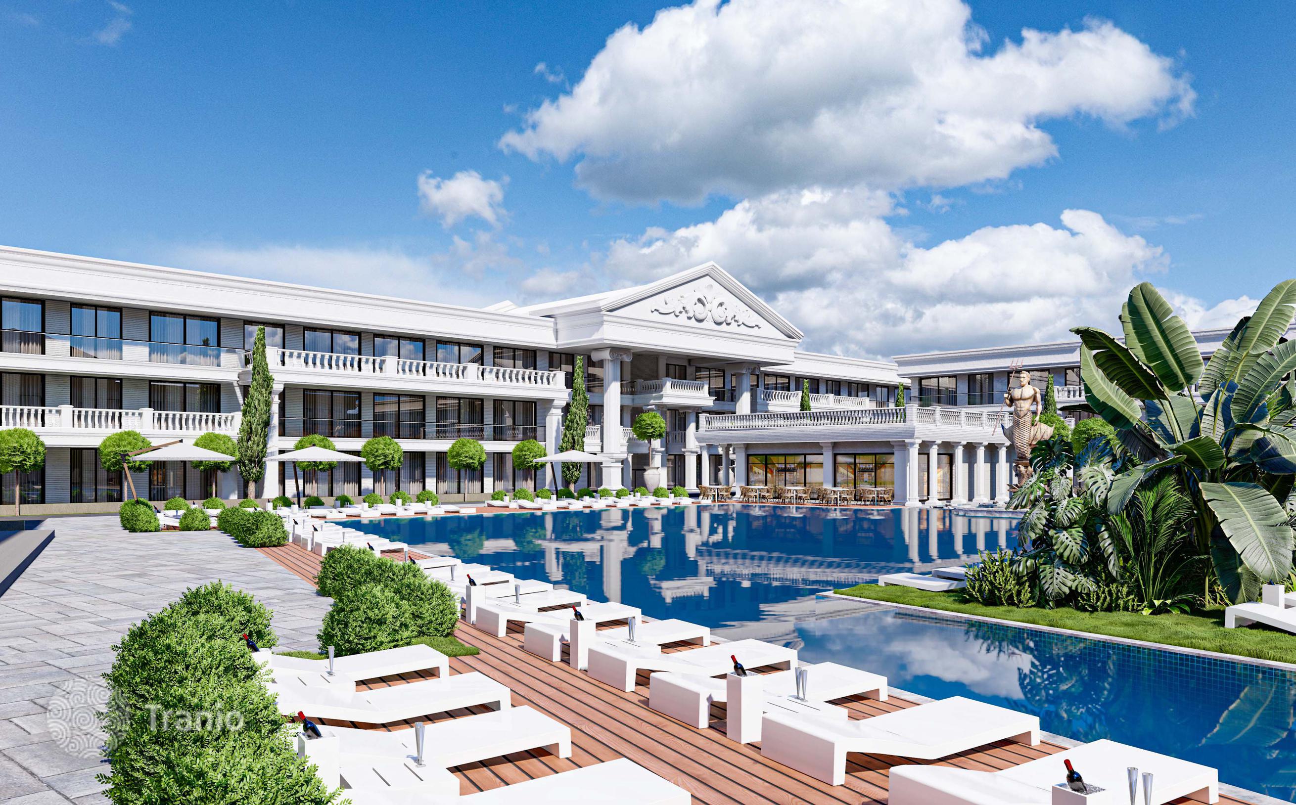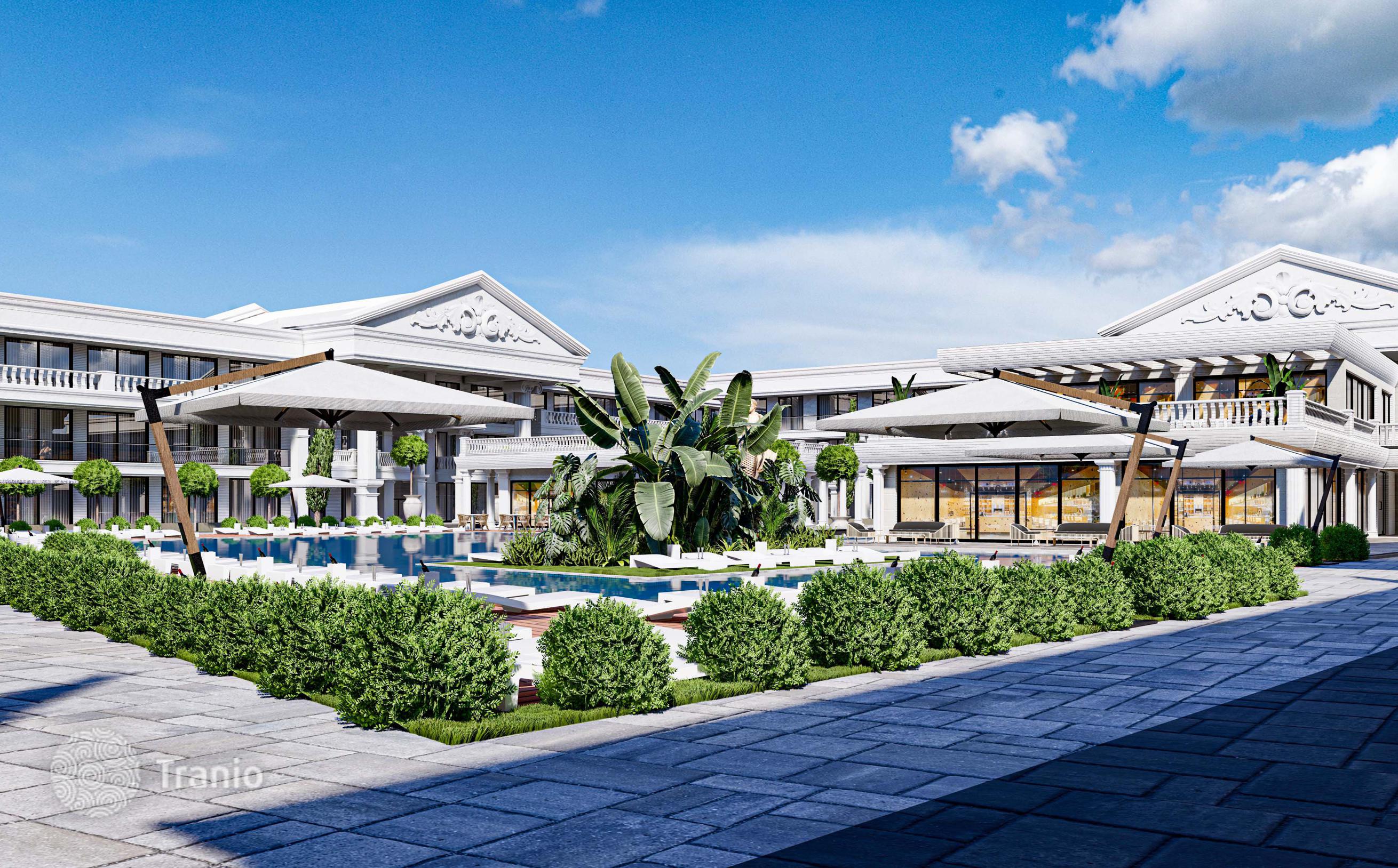 Комплекс состоит из 4 блоков и предлагает 140 квартир различной планировки — от студий до 2-комнатных квартир. Вы также можете воспользоваться услугами 2 ресторанов, фитнес-центра, SPA-центра, сауны, массажных комнат и крытого бассейна.