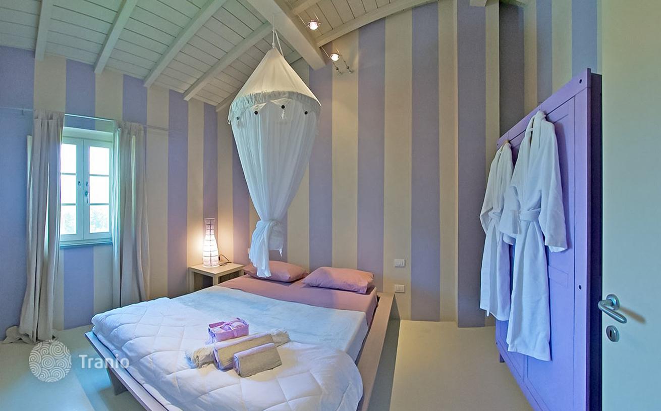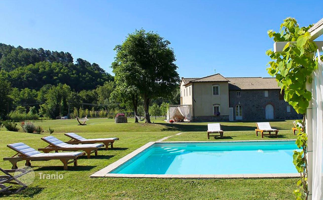 Дом площадью около 500 м² предлагает 5 спален и 5 ванных комнат, расположенных на двух уровнях, и обширный участок площадью около 2 гектаров с фруктовыми деревьями и оливковой рощей, откуда открывается вид на холмы Лукки.