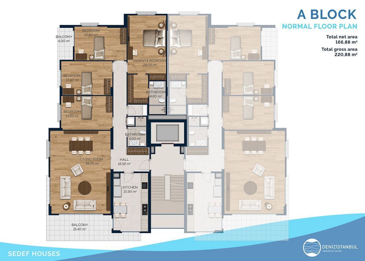 Продаётся просторная квартира в Стамбуле, расположенная в большом городе прямо у моря. Общая площадь квартиры составляет 220.2 кв.м. Это новый дом, построенный с использованием современных технологий.