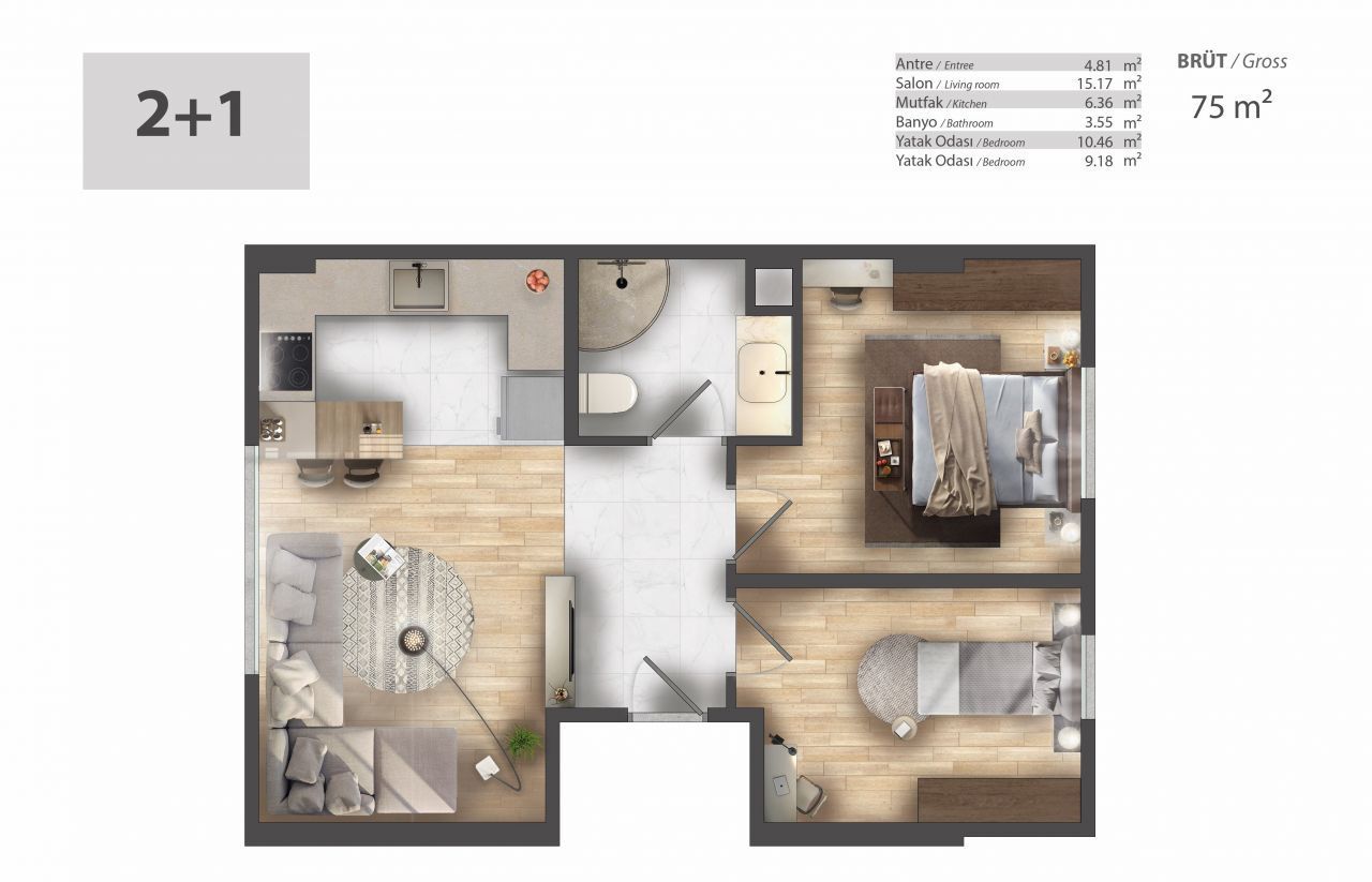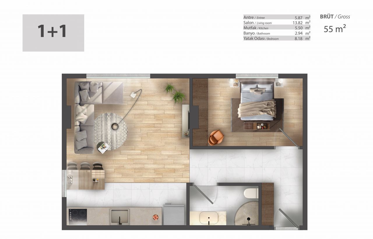 Продаю уютную квартиру в Стамбуле, расположенную в большом городе. Общая площадь этого строящегося объекта составляет 55 квадратных метров. Планировка квартиры - 1+1, что означает наличие одной спальни и двух комнат в общей сложности. В квартире также имеется один санузел.