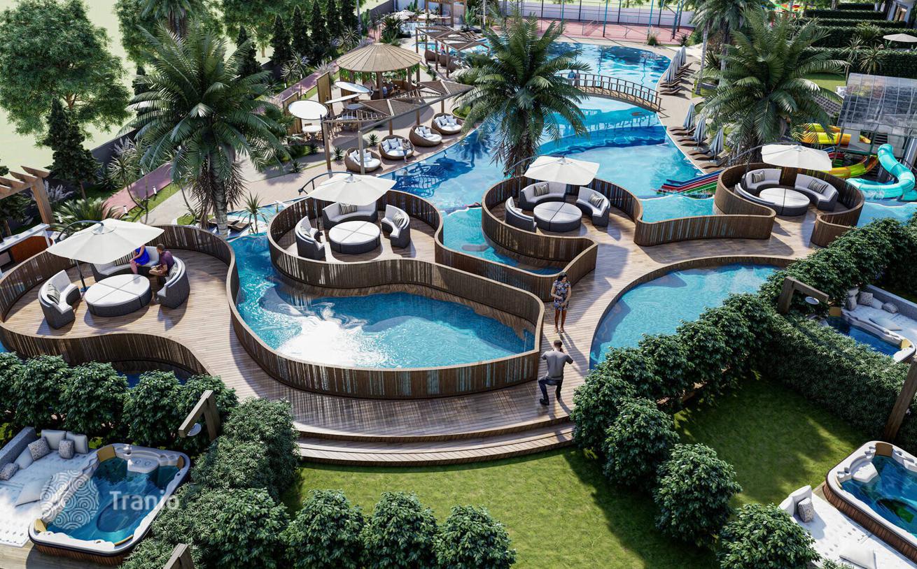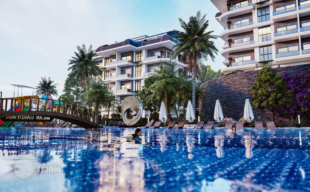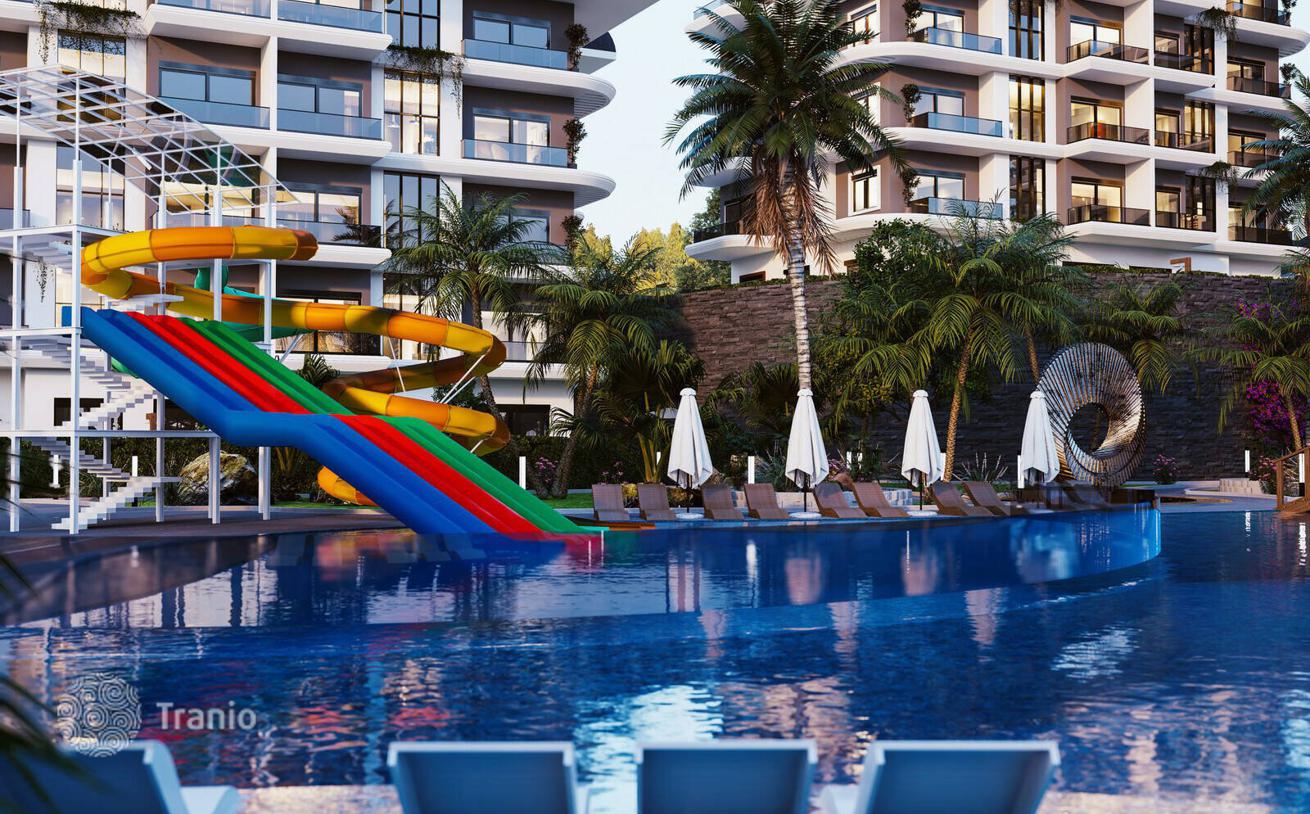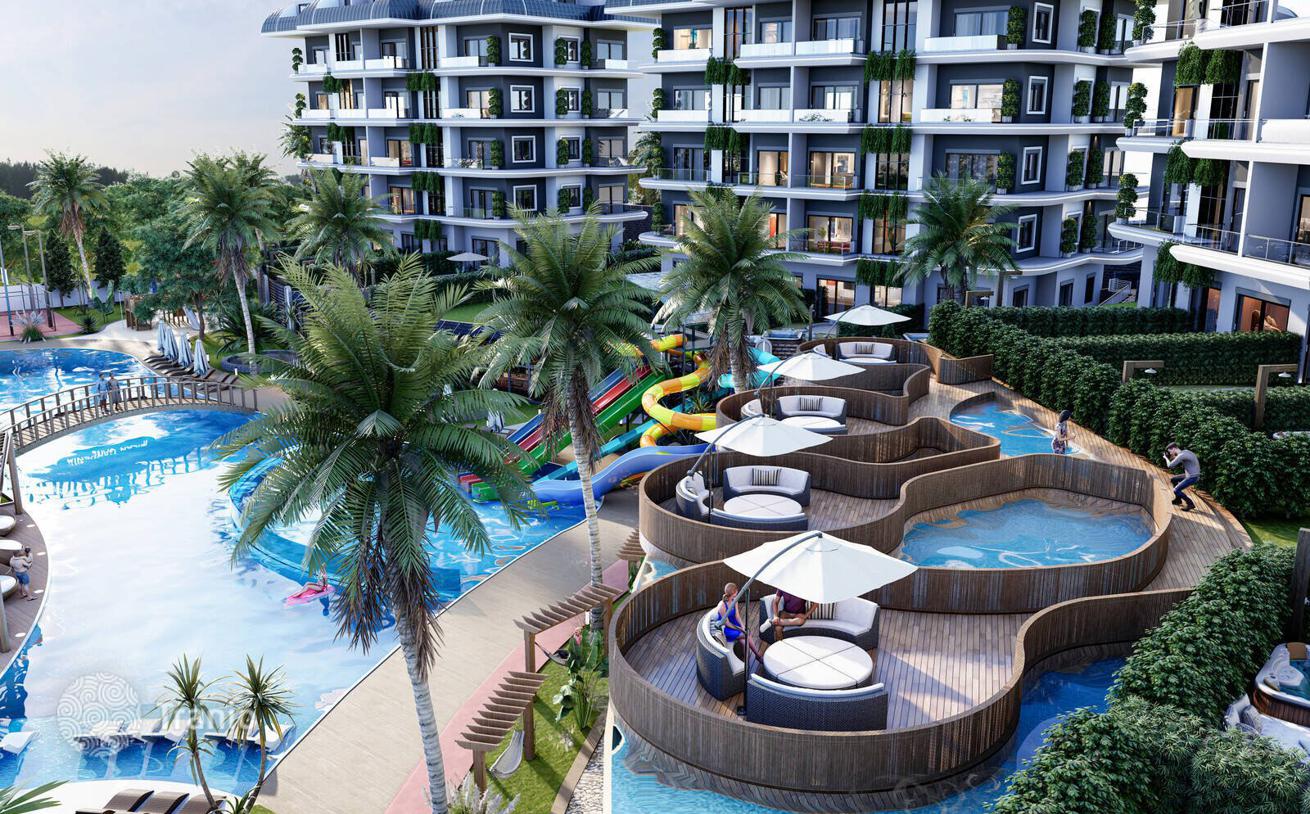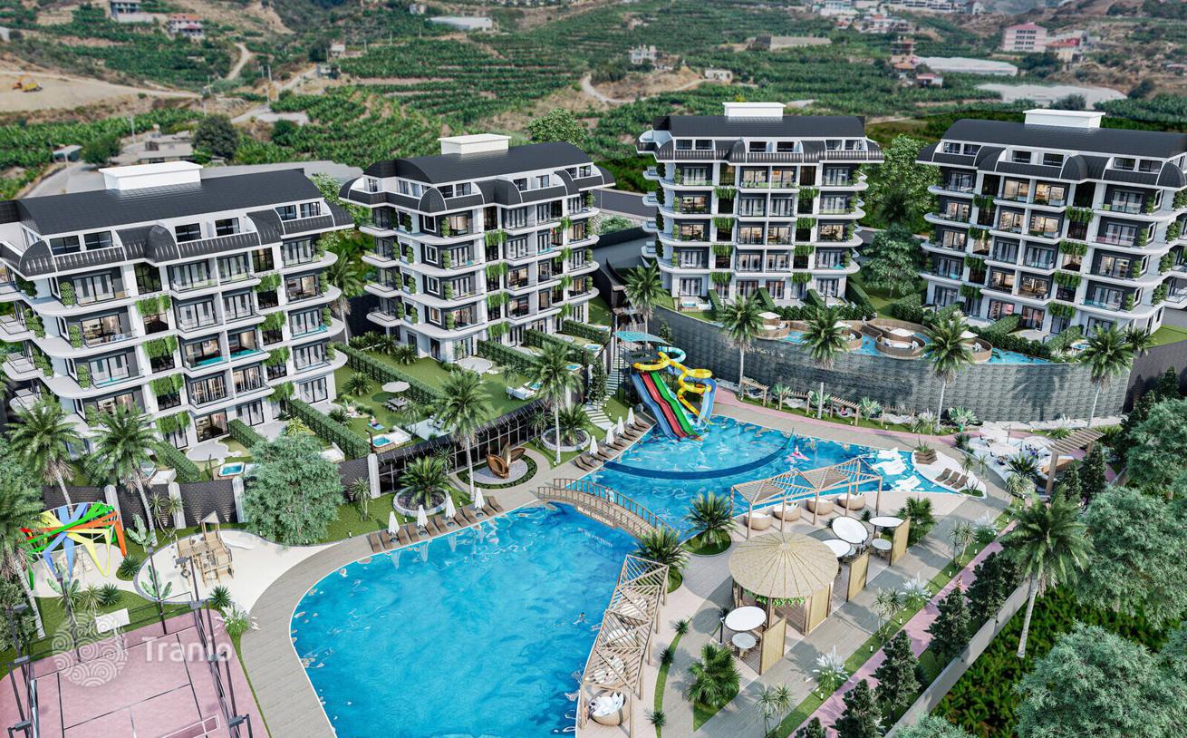 Квартиры расположены в престижном проекте с богатой инфраструктурой. К ним относятся крытый и открытый бассейны, аквапарк, водные горки, турецкая баня, фитнес-центр, сауна, теннисный корт, детская площадка, парк и кинотеатр. Также проектом предусмотрена круглосуточная горячая вода, подключение WI-FI и трансфер.