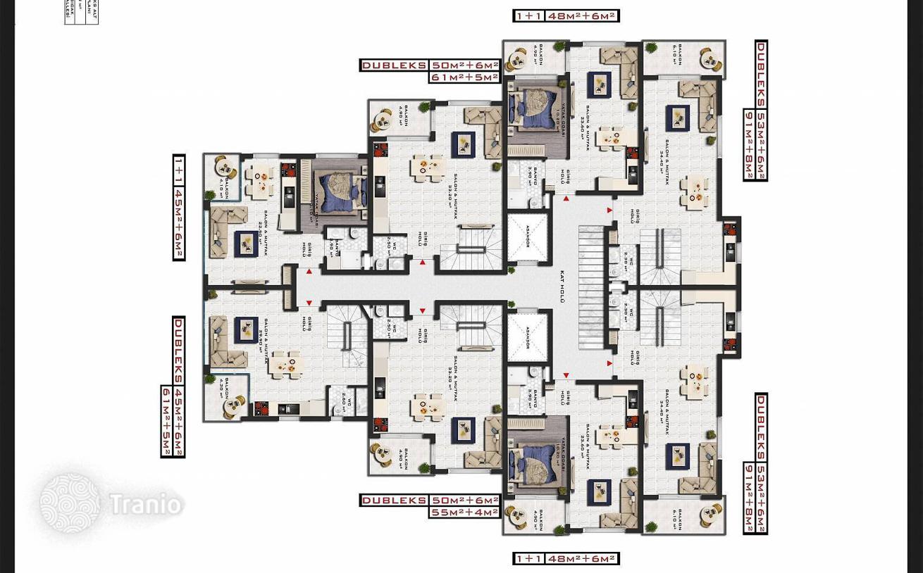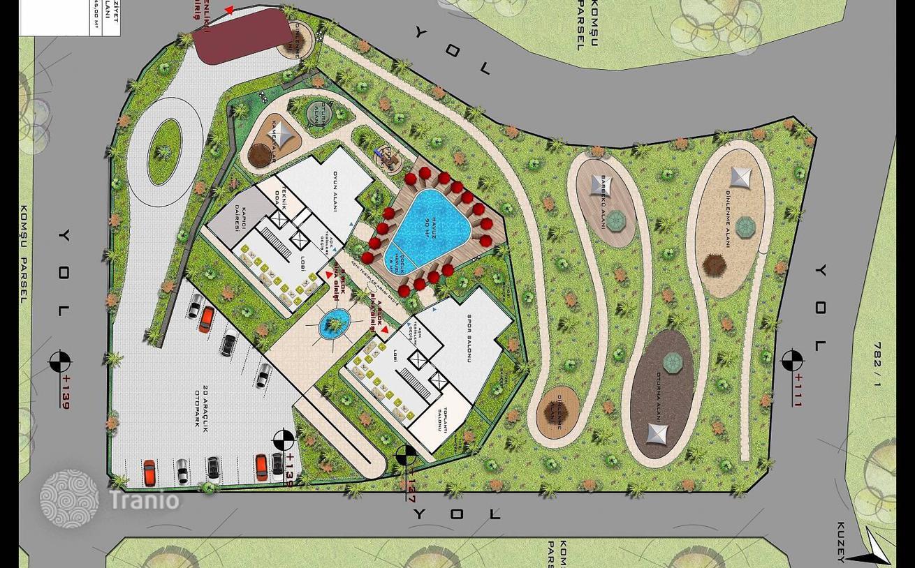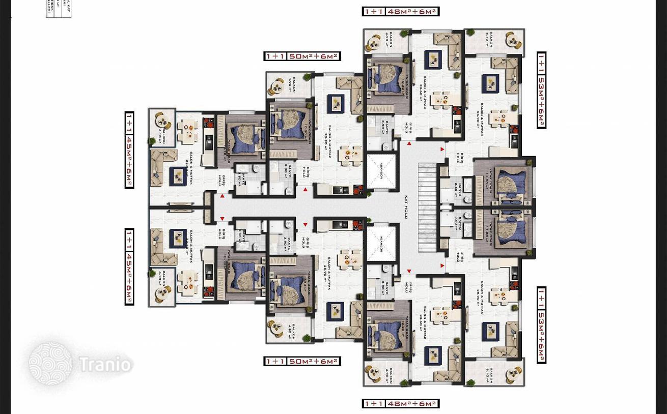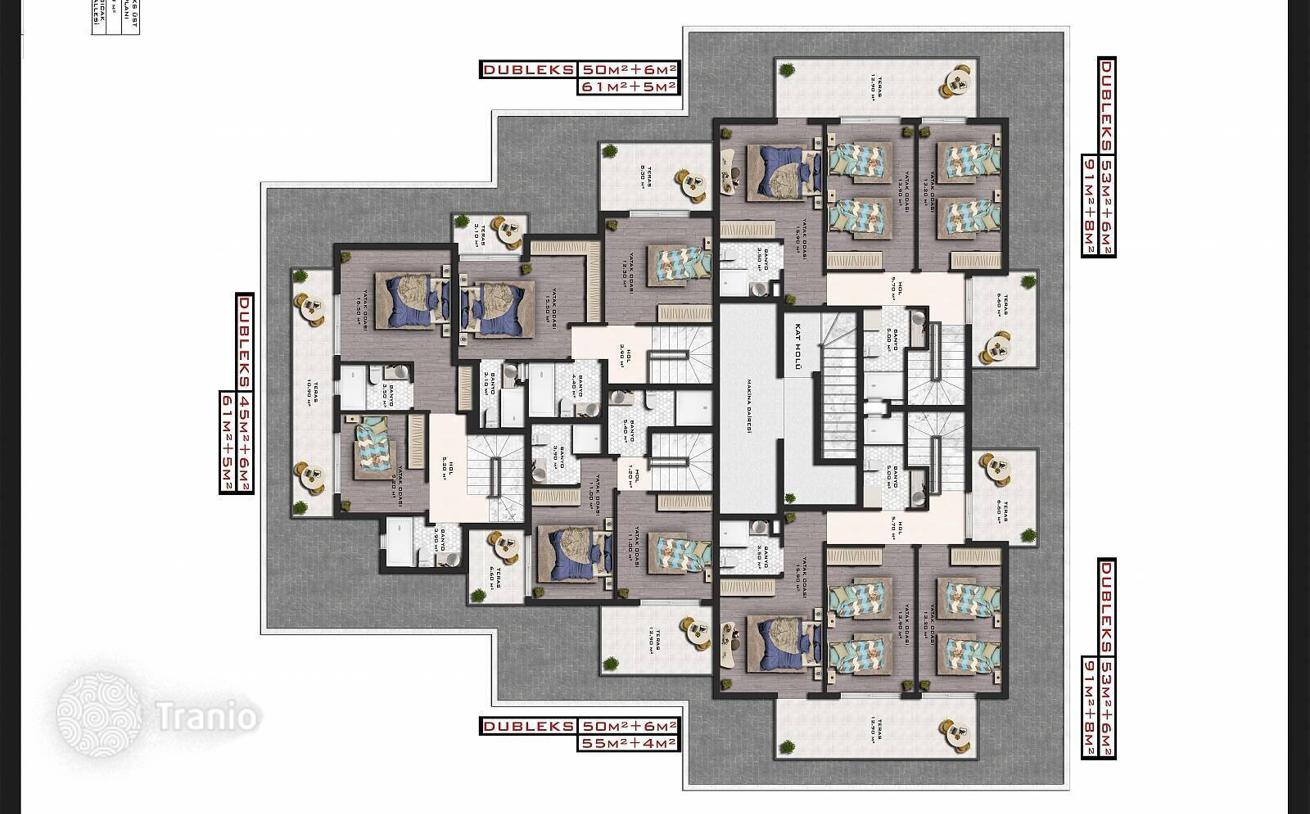 Проект с инфраструктурой 5-звездочного отеля построен на участке площадью 5423 м². Комплекс включает в себя такие удобства, как тренажерный зал, бассейн, детская площадка и общий сад. Проект состоит из квартир 1+1 на среднем этаже, а также пентхаусов 2+1 и 3+1.