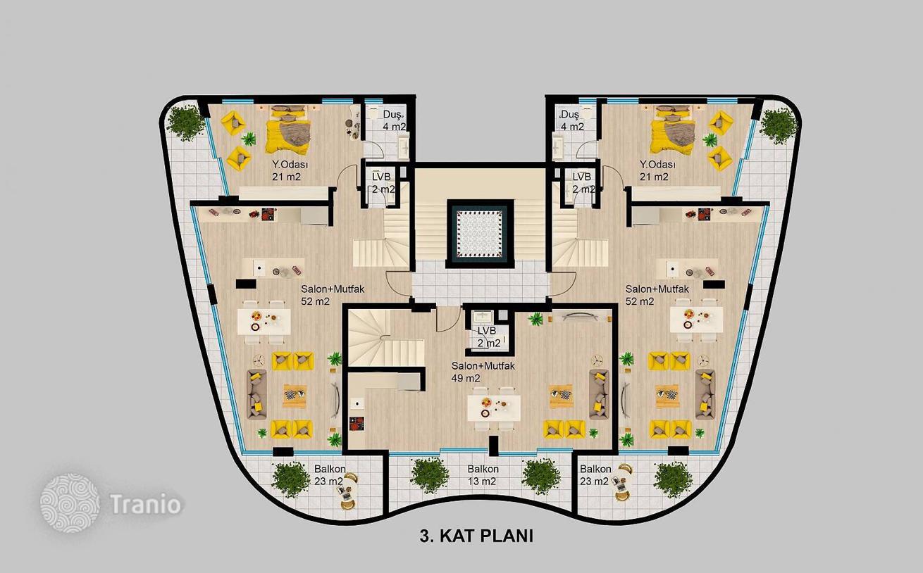 Элитная недвижимость расположена в районе Каргыджак в Алании. Алания – популярный курорт на Средиземном море, где проживает множество иностранцев. Каргыджак – хороший пример современного района с плановой застройкой и высоким потенциалом для инвестиций в недвижимость благодаря природе и великолепным пляжам. Тот факт, что он расположен в 3 км от развитого района, такого как Махмутлар, существенно упрощает доступ к основным объектам, необходимым в повседневной жизни. Комплекс, в котором находятся предлагаемые на продажу квартиры, имеет вид на море с каждого этажа.