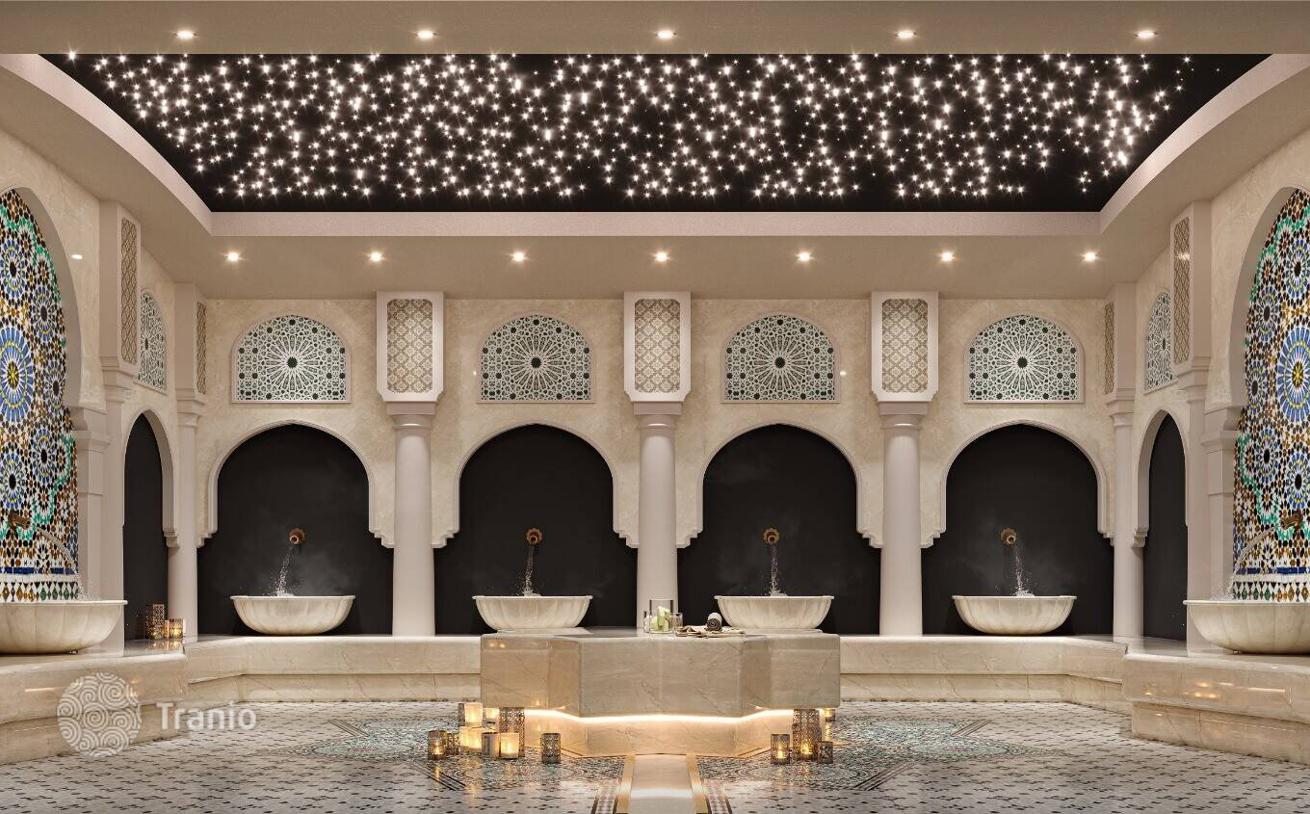 На общей территории роскошного комплекса есть крытый и открытый бассейны, спа-центр, сауна, большие сады, крытые и открытые детские игровые площадки и автостоянки.