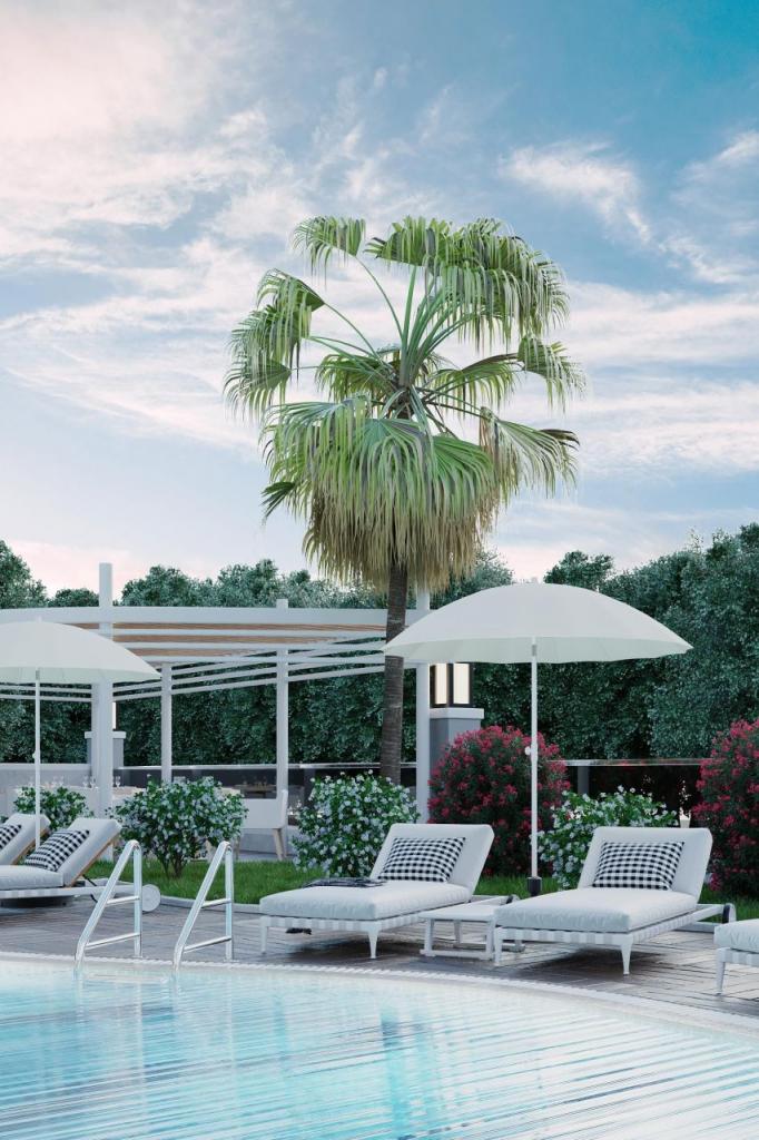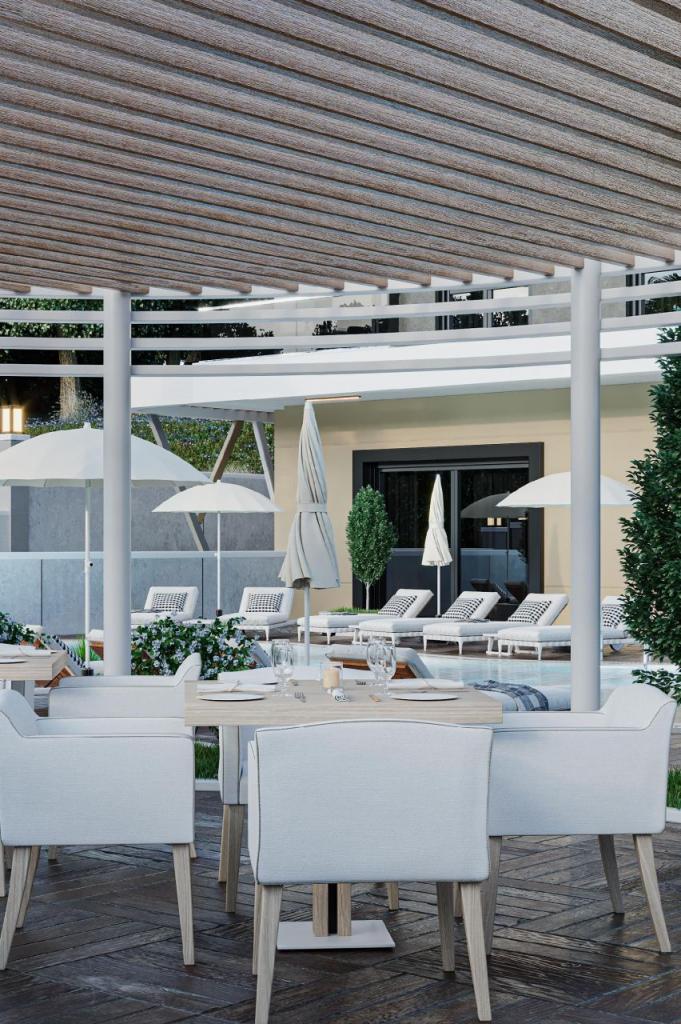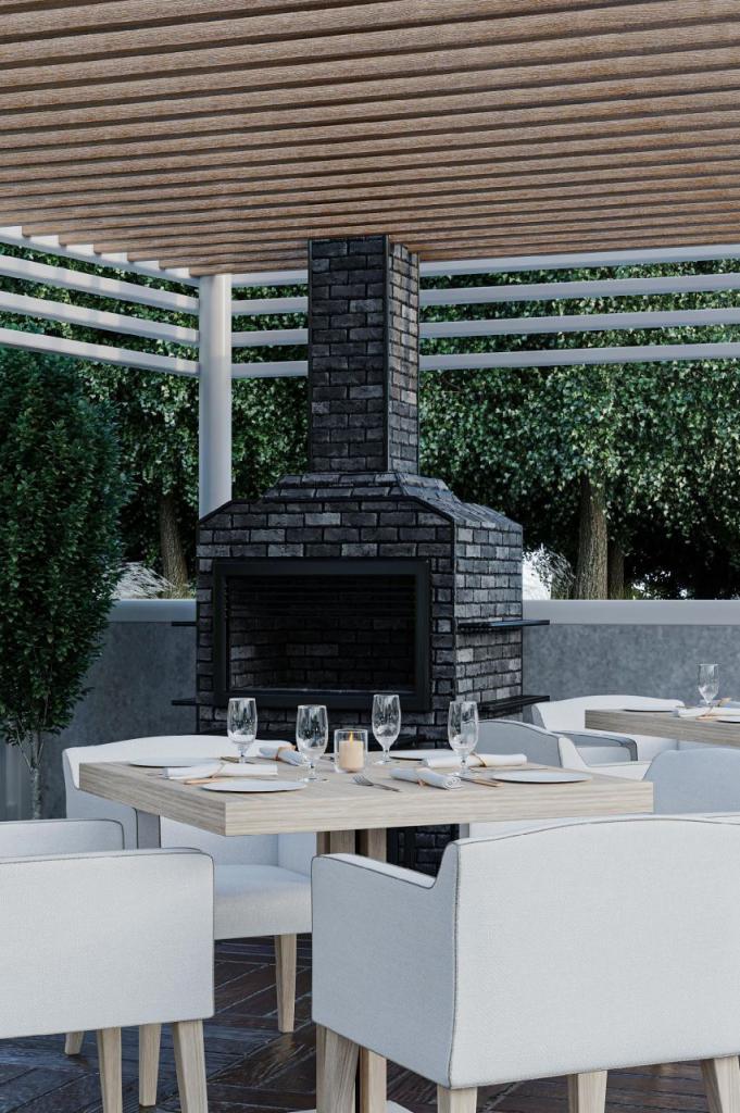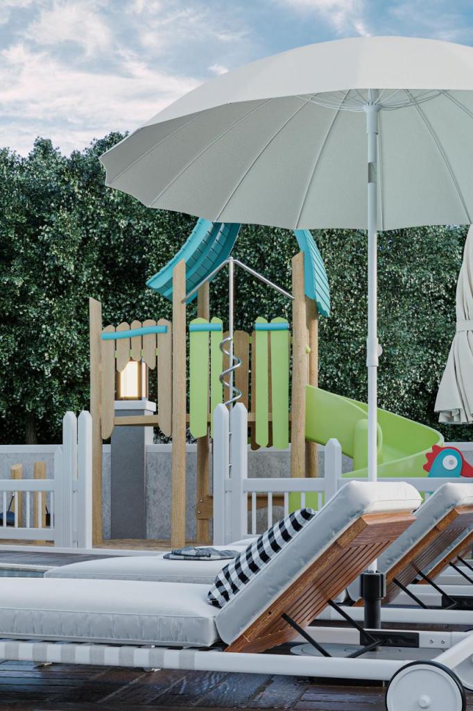 Дом оборудован всей необходимой инфраструктурой для комфортного проживания: бассейн, детские площадки, фитнес-центр.