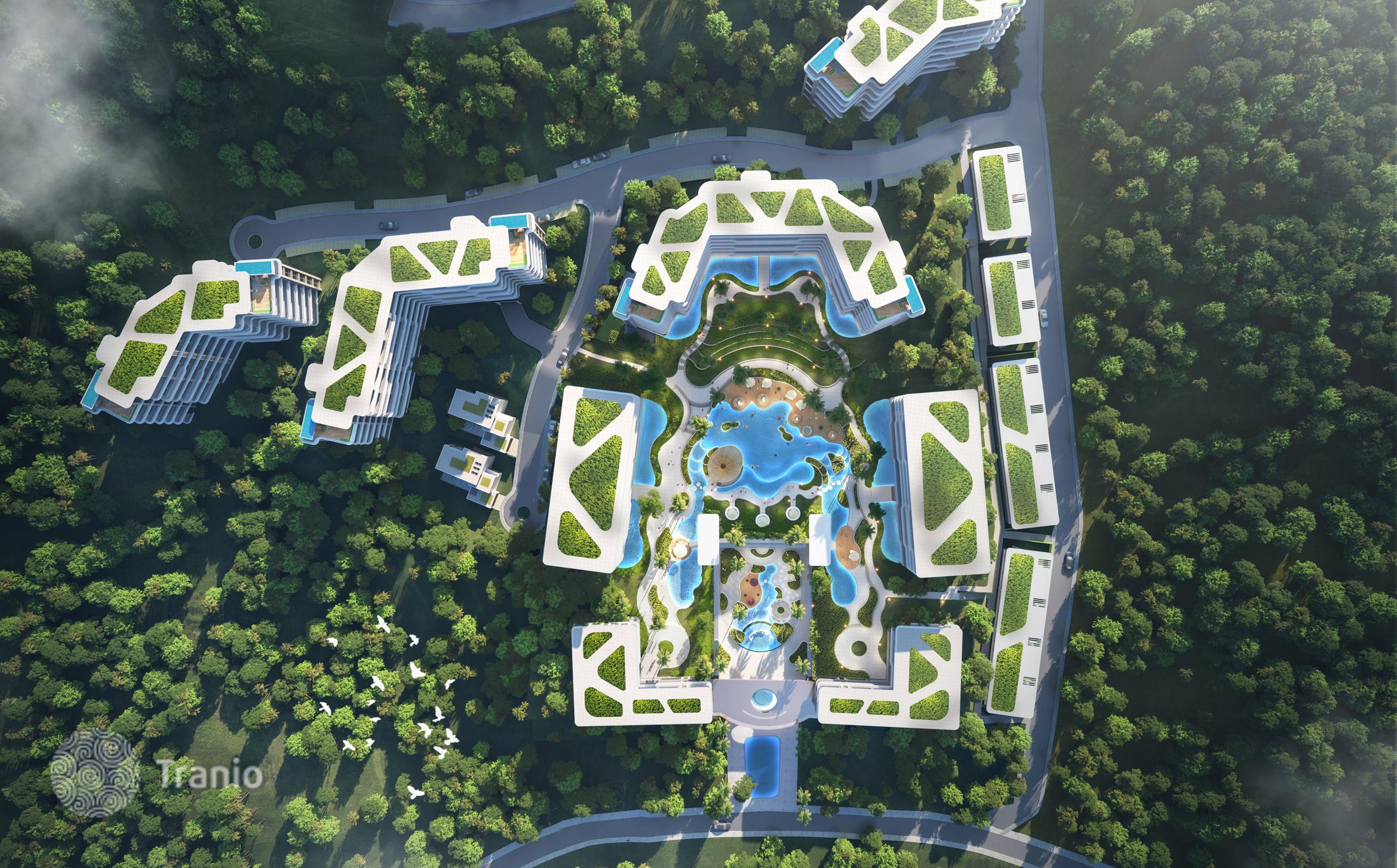 Комплекс состоит из 8 многоквартирных зданий, вилл и коммерческих помещений и располагает бассейнами, тренажёрным залом, библиотекой, зонами отдыха, садом, парковкой, рестораном.