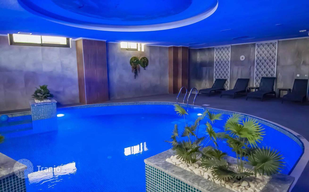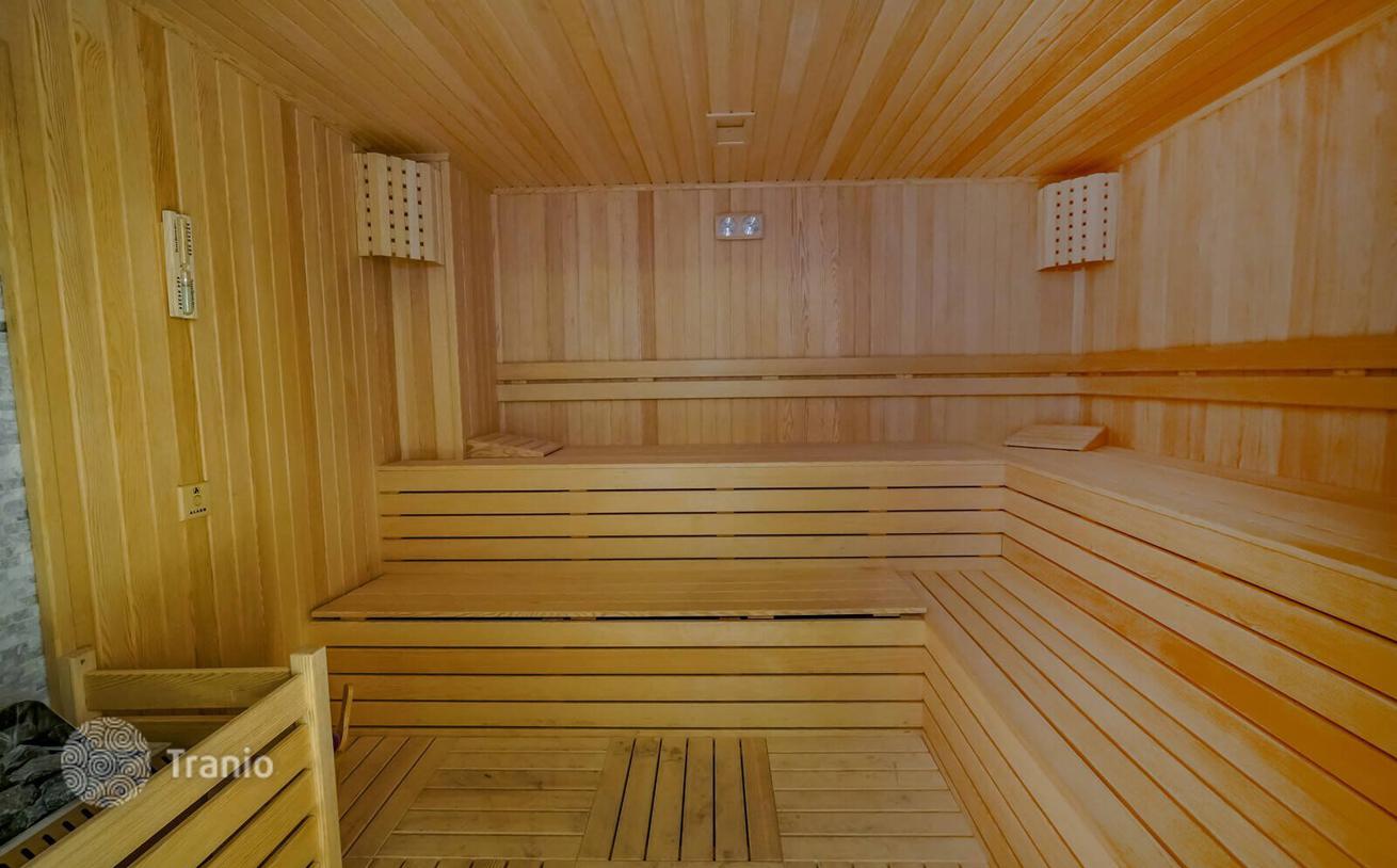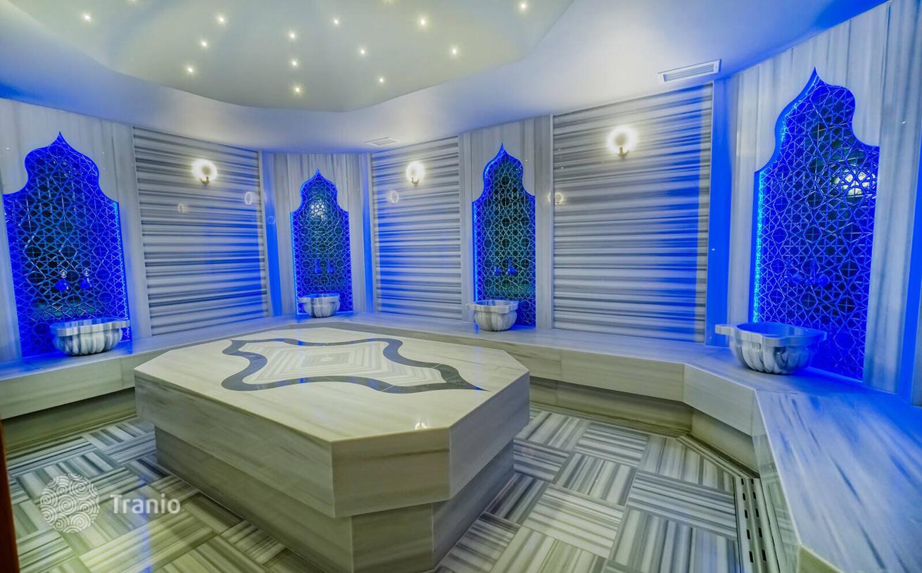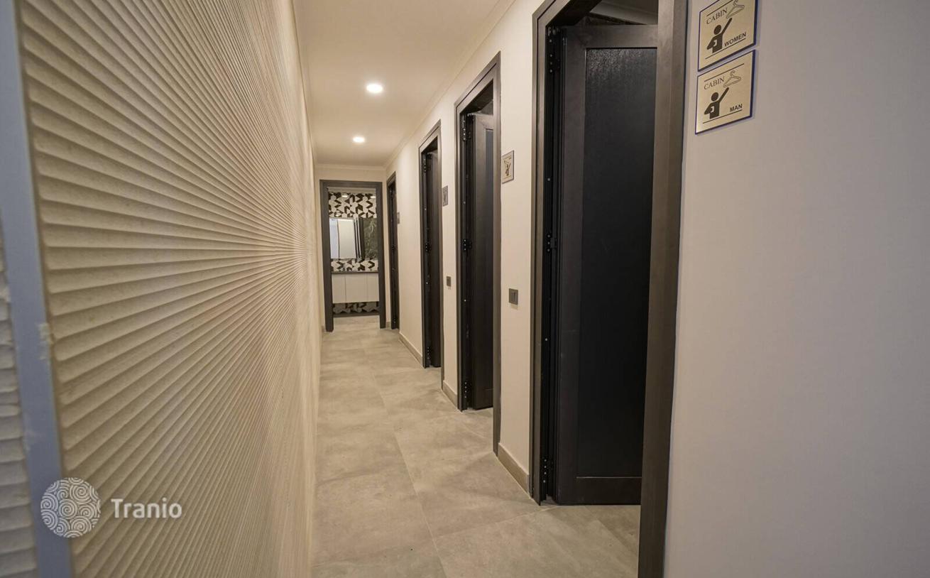 Моноблочный комплекс общей площадью 1800 м² предлагает удобства, включая открытый и закрытый бассейны, водную горку, паровую баню, сауну, турецкую баню, тренажерный зал, игровую комнату, детскую игровую комнату, открытую парковка и конференц-зал.