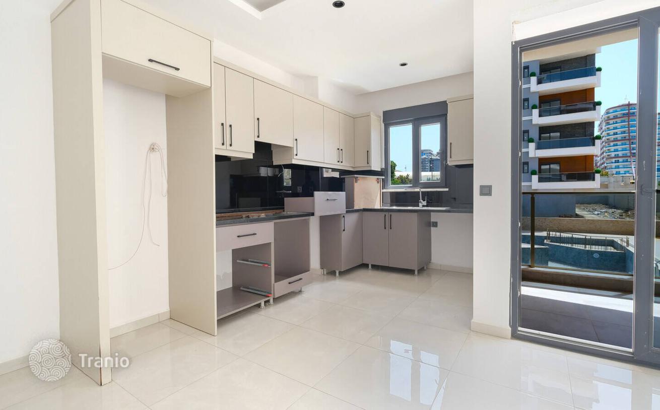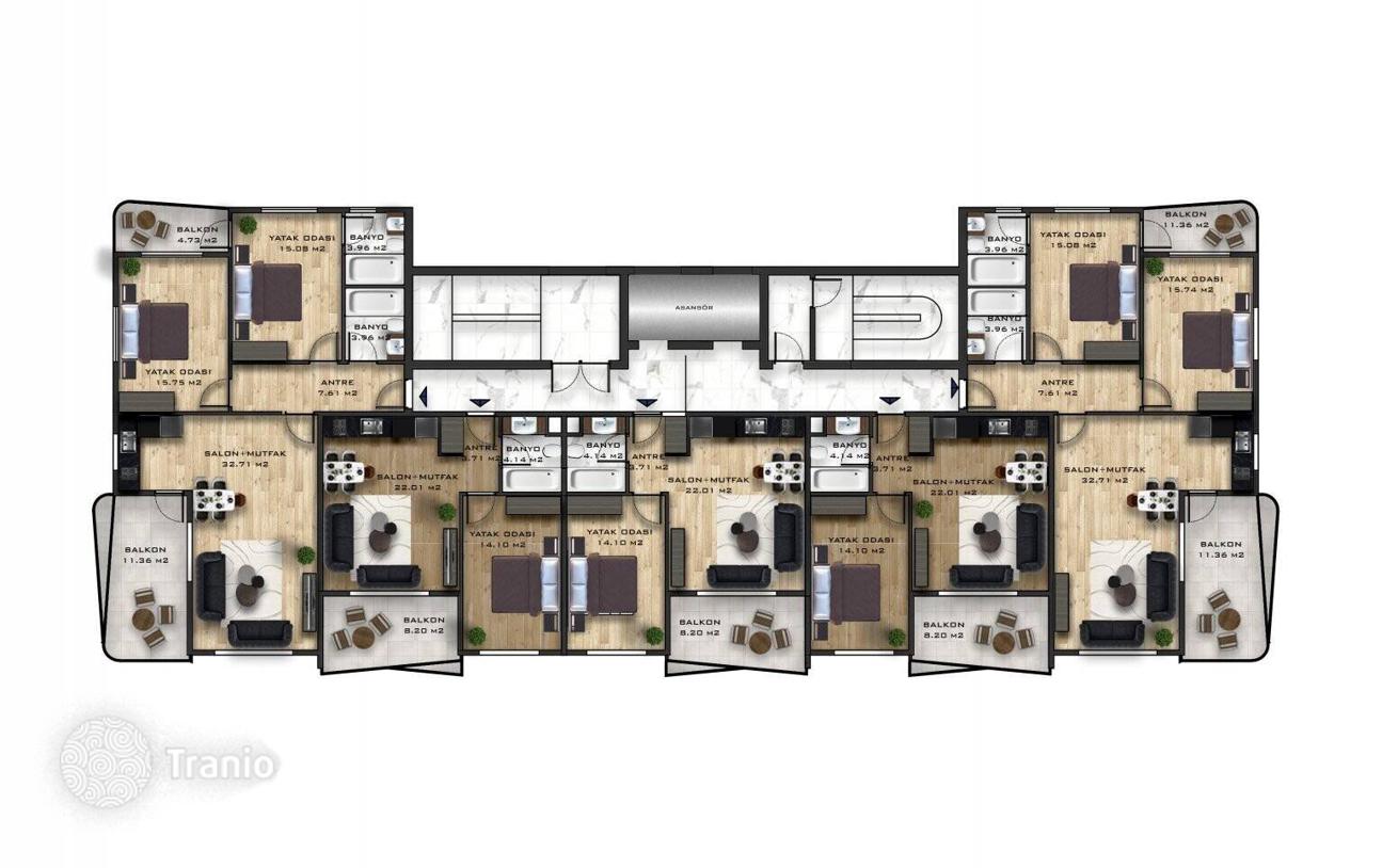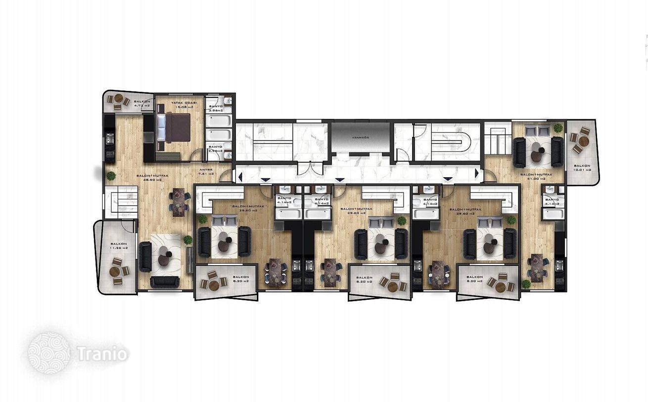 Квартиры на продажу в Махмутларе, Аланья, состоят из гостиной, кухни открытой планировки, ванной комнаты и балкона. Количество ванных комнат и балконов варьируется в зависимости от типа квартиры.