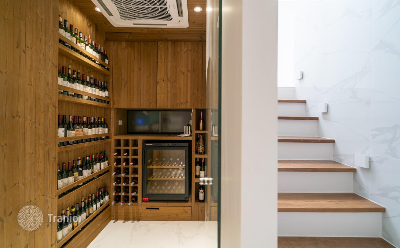 Первый этаж — гостиная с кухней и столовой, прихожая, комнаты отдыха, ванная комната, винный погреб, терраса, кладовка.