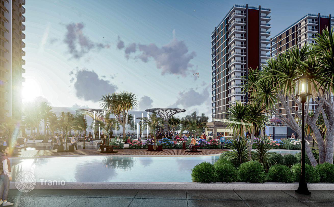 Жилой комплекс с разными зонами отдыха: кафе, рестораны, магазины, беседки, баскетбольная площадка и др.