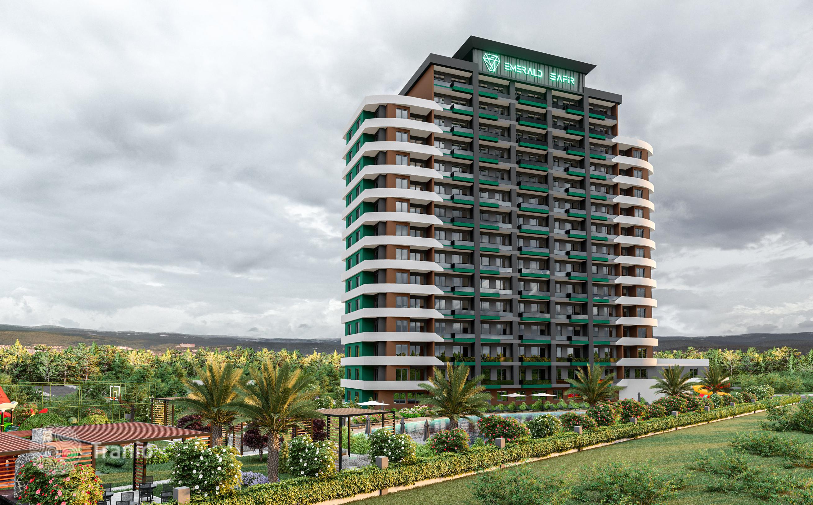В проекте жилой комплекс с различными апартаментами и зонами отдыха: плавательный бассейн, аквапарк, беседки, баскетболльная площадка и т. д.