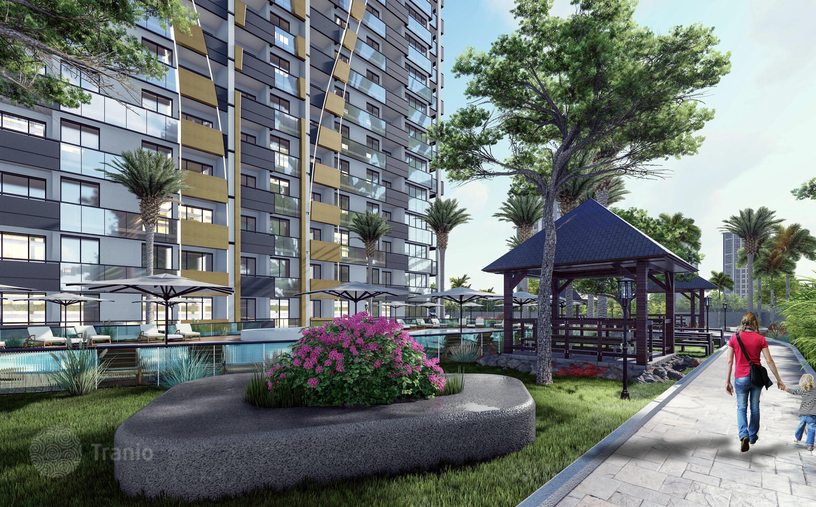 В проекте жилой комплекс с различными апартаментами и зонами отдыха: плавательный бассейн, беседки и т. д.