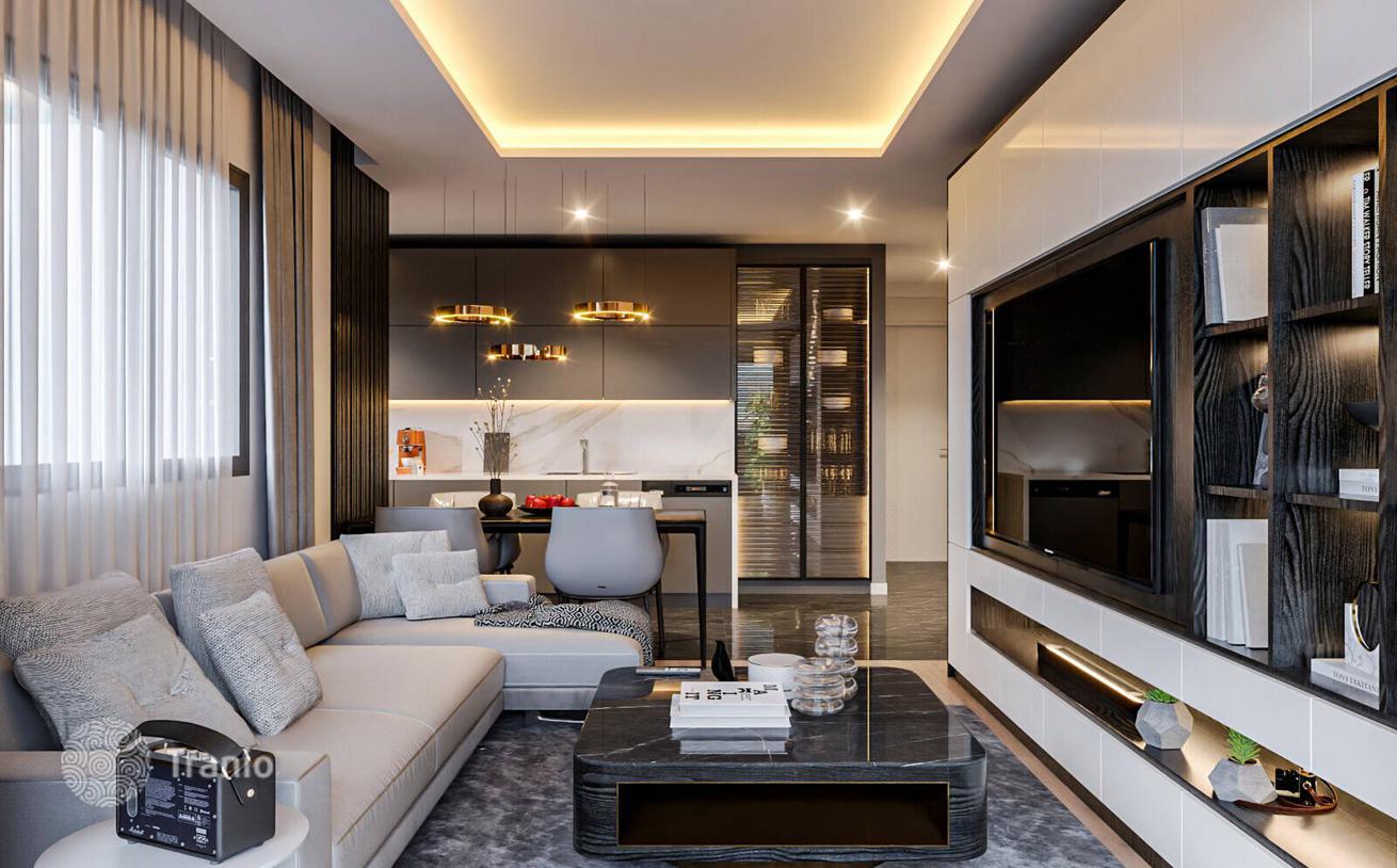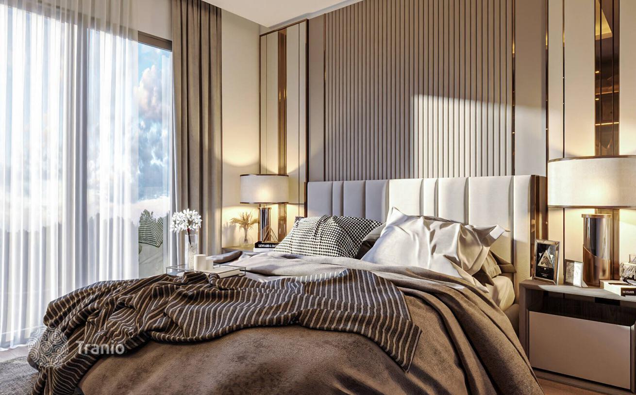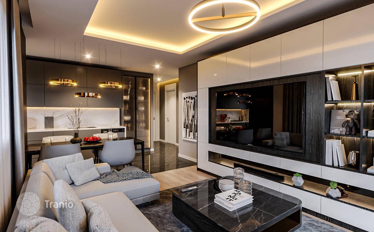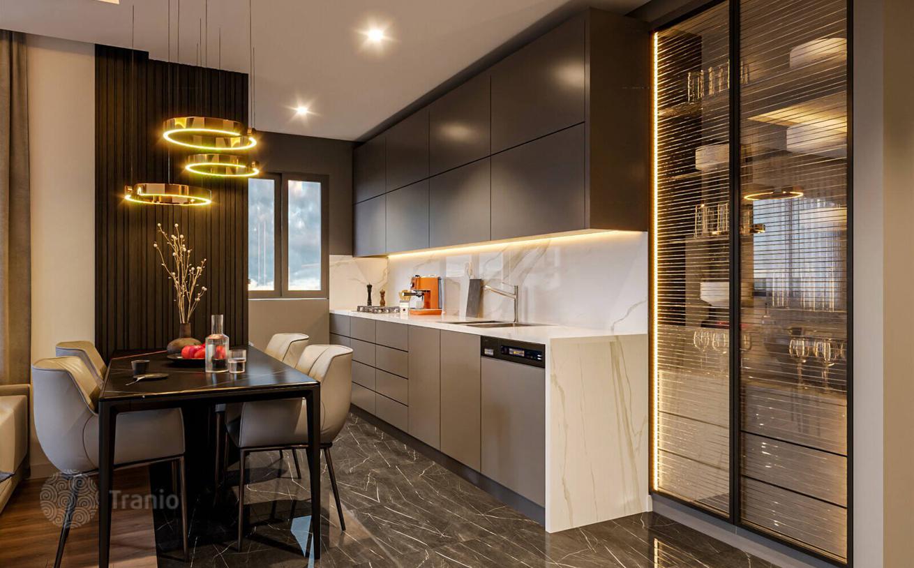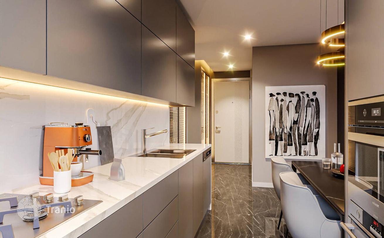 Всего в комплексе находится 94 квартиры. Недвижимость с видом на море и город оснащена такими элементами, как подвесной потолок, вешалка для одежды, ванная комната, балкон, стальная входная дверь, окна ПВХ, душевая кабина, смарт-домофон, стеклянные балконные ограждения и гранитные столешницы.