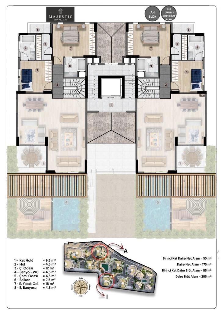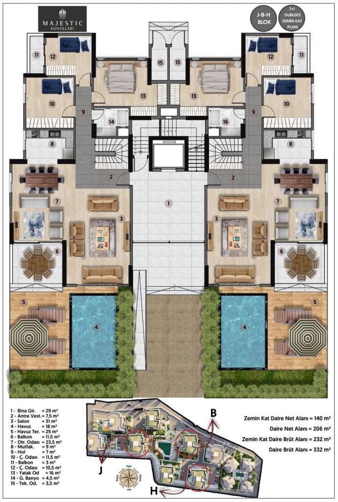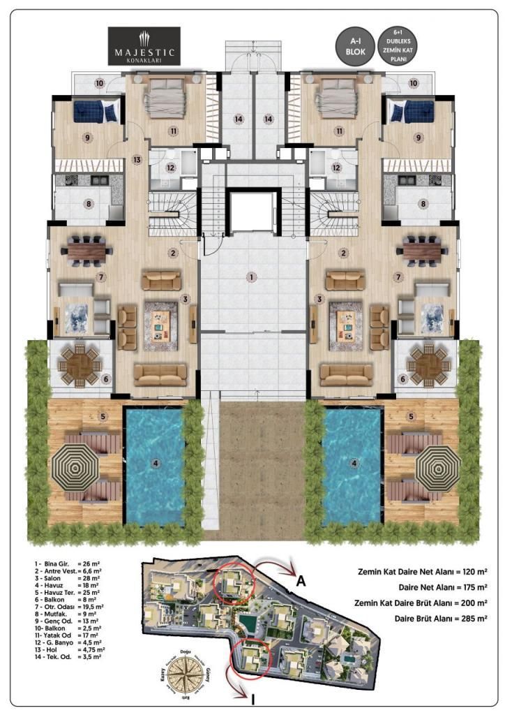 Данный объект является дуплексом, что делает его ещё более привлекательным. В доме или жилом комплексе имеется широкая инфраструктура и оснащение, включая бассейн, детские площадки, фитнес-центр, консьерж, лифт, охраняемую парковку и территорию.