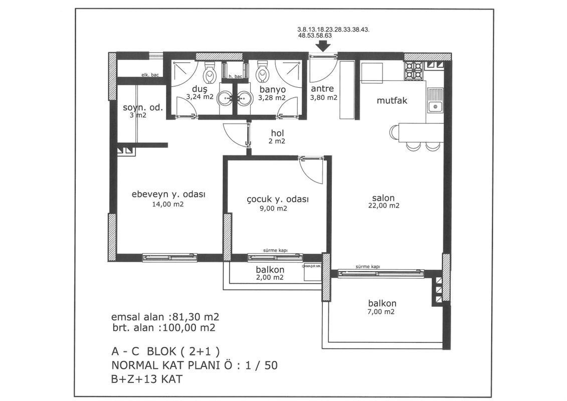 Продаю квартиру в Мерсине, расположенную у моря. Общая площадь составляет 100 кв.м. Это строящийся объект с планировкой 2+1, включающий 3 комнаты, 2 спальни и 2 санузла. Квартира расположена на 3 этаже 13-этажного дома в районе Мезитли, мкр-н Тедже, Турция.
