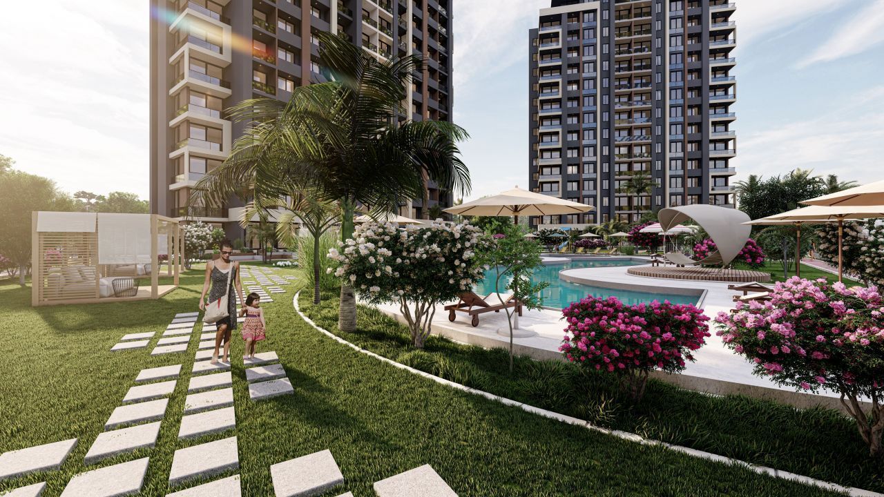 Планировка квартиры - 1+1, то есть имеется одна спальня и один санузел. Дом оборудован всем необходимым для комфортного проживания: бассейн, детские площадки, консьерж, лифт, охраняемая парковка и территория.
