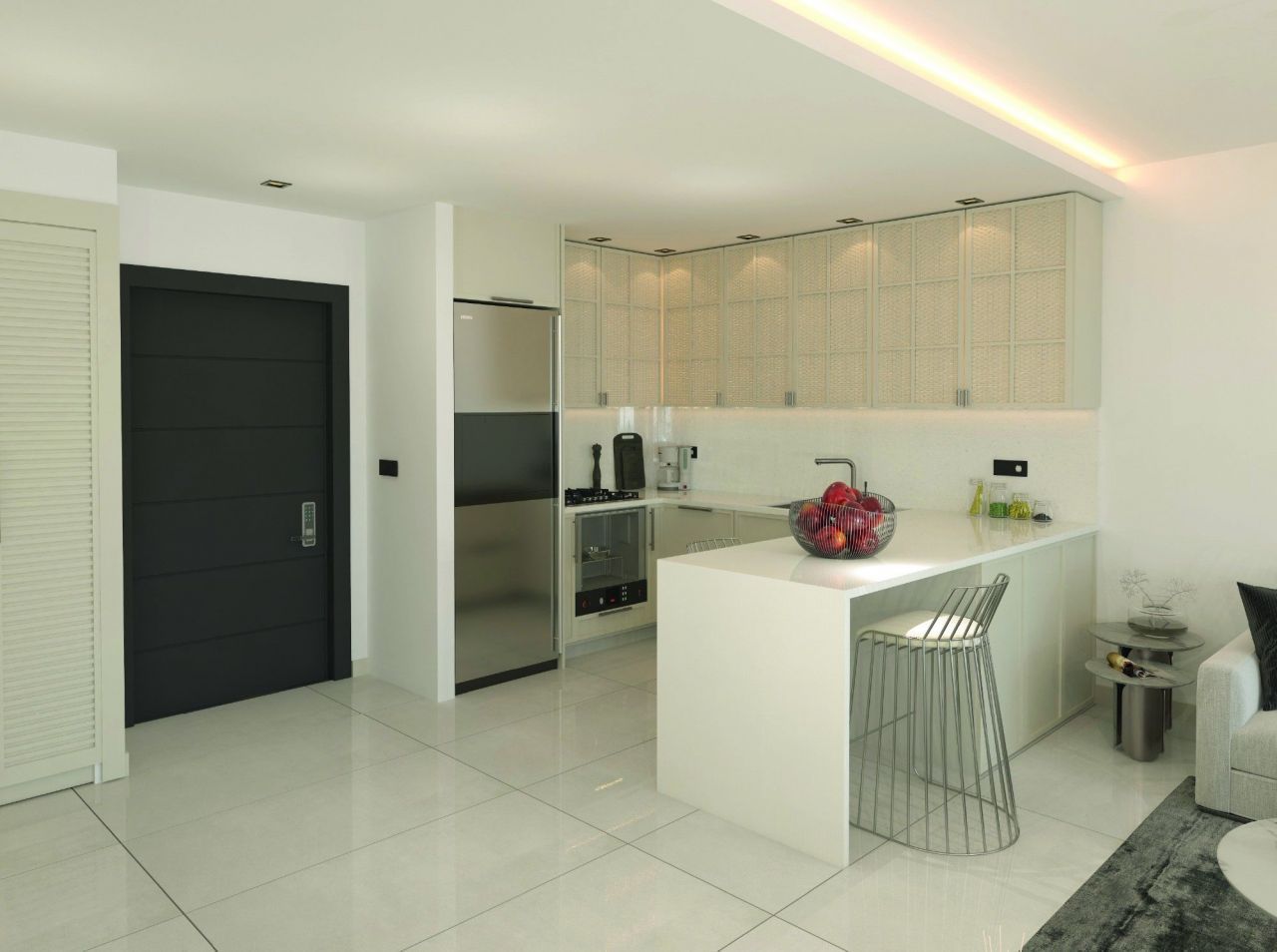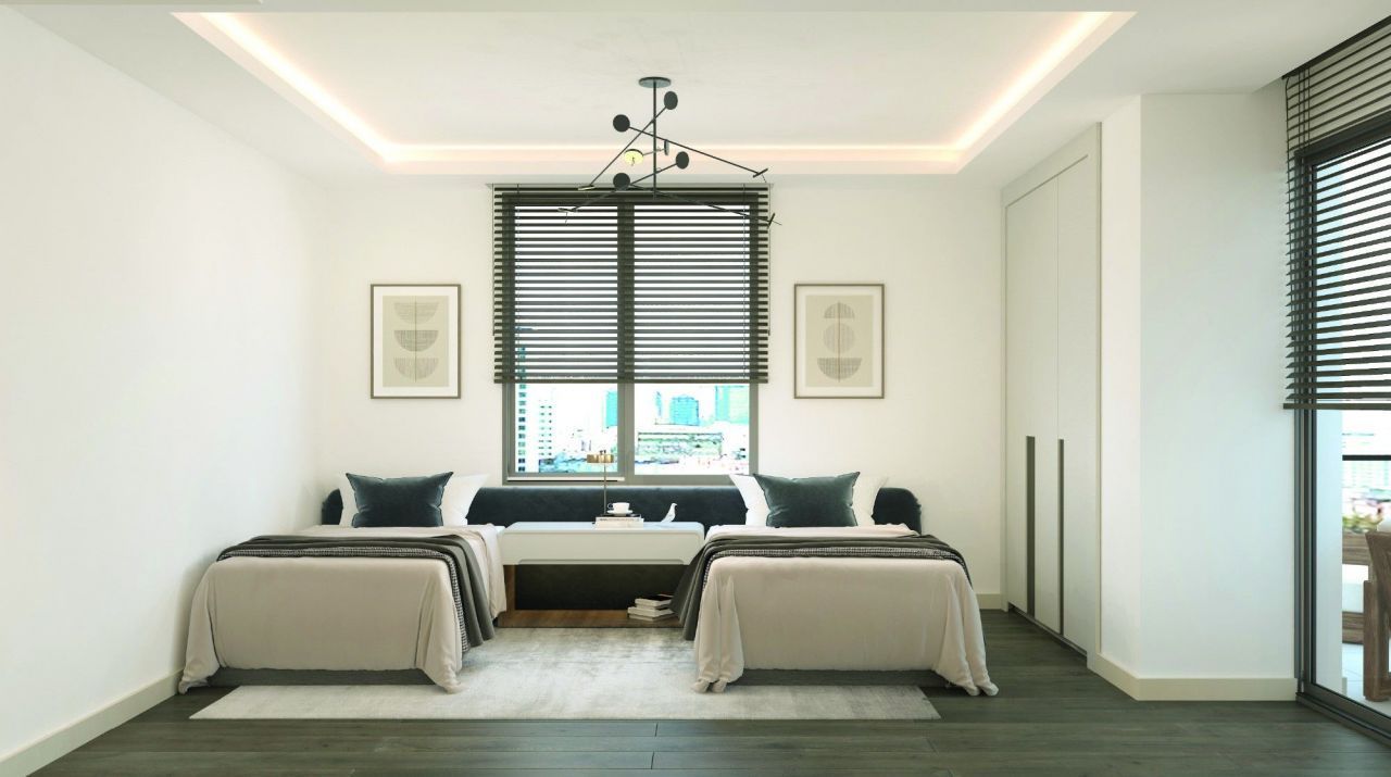 Квартира имеет планировку 1+1, что означает наличие одной спальни и одной ванной комнаты. Кроме того, в квартире есть просторная гостиная, где можно уютно проводить время с семьей и друзьями.