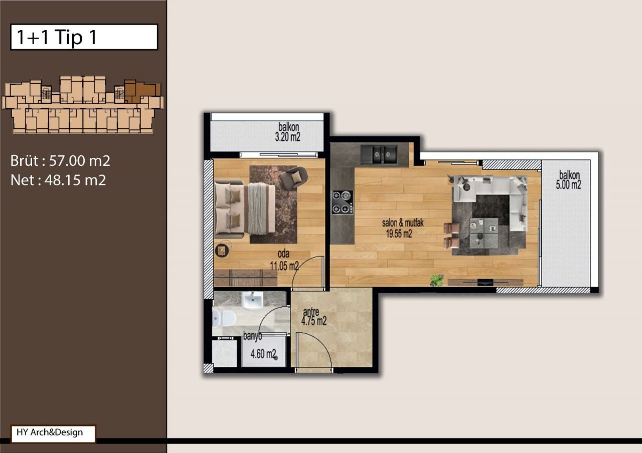 Площадь данного объекта составляет 43 квадратных метра, что делает его идеальным вариантом для одного или двух человек. Планировка 1+1 предусматривает наличие одной спальни и одной ванной комнаты.