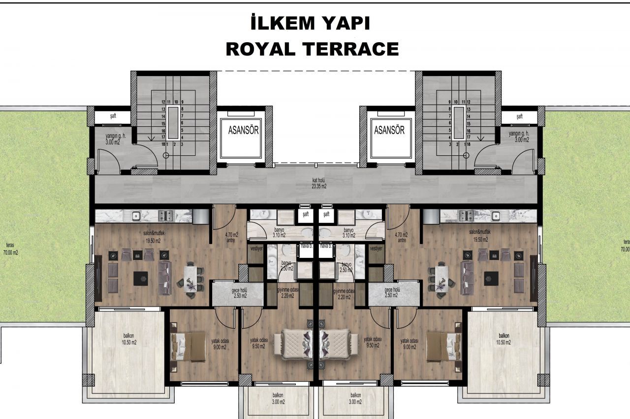 Продаётся просторная двухспальная квартира в Мерсине, Турция. Общая площадь составляет 74 квадратных метра. Этаж первый, в доме 14 этажей. Квартира имеет планировку 2+1, то есть две спальни и одну гостиную. Всего в квартире три комнаты и две ванные комнаты.