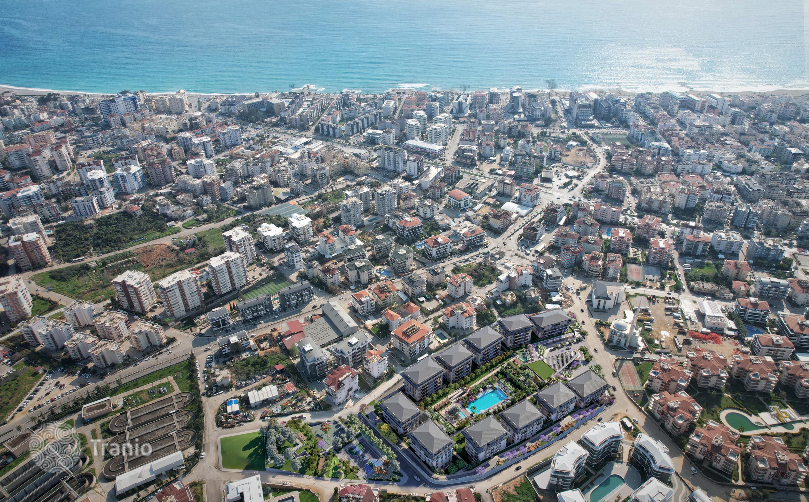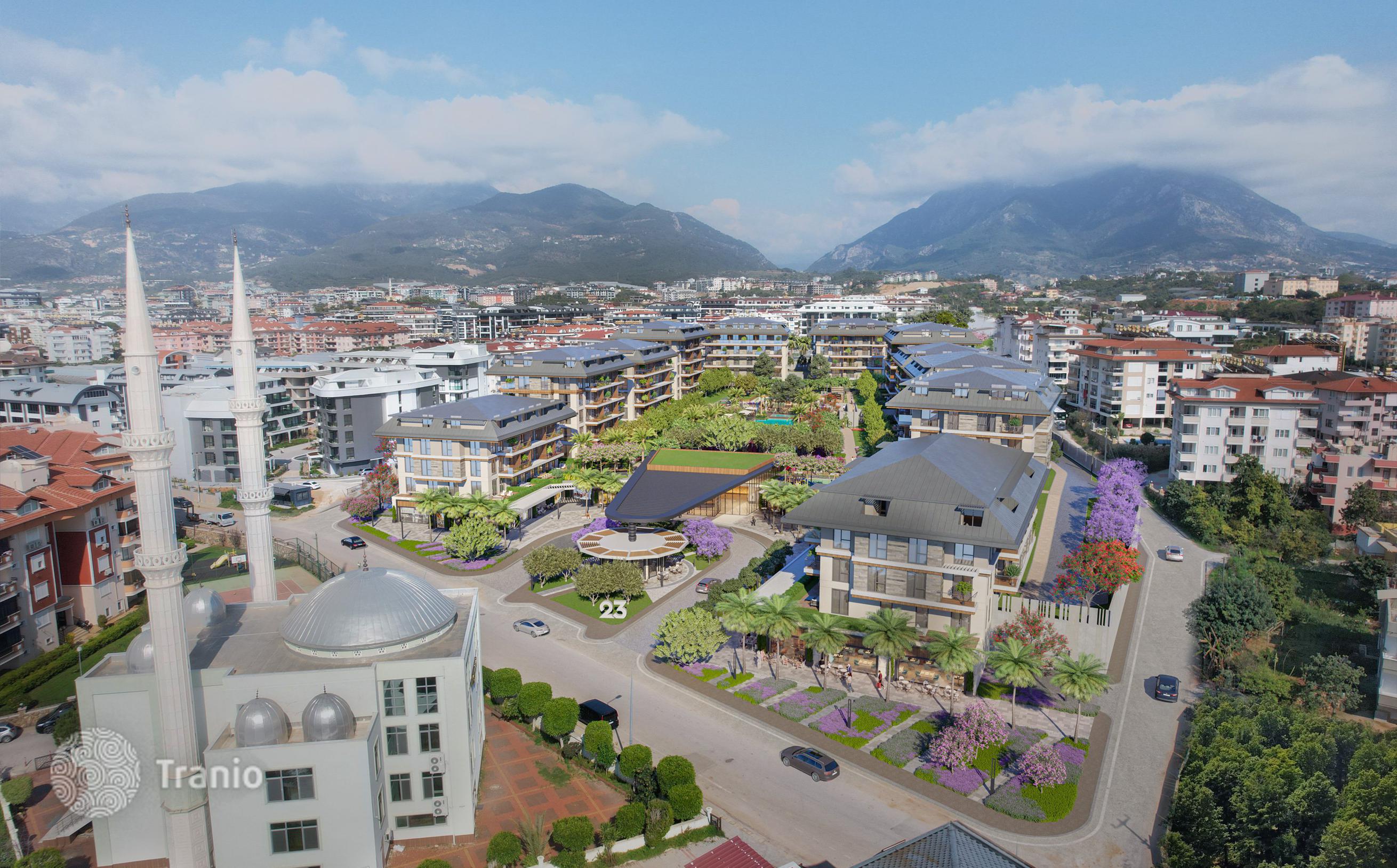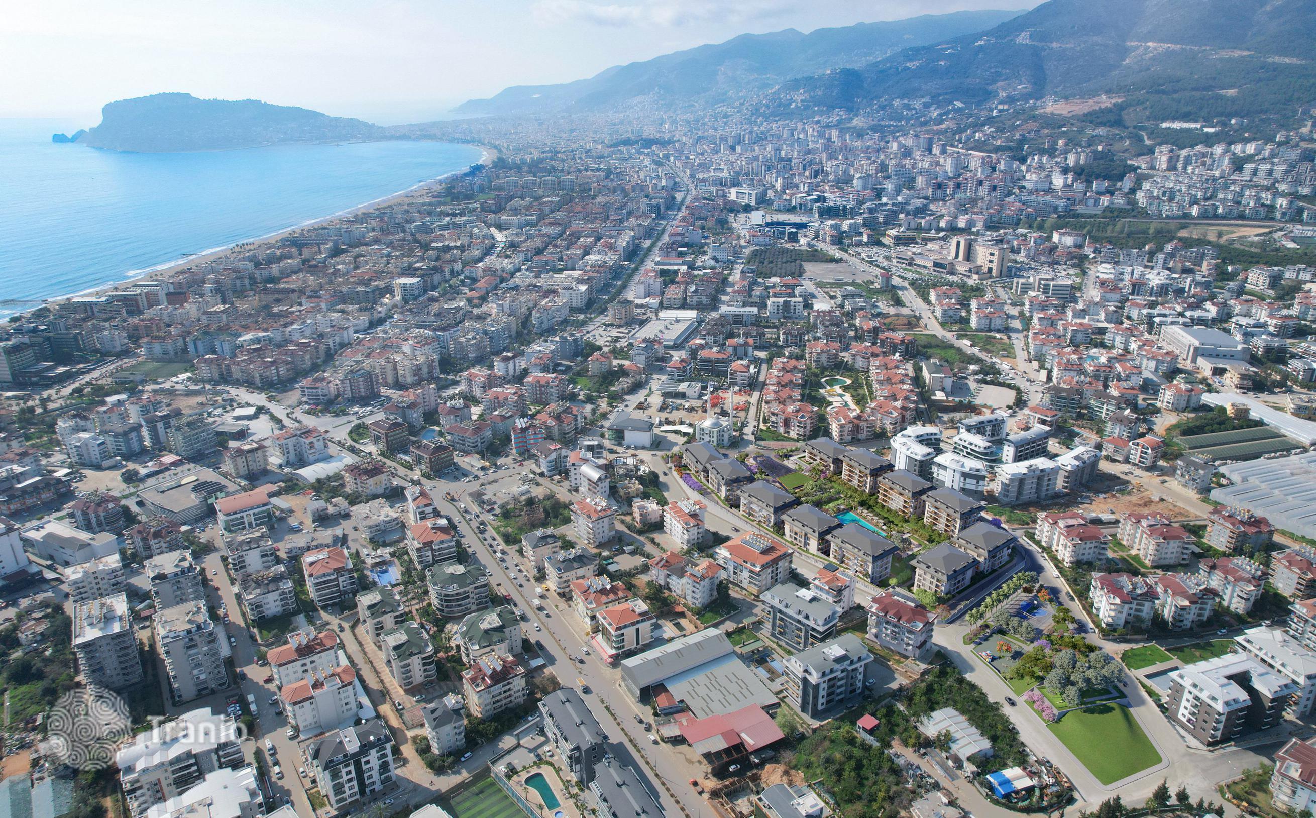 Комплекс-остров: с трех сторон окружен дорогой и с одной стороны главная улица в районе Оба. 95% квартир имеют открытый вид, расстояние до ближайшего противоположного блока составляет 55 метров.