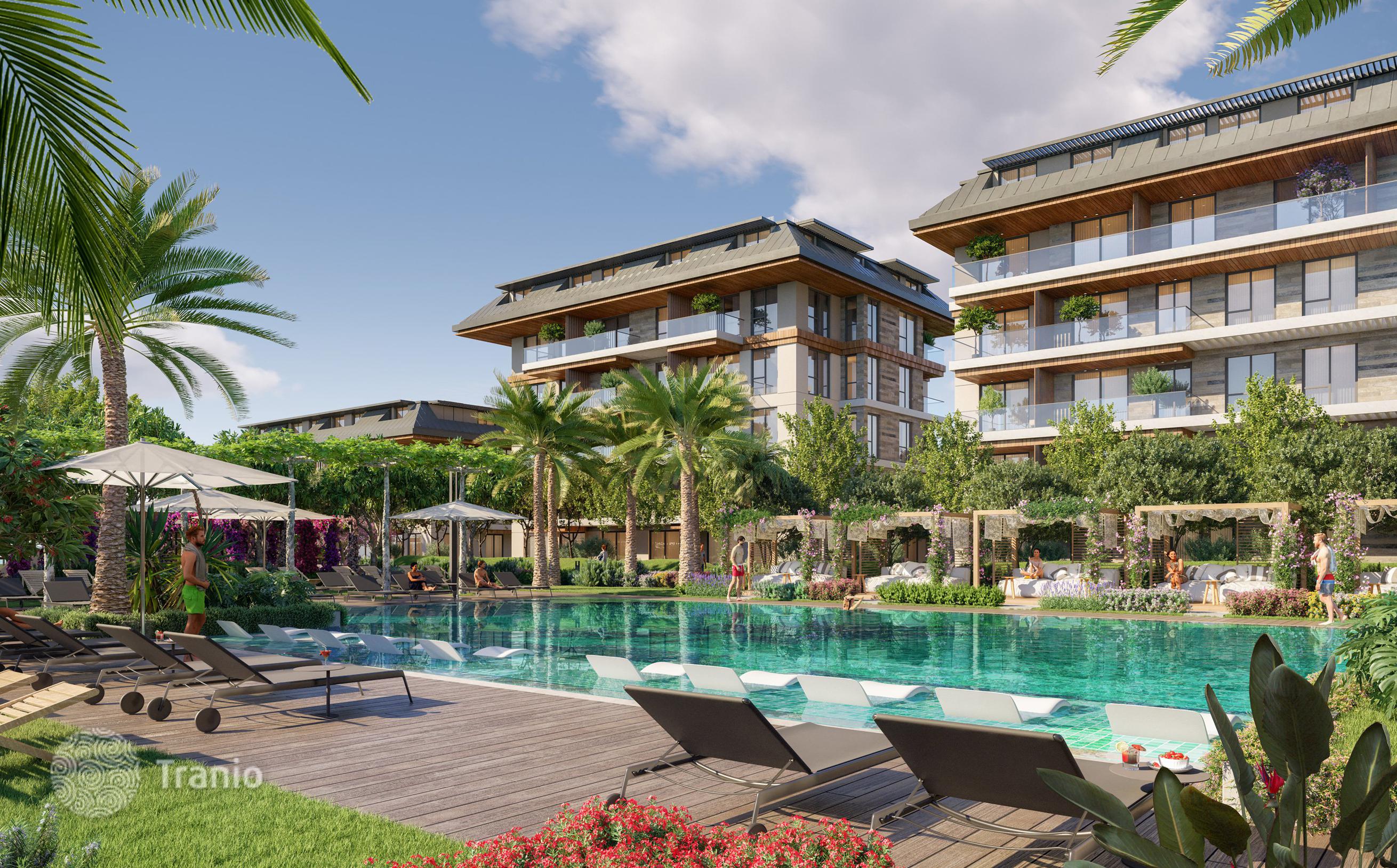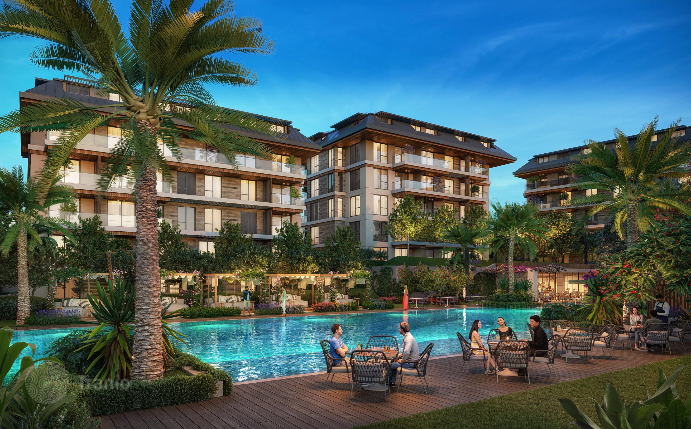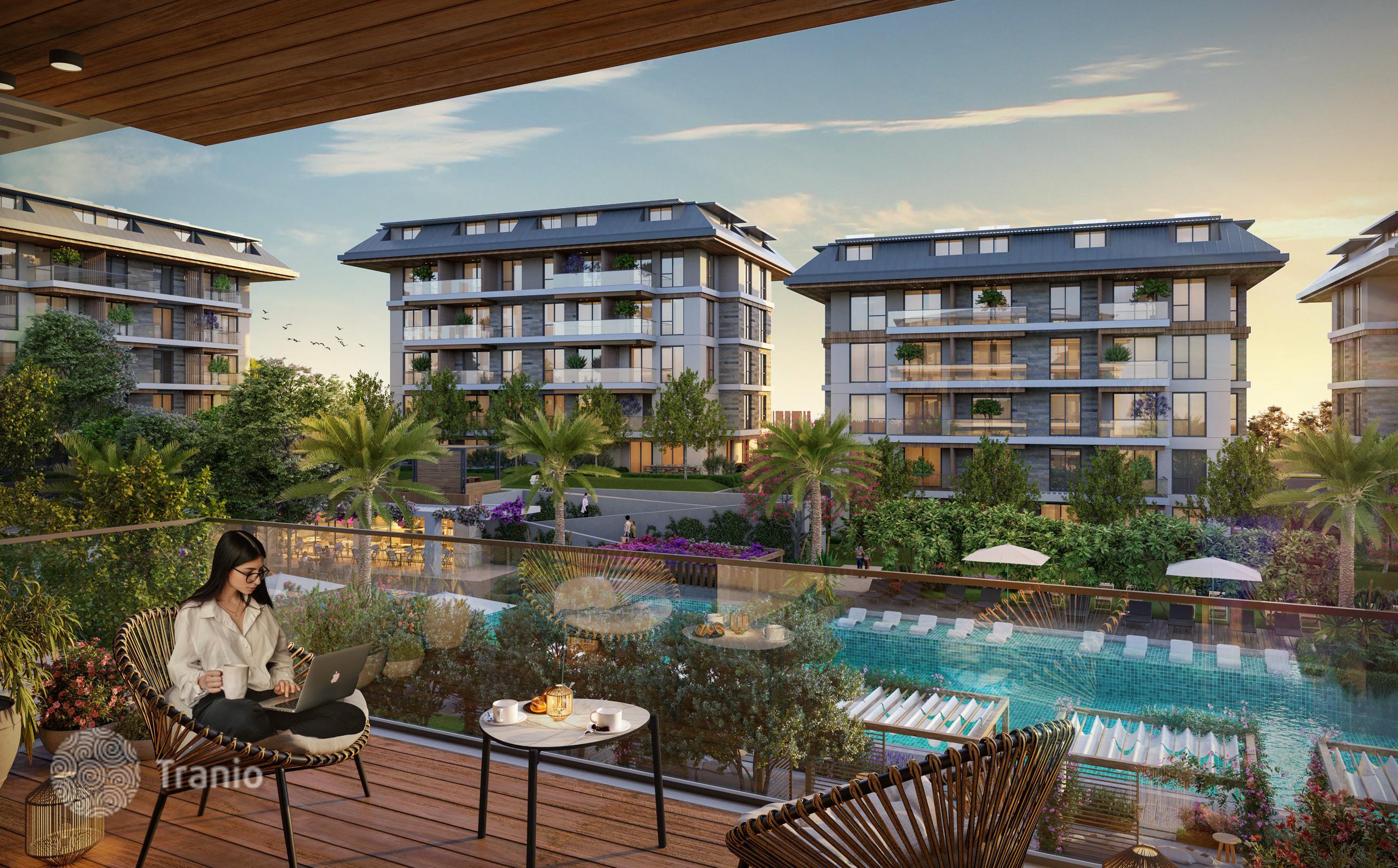 Комплекс-остров: с трех сторон окружен дорогой и с одной стороны главная улица в районе Оба. 95% квартир имеют открытый вид, расстояние до ближайшего противоположного блока составляет 55 метров.