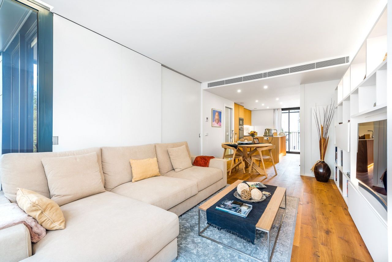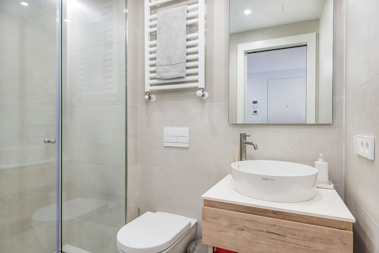В квартире есть 2 спальни, 2 ванные комнаты, одна из которых ванная, и гостиная с кухней открытого плана. Кроме того, есть 2 террасы, а также большие окна в спальнях и гостиной.