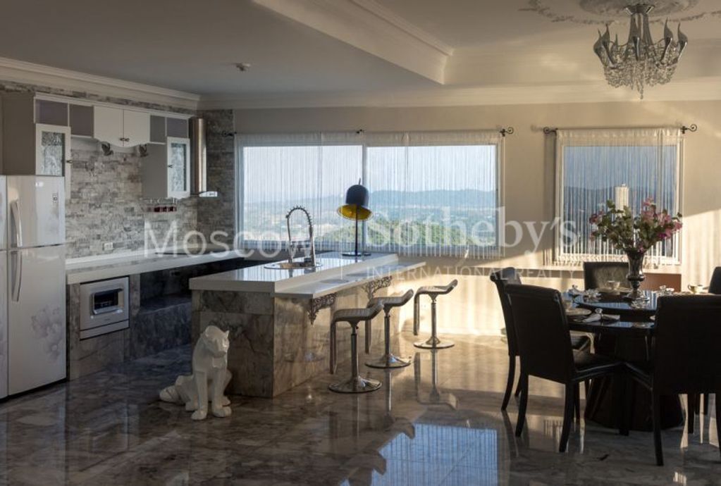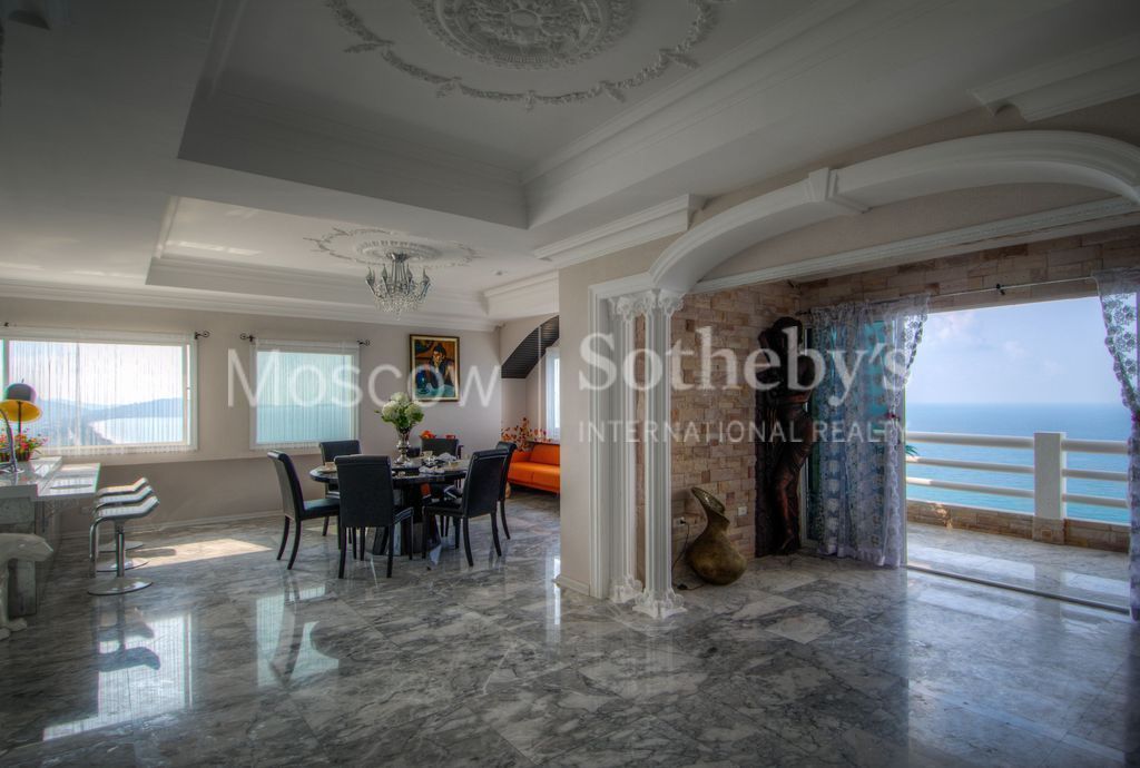 Гостиная : вид на горы, океан, остров Самет. Стены и пол (все полы в квартире выполнены из мрамора, что создает прохладу) выполнены из 3-х сортов итальянского мрамора. Кухня с *островом*, столовая часть с мраморным столом на 6 персон и мягкие диваны. Из этой комнаты выход в уголок отдыха помещение украшает скульптура из красного дерева , выполненная вручную из цельного куска дерева. Вид на океан и национальный парк.