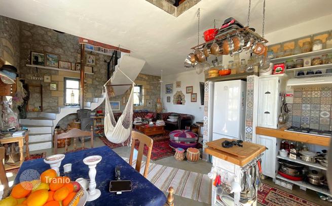Между горами и морем продается каменный дом. Дом состоит из двух уровней, общей площадью 75 м². К нему примыкает красивая терраса с видом на ущелье в сторону моря. К услугам гостей тенистая беседка, увитая виноградными лозами, с зоной барбекю и печью для пиццы. Дом дополняет красивый зрелый сад, полный деревьев, кустарников и вьющихся растений со всех сторон. На участке также растет около 200 продуктивных оливковых деревьев. Расположение этого дома просто уникально: оно предлагает моменты беззаботного отдыха и панорамный вид на бескрайнюю синеву. Кроме того, недвижимость расположена на отличном участке площадью 14 500 м², с разрешением на строительство общей площадью 340 м², из которых 75 были использованы под существующий дом. Таким образом, есть потенциал для строительства еще двух зданий общей площадью 265 м². Имеющиеся разрешения на строительство предусматривают строительство большого дома площадью около 200 м² в привилегированном положении участка и небольшого гостевого дома. Земляные работы, подземный дренаж и септики, а также бетонный фундамент для большого дома были завершены, а также были созданы ландшафтный дизайн и сады с огородом и фруктовыми деревьями, такими как инжир, гранат, цитрусовые, миндаль и груши. Также завершено благоустройство и задней стены небольшого гостевого дома. Камень для завершения этих двух домов уже куплен и находится на участке.