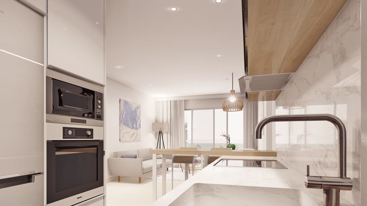 Просторная квартира на верхнем этаже площадью 283,02 кв.м. состоит из трех спален, двух ванных комнат, просторной гостиной с открытой кухней, солярия площадью 96,4 кв. м., просторной террасы 85,8 кв.м., на которой можно любоваться шикарными видами с бокалом вина, а также установить джакузи и барбекю.