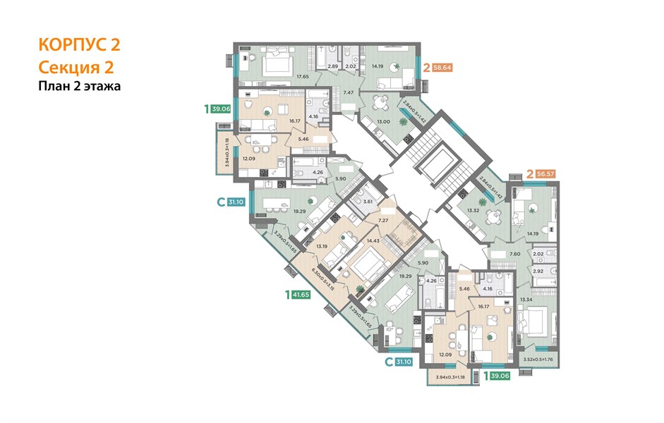 Квартира: 2 к 58,64 кв.м., 2 этаж в комплексе Сады у моря, 2 очередь, корп.2, сдача: 3кв. , этажей: 8, адрес Темрюк г., Дальняя ул., д. 30, Застройщик: ГК Каскад.