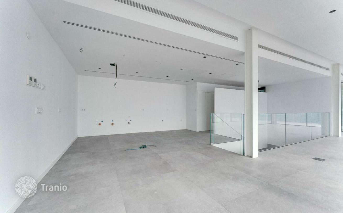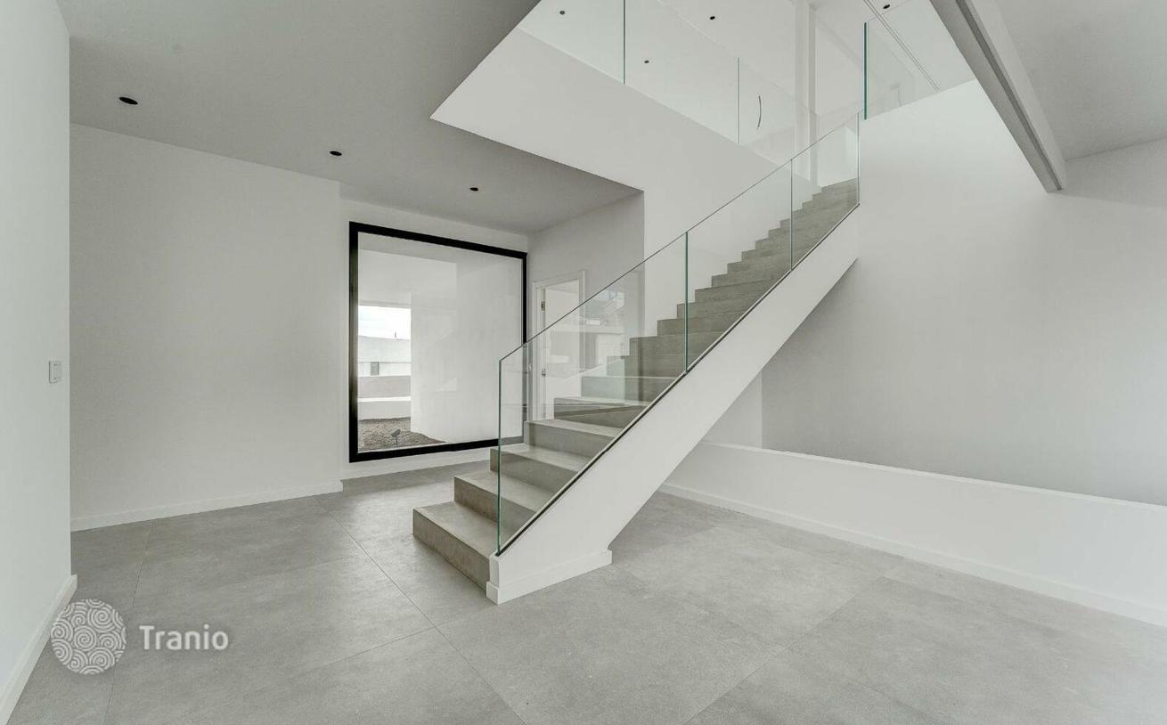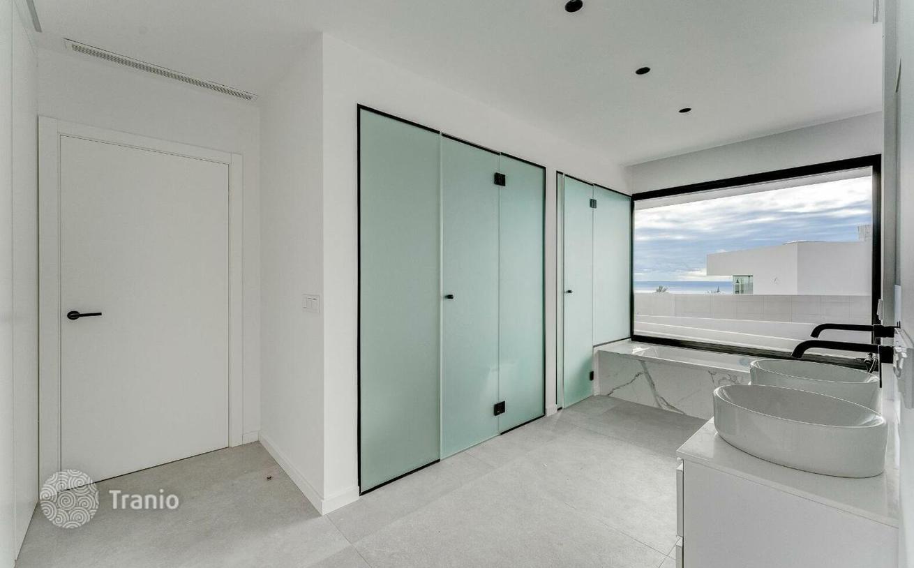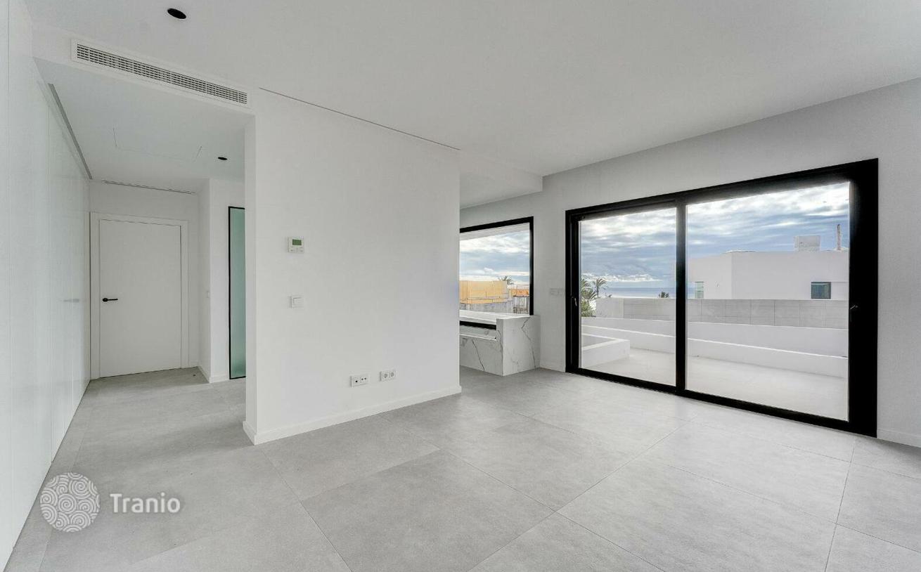 Красивая лестница из бетона и стекла ведет на верхний этаж, большое открытое пространство с кухней открытой планировки и большой гостиной-столовой с выходом в зону солярия с бассейном и террасой с видом на поле для гольфа и море. На этом этаже также имеется кладовая и гостевой туалет.